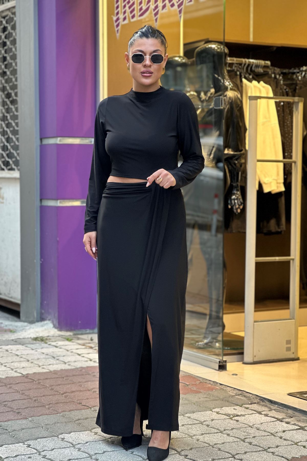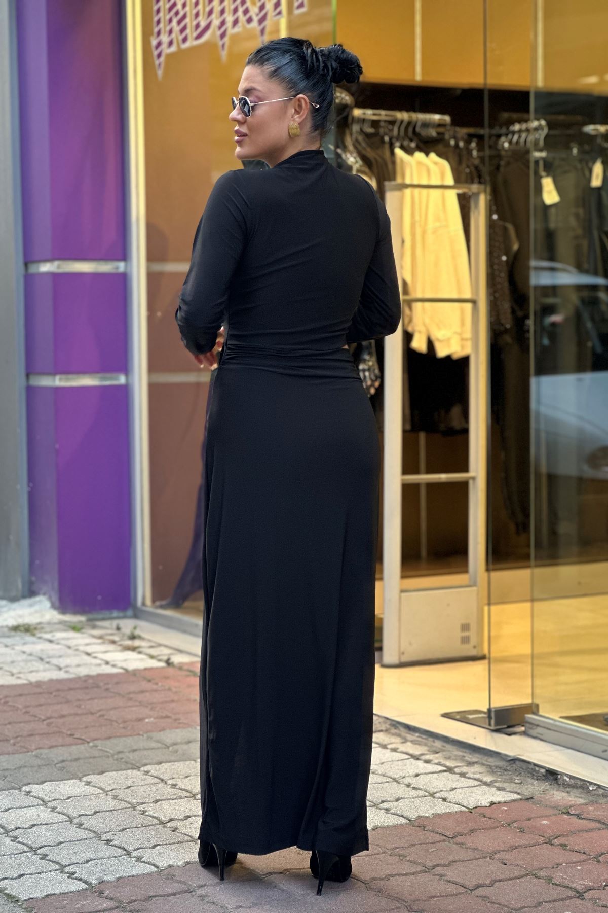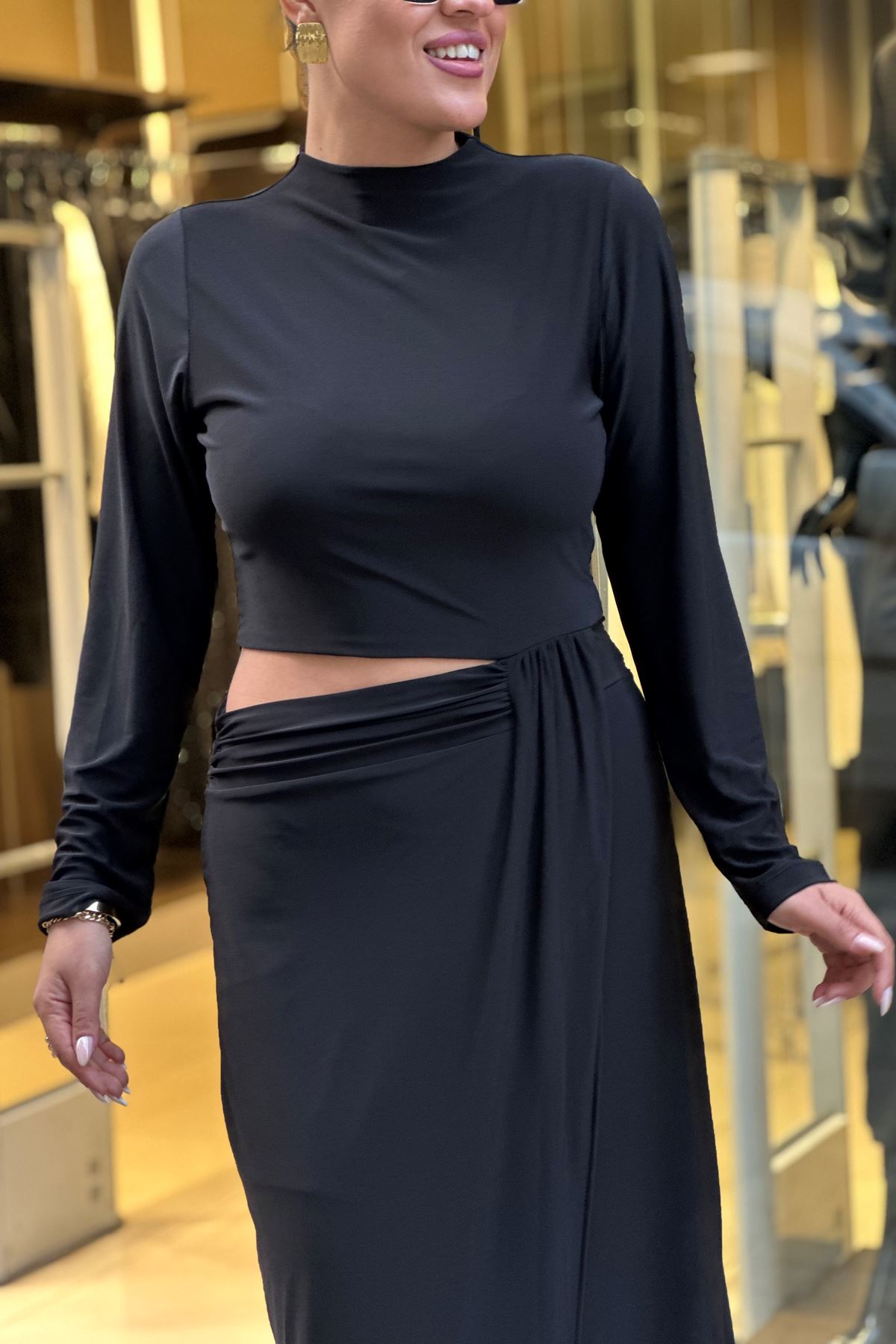 Bel Açık Yırtmaclı Midi Boy Elbise-Siyah
