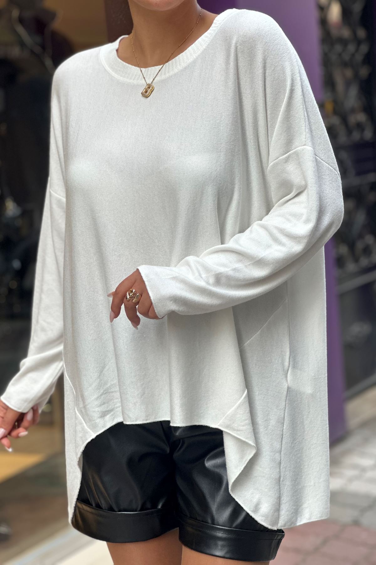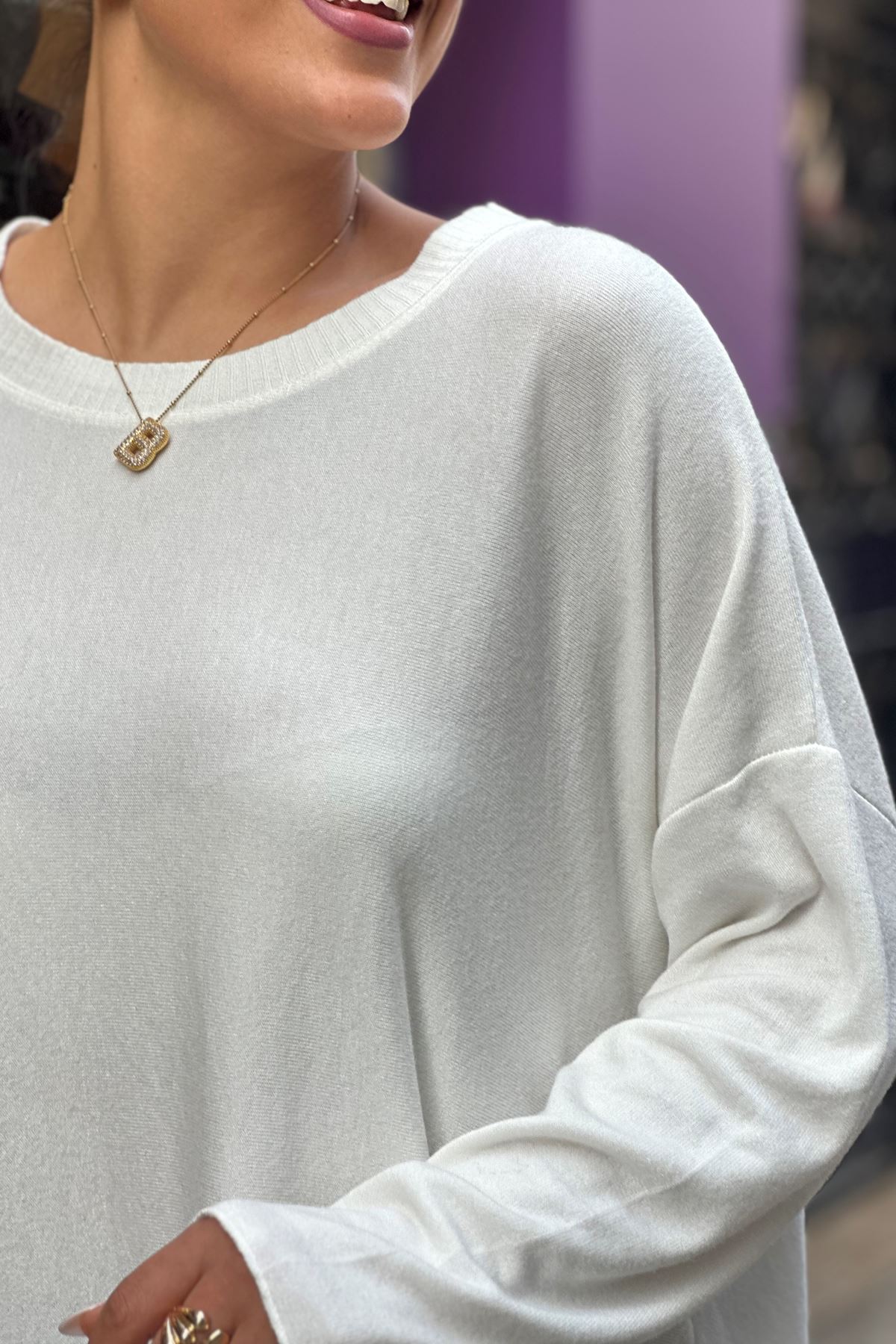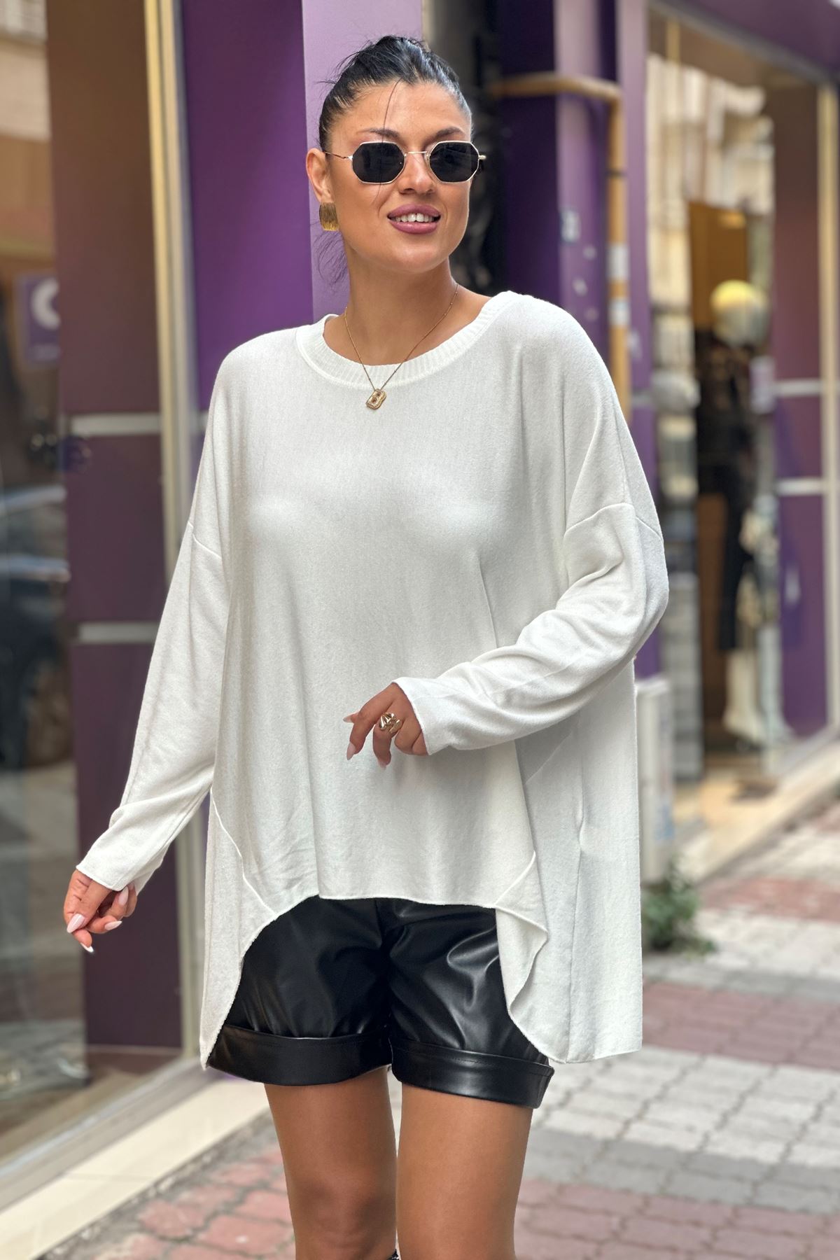 Bisiklet Yaka İthal Doku Salaş Triko Bluz-Beyaz