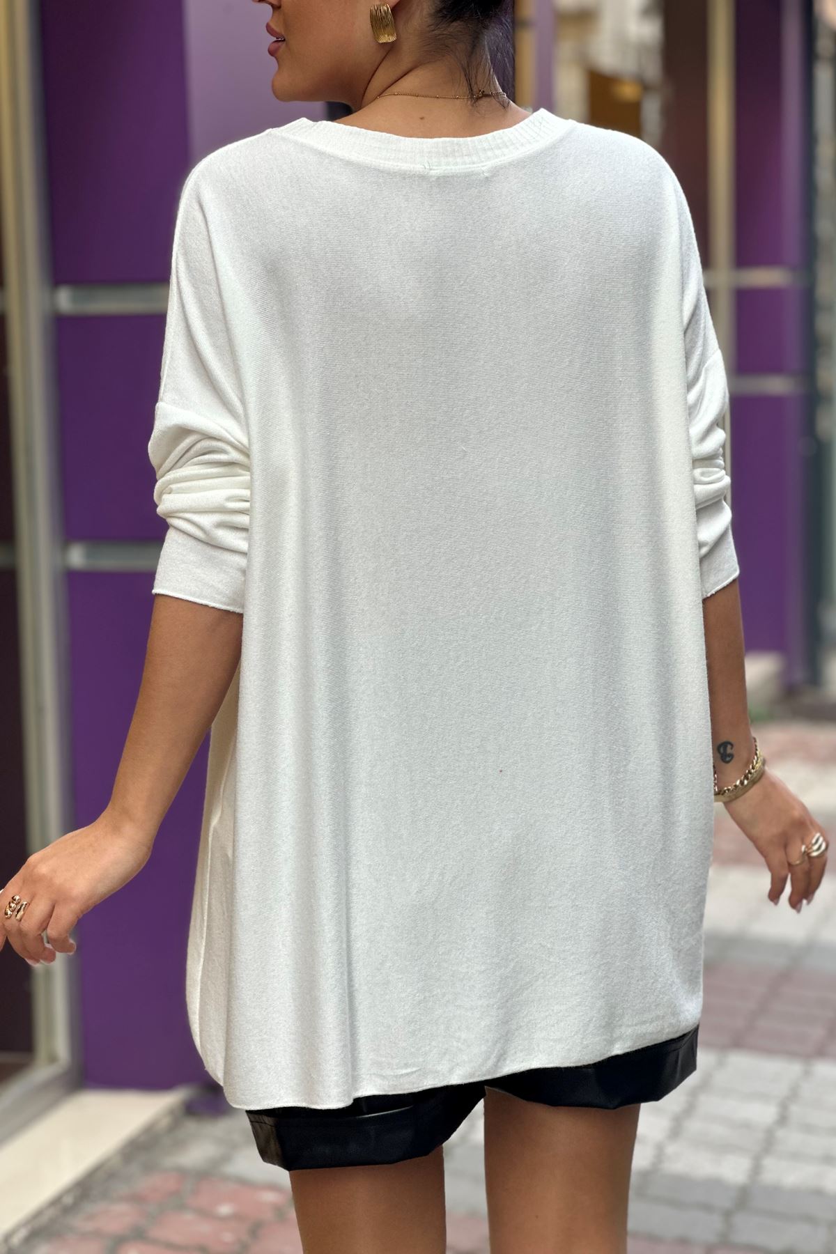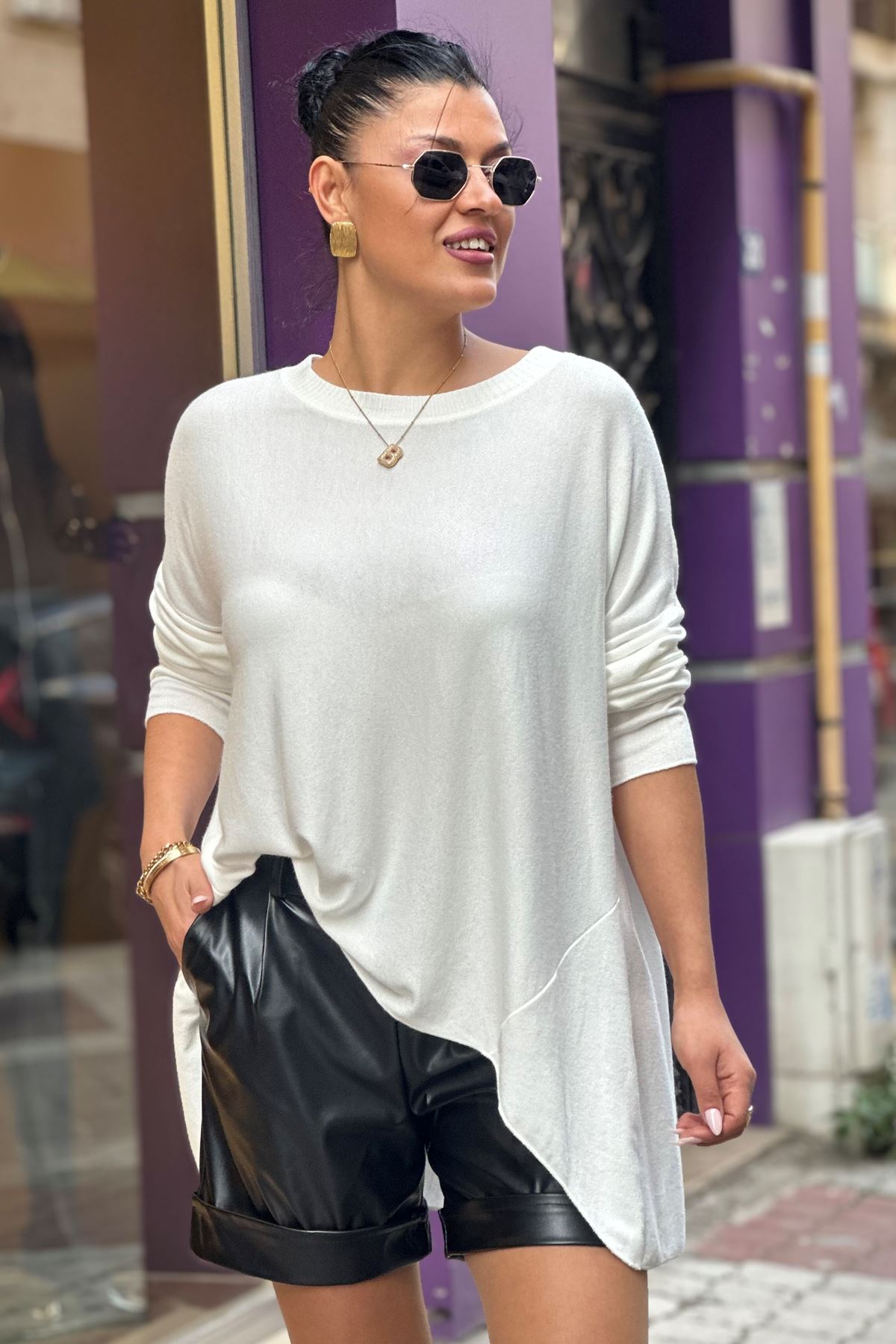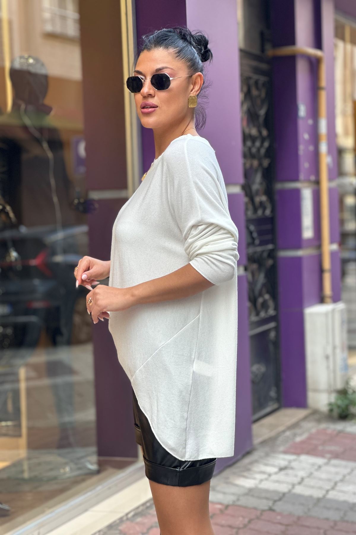 Bisiklet Yaka İthal Doku Salaş Triko Bluz-Beyaz