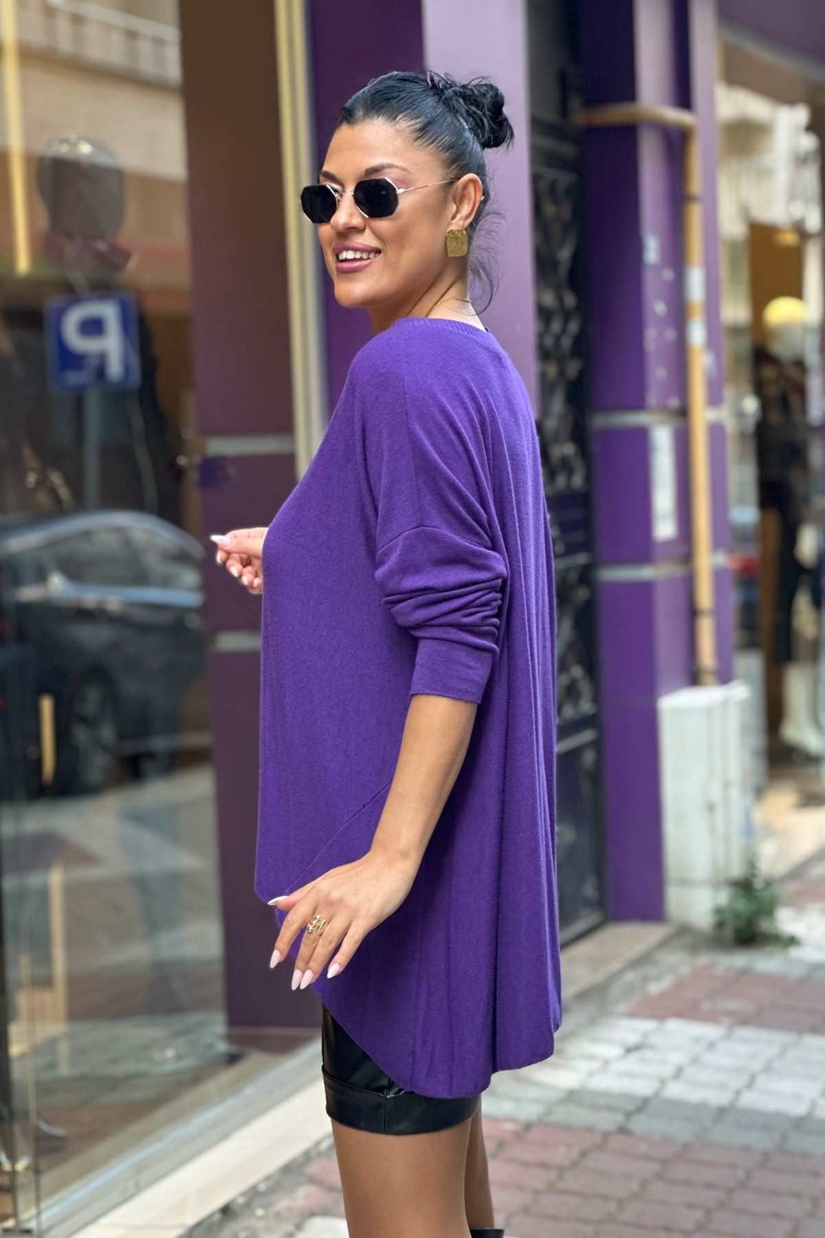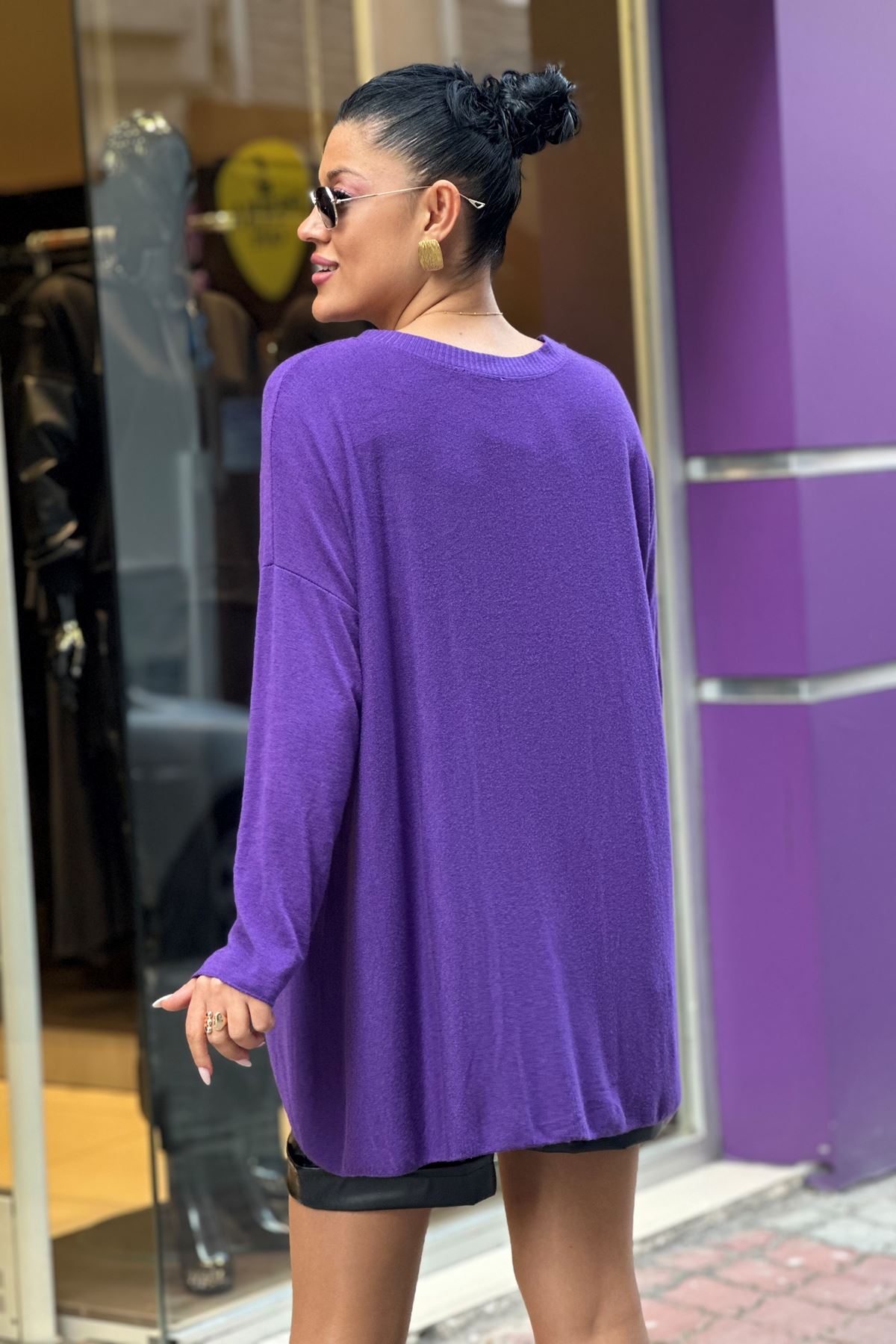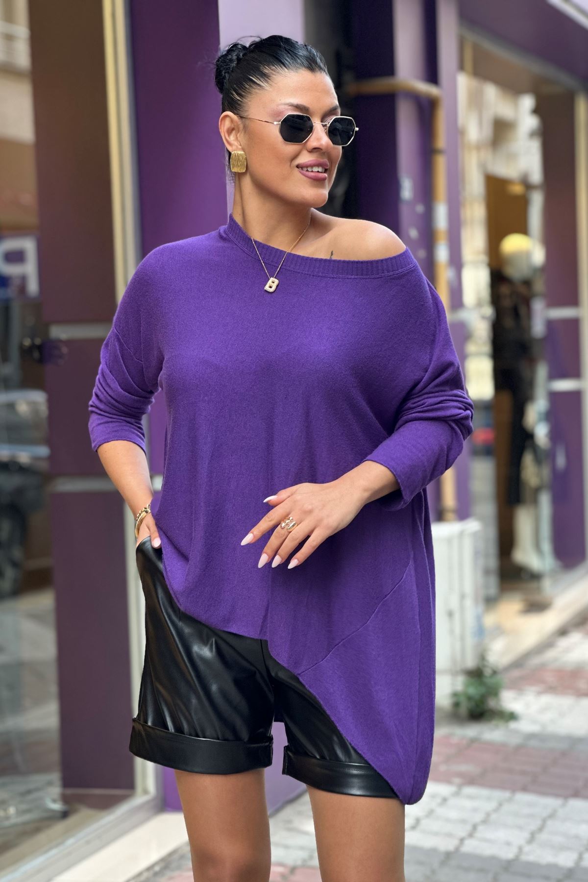 Bisiklet Yaka İthal Doku Salaş Triko Bluz-Mor