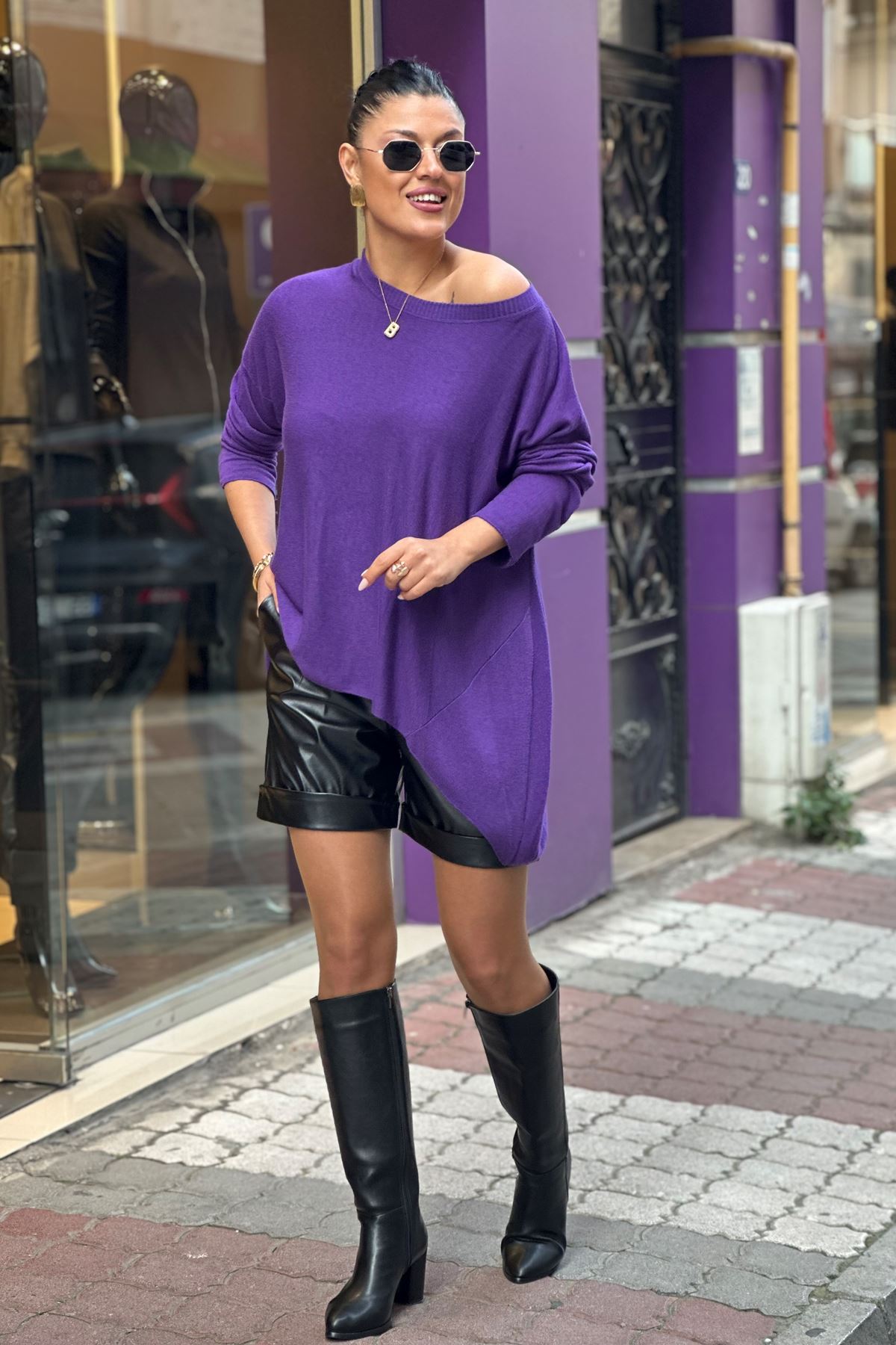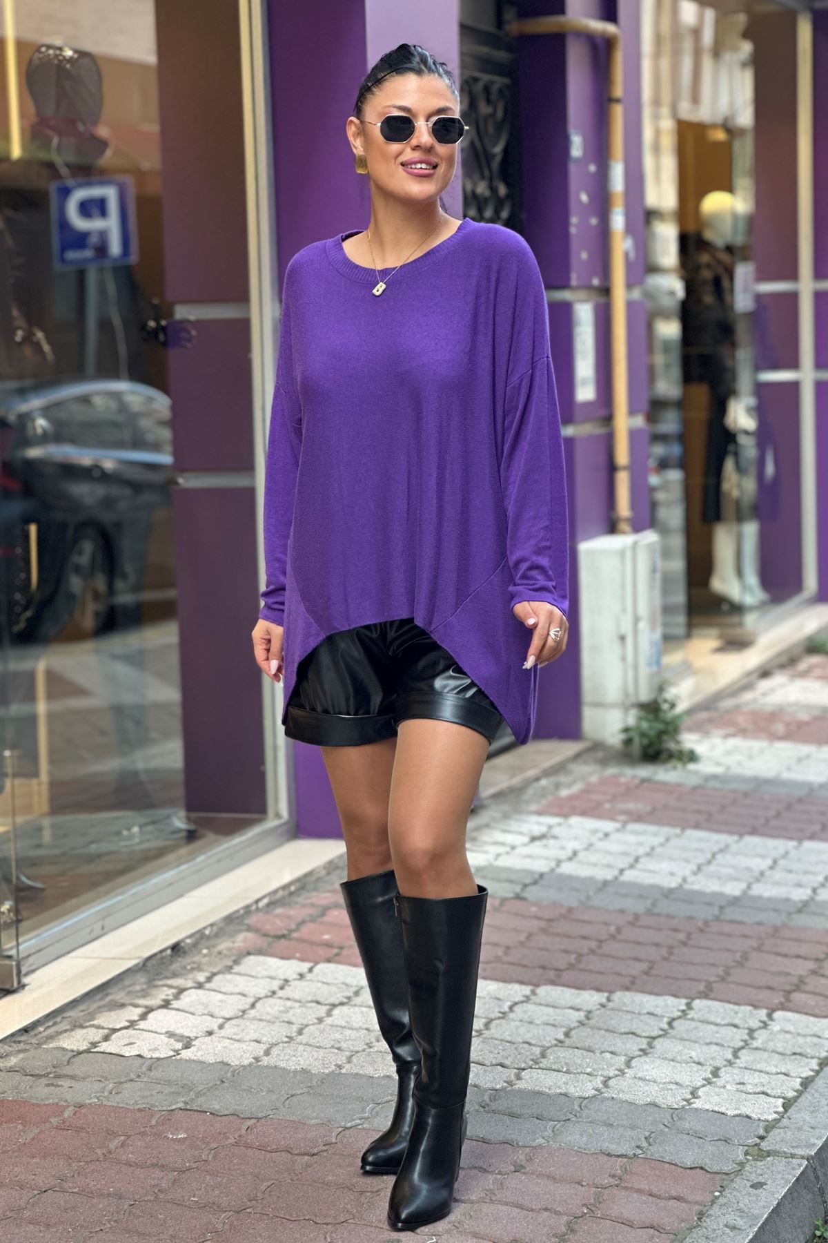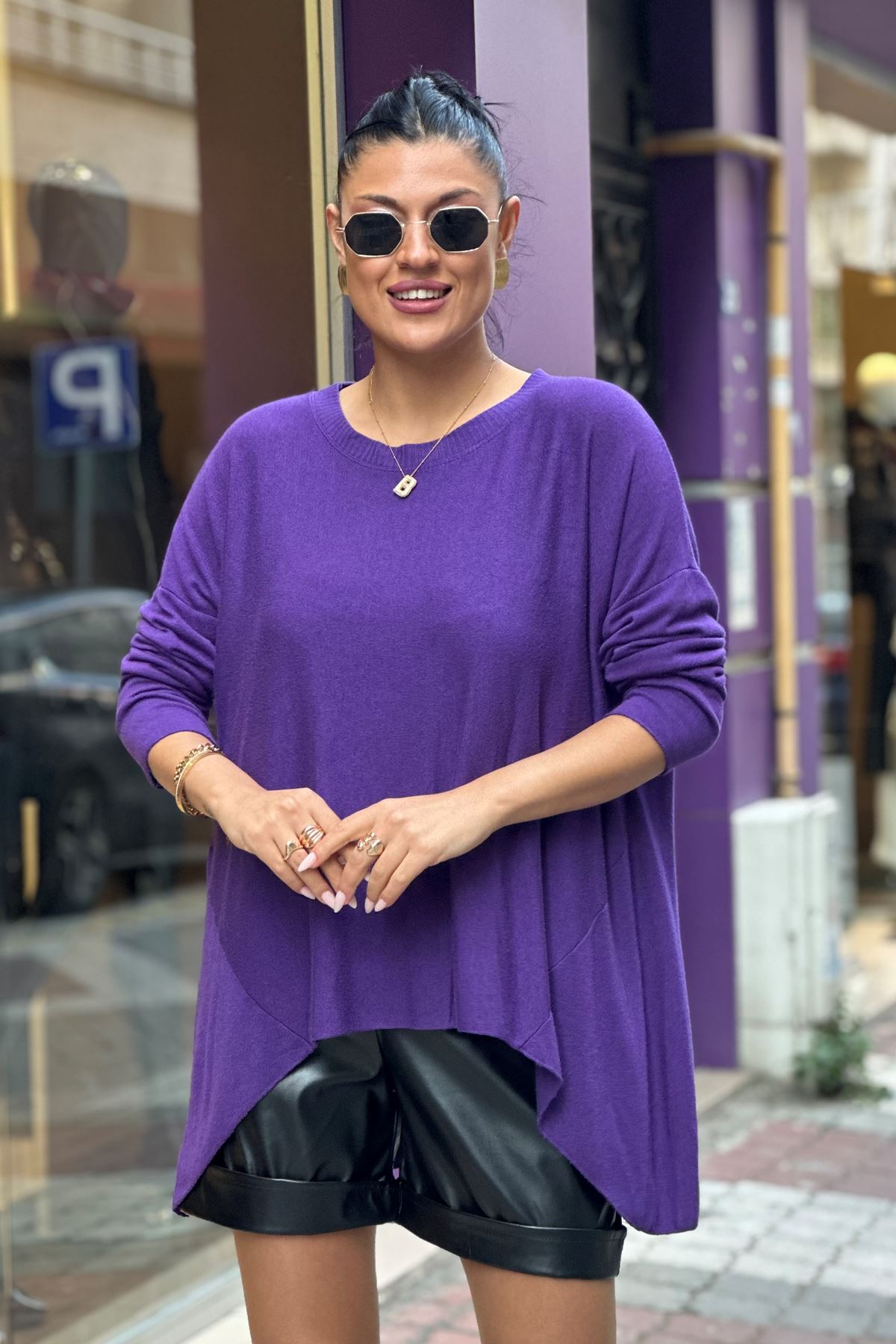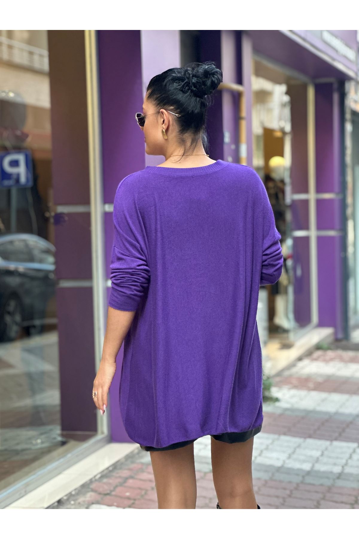 Bisiklet Yaka İthal Doku Salaş Triko Bluz-Mor