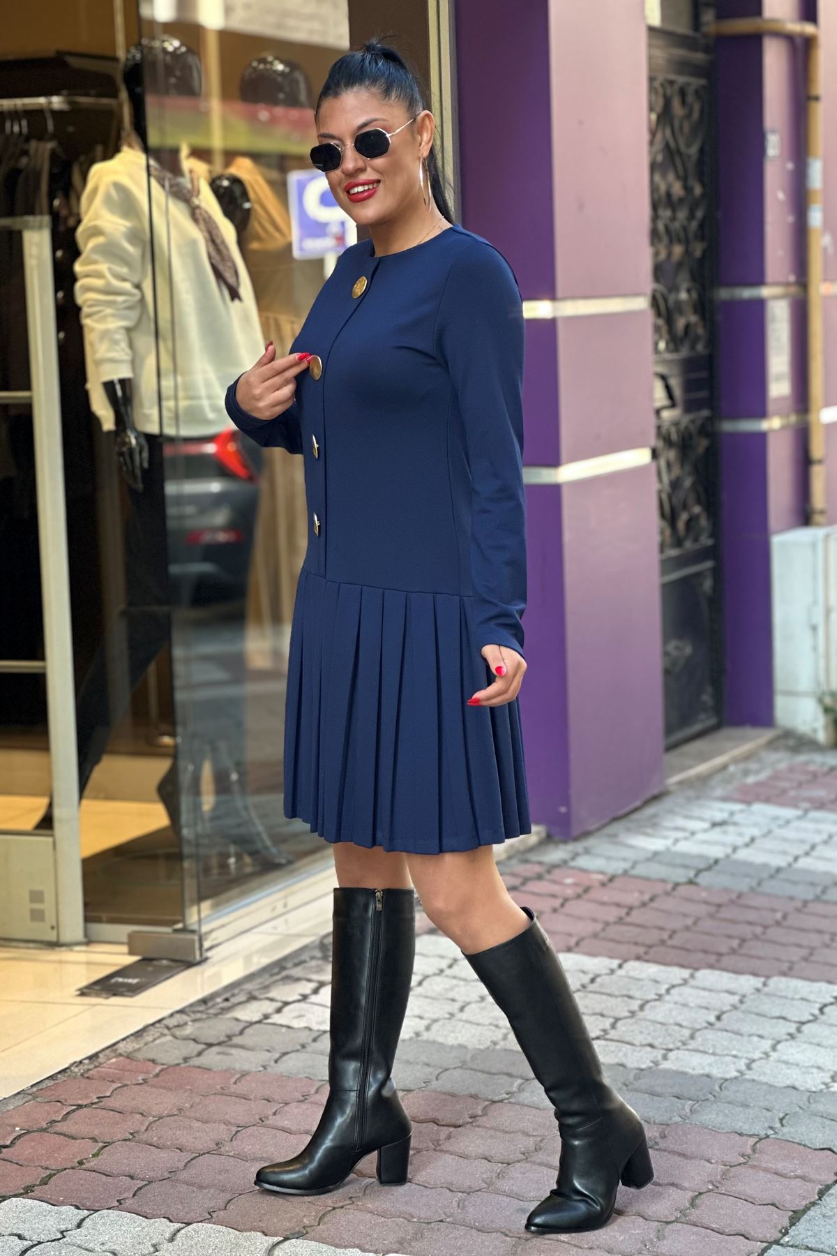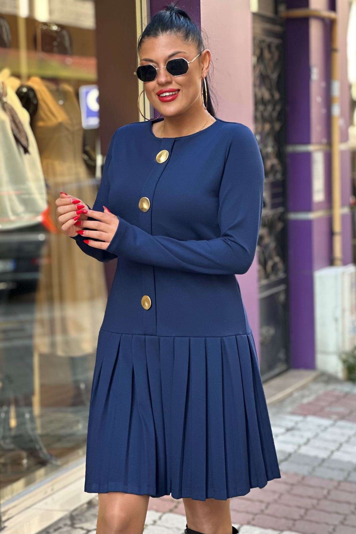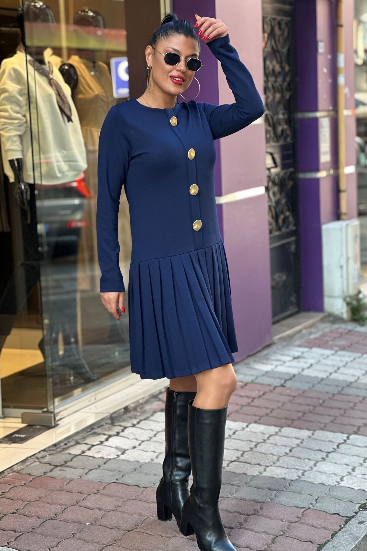 Çelik Düğme Detaylı Pileli Elbise-Lacivert