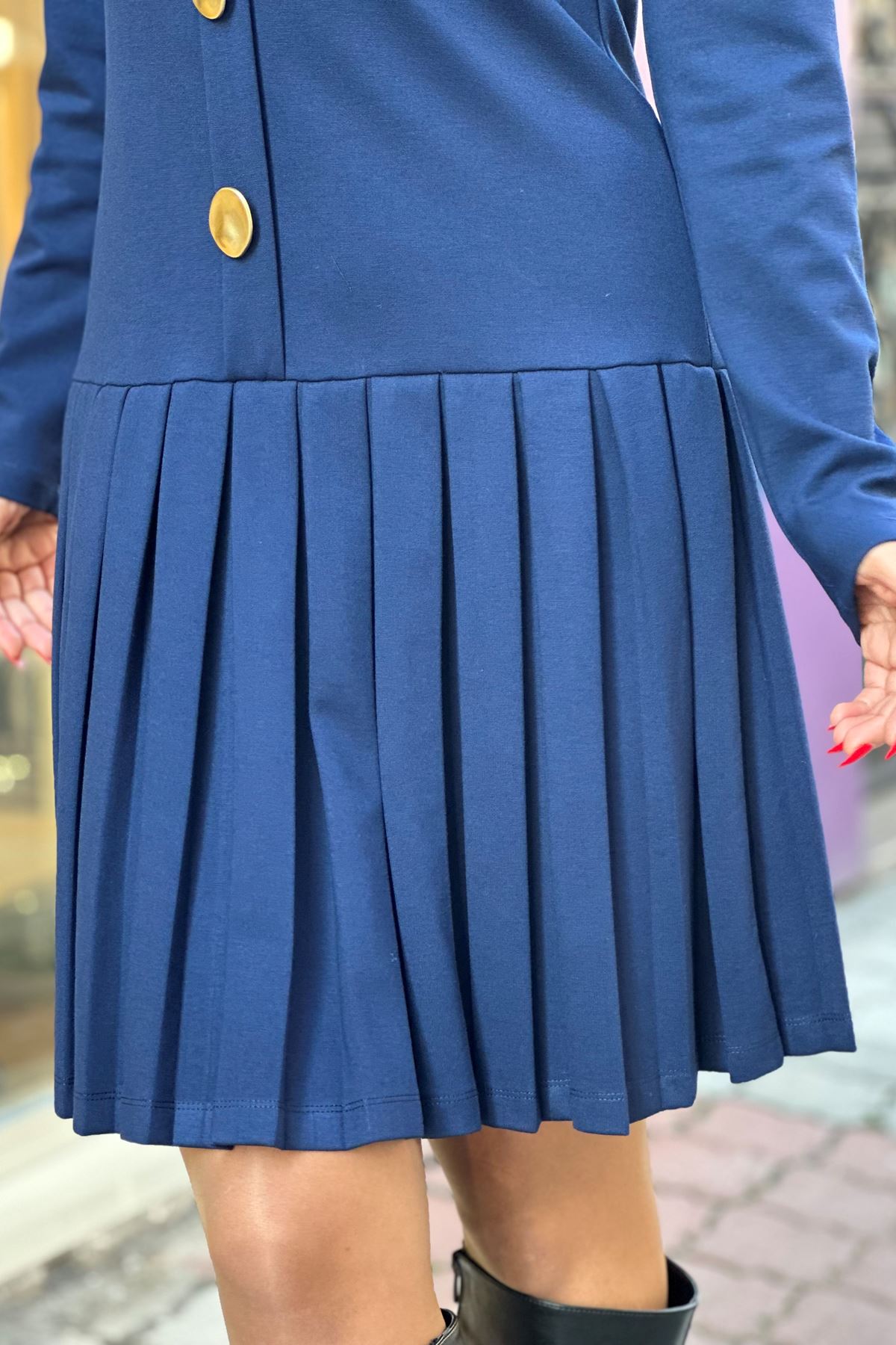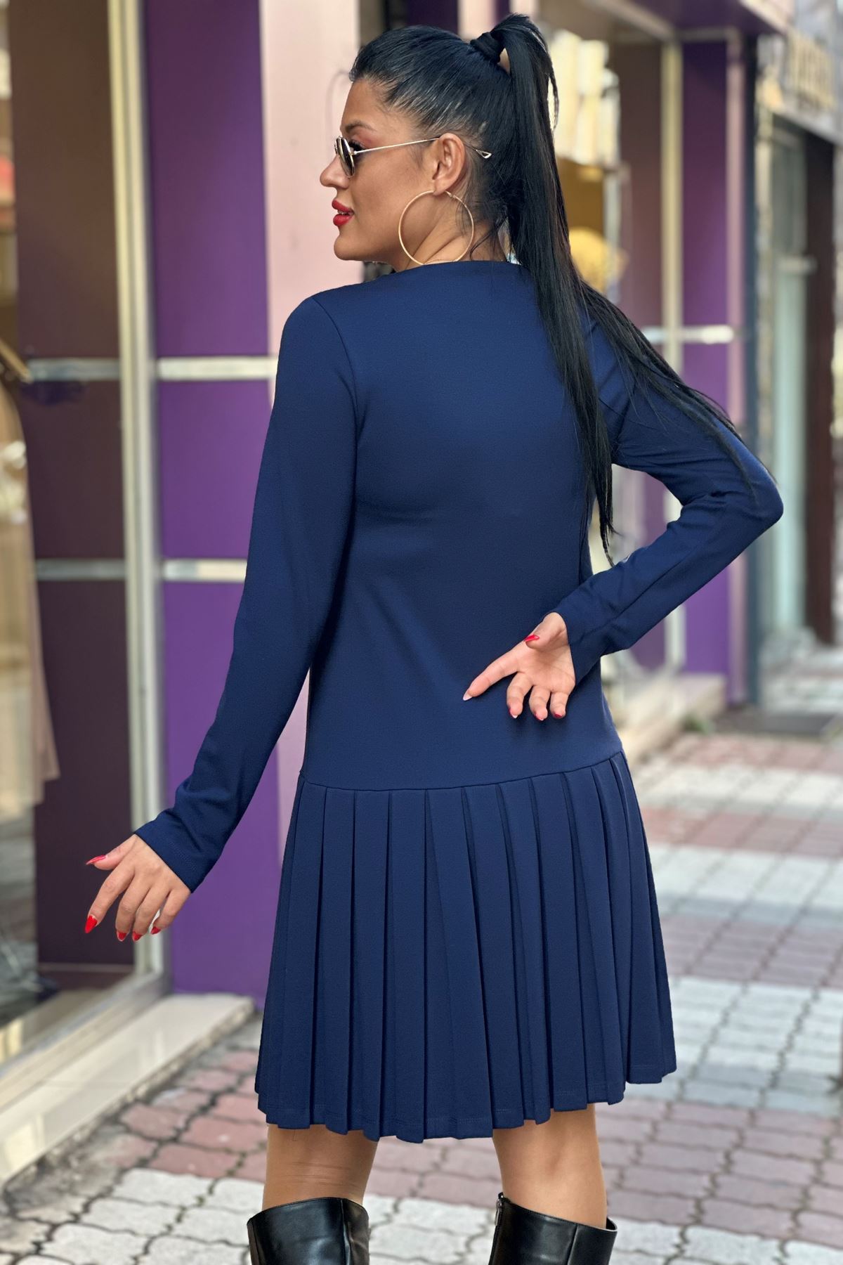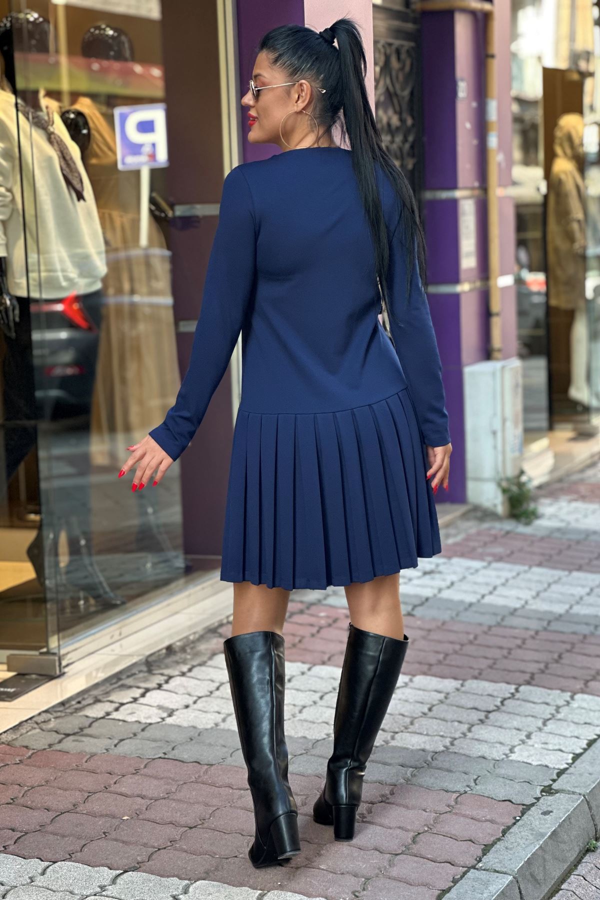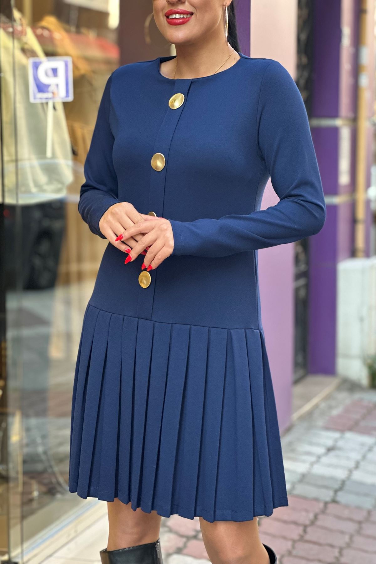 Çelik Düğme Detaylı Pileli Elbise-Lacivert