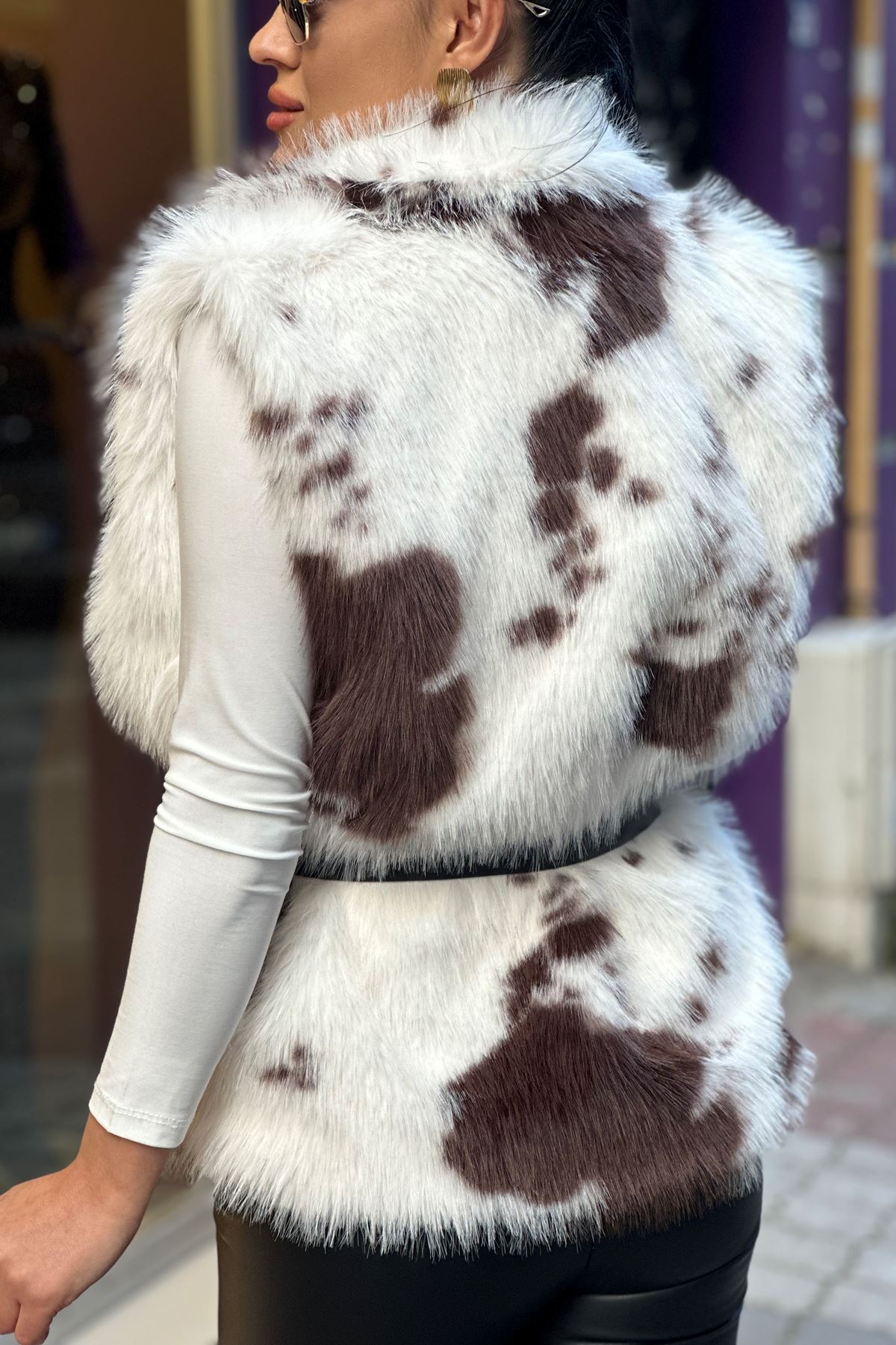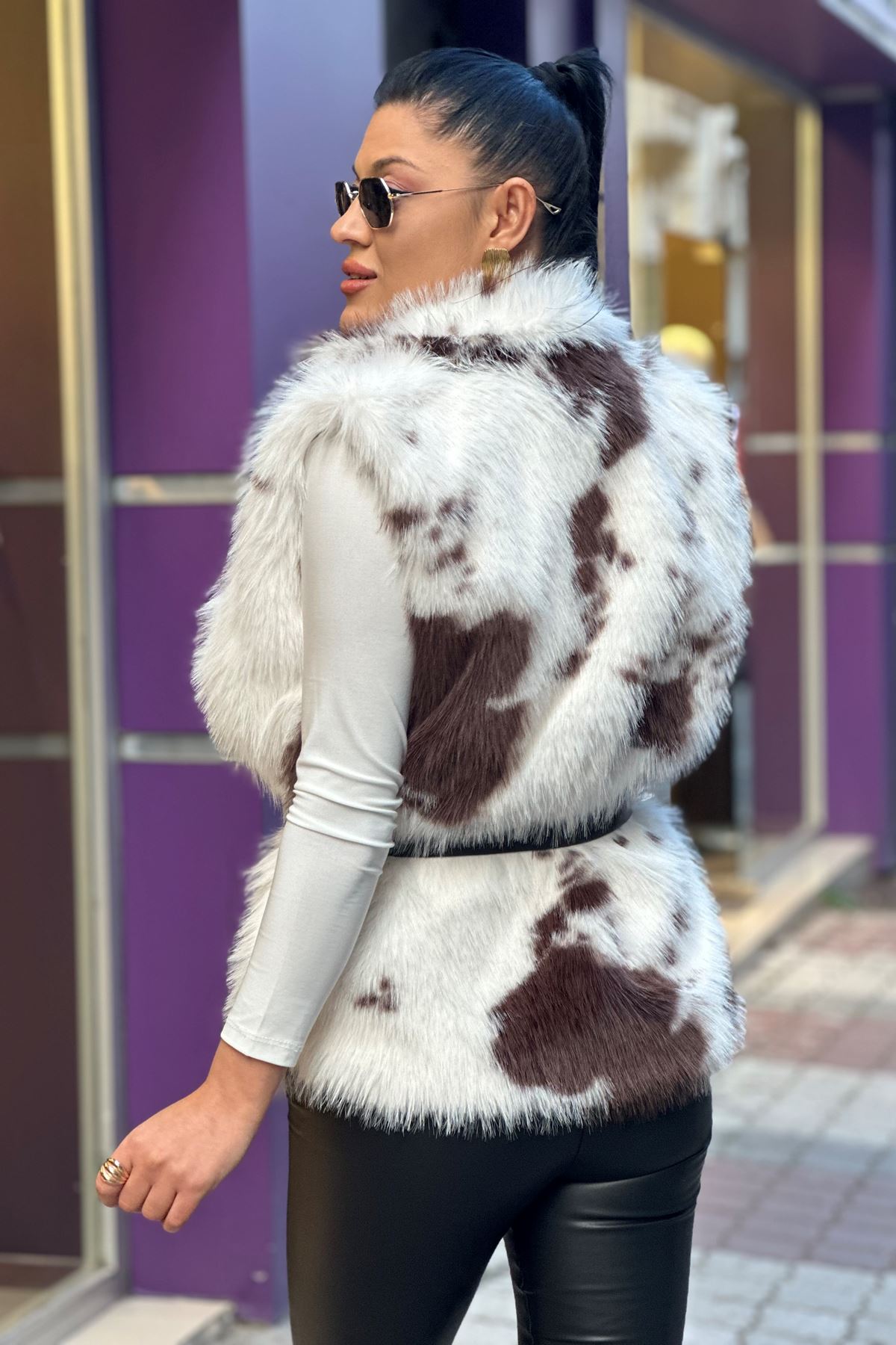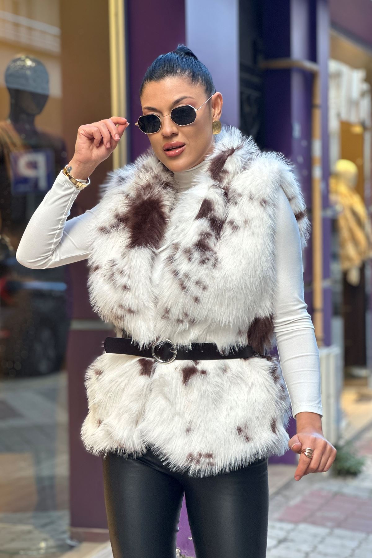 Dalmaç Desenli Deri Kemerli Kürk Yelek-Kahve