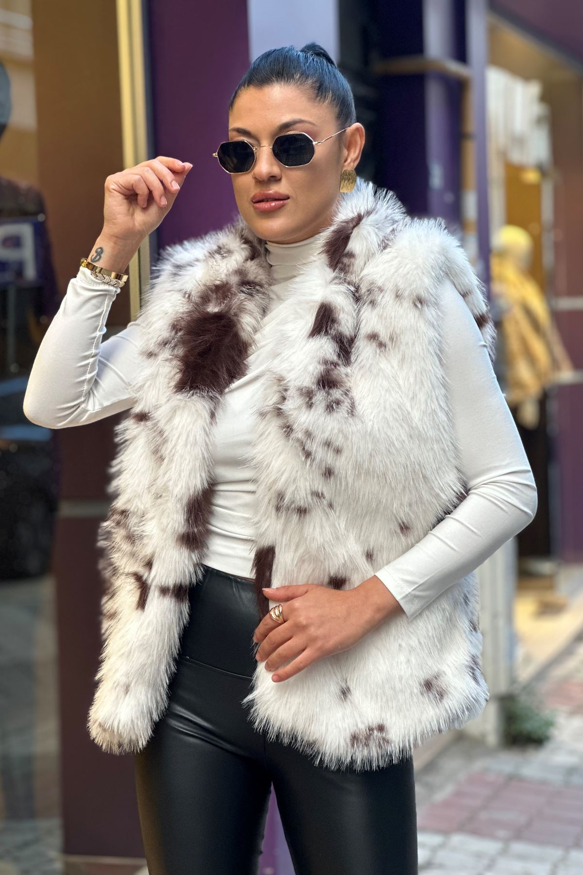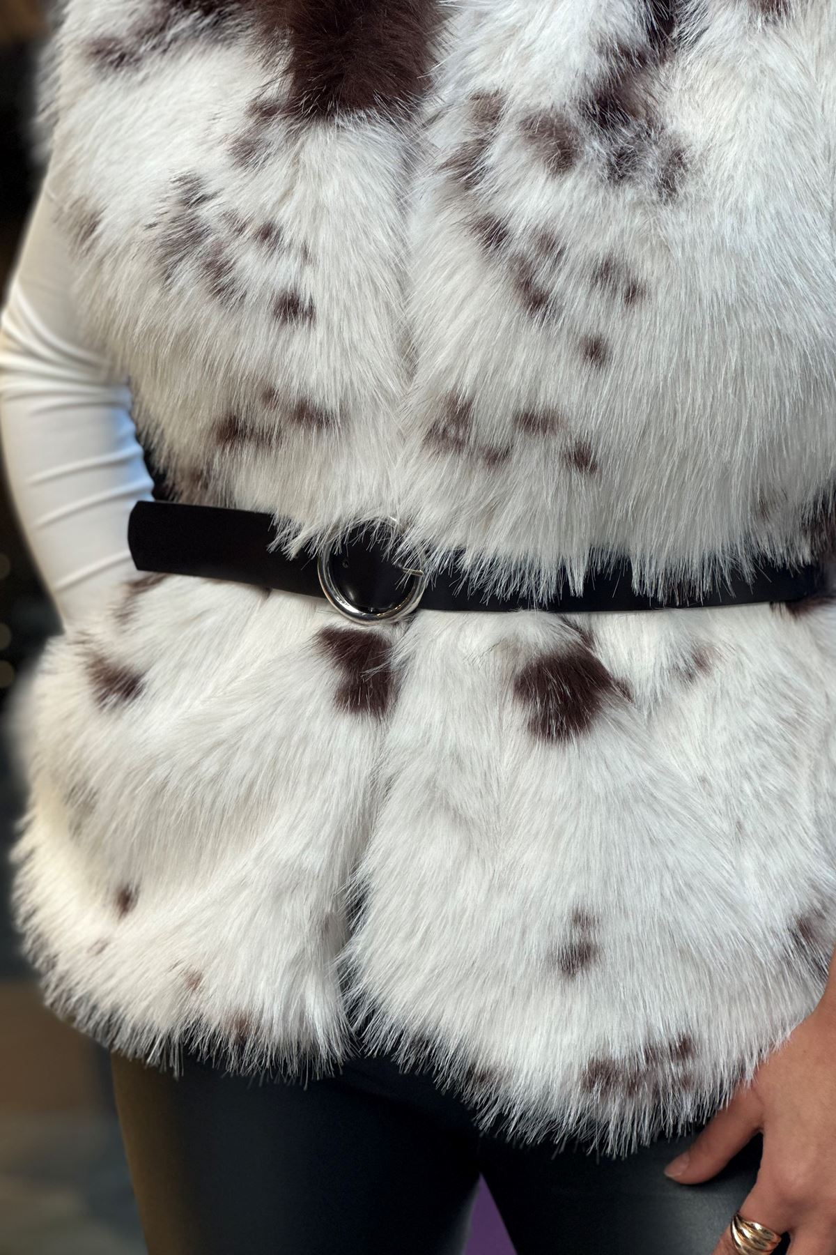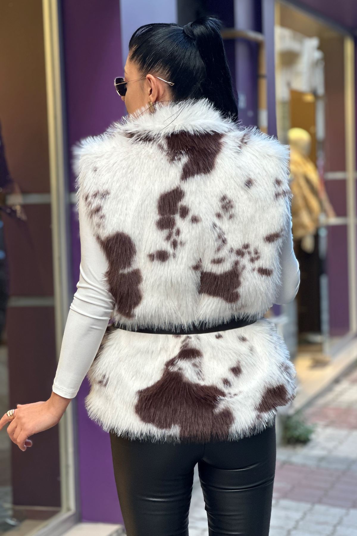 Dalmaç Desenli Deri Kemerli Kürk Yelek-Kahve