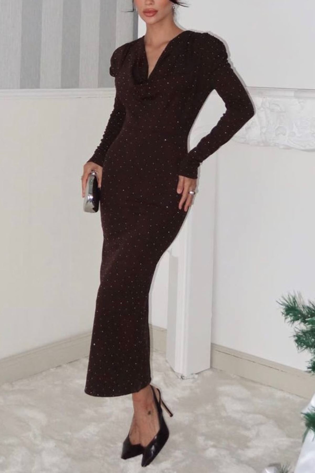 Degaje Yaka Omuz Vatkalı Taşlı Elbise-Kahve