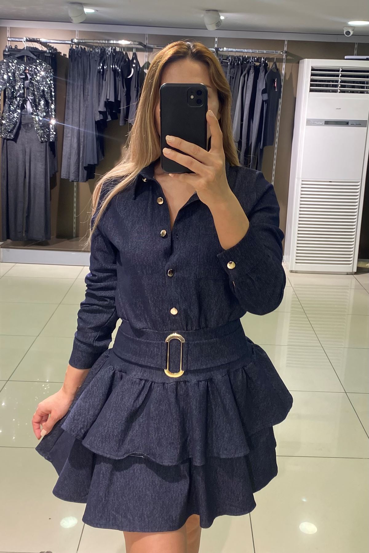 Eteği Kat Volanlı Kemerli Kot Elbise-Lacivert