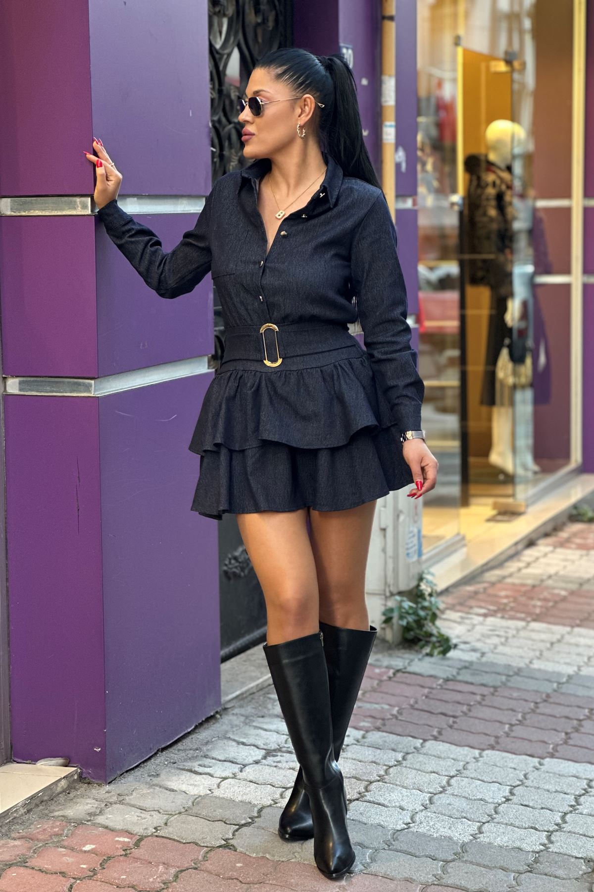 Eteği Kat Volanlı Kemerli Kot Elbise