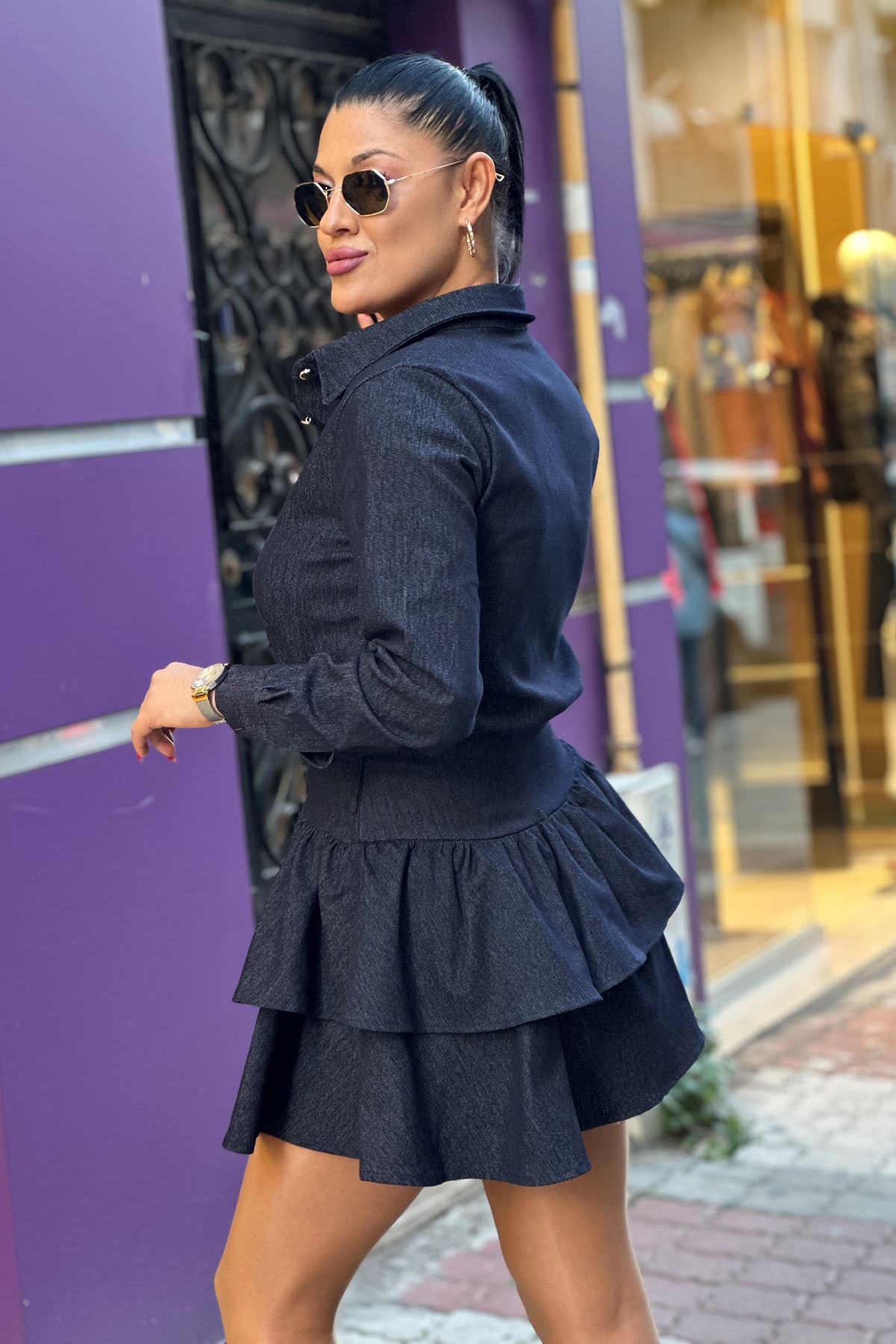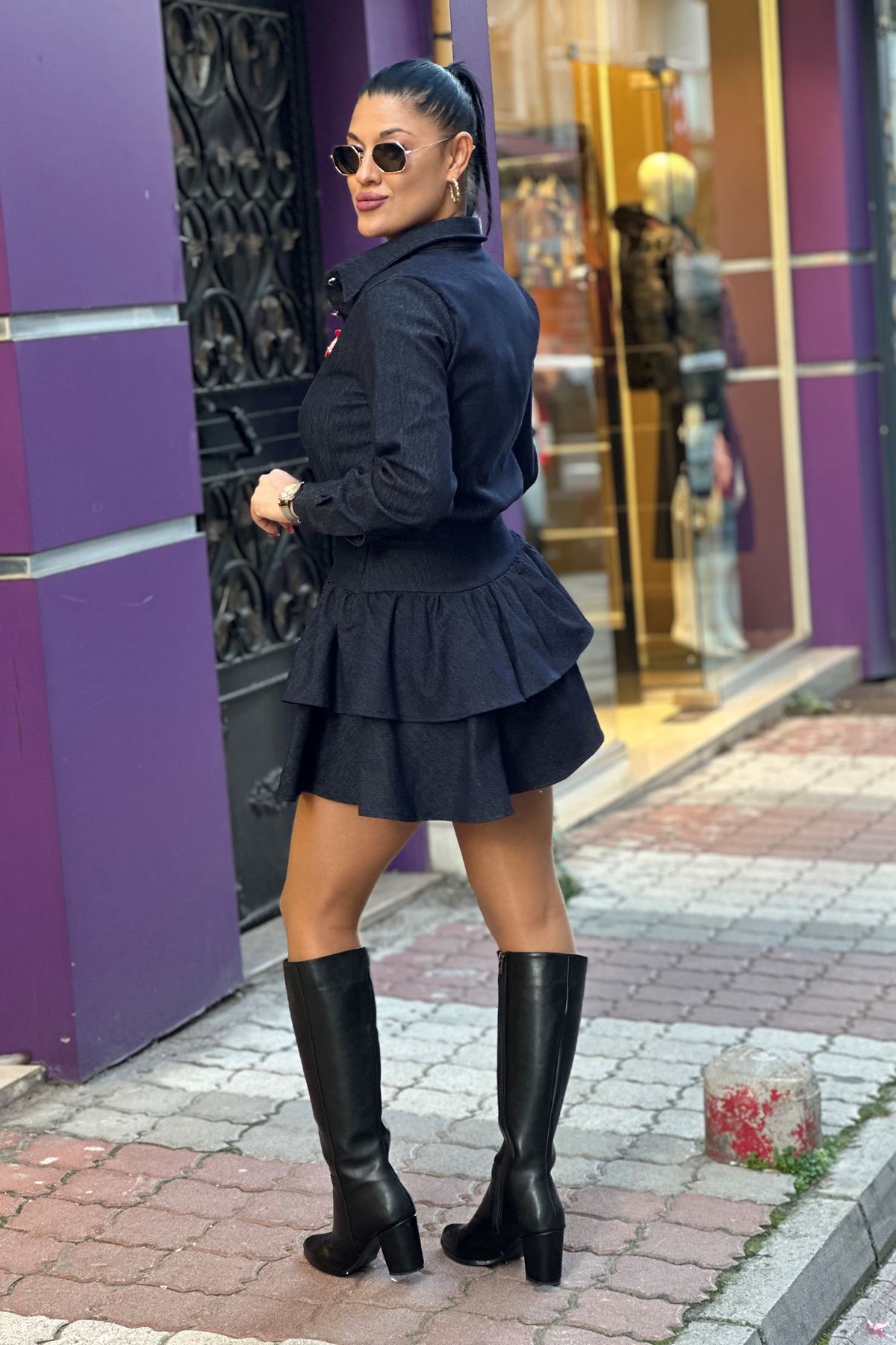Eteği Kat Volanlı Kemerli Kot Elbise-Lacivert