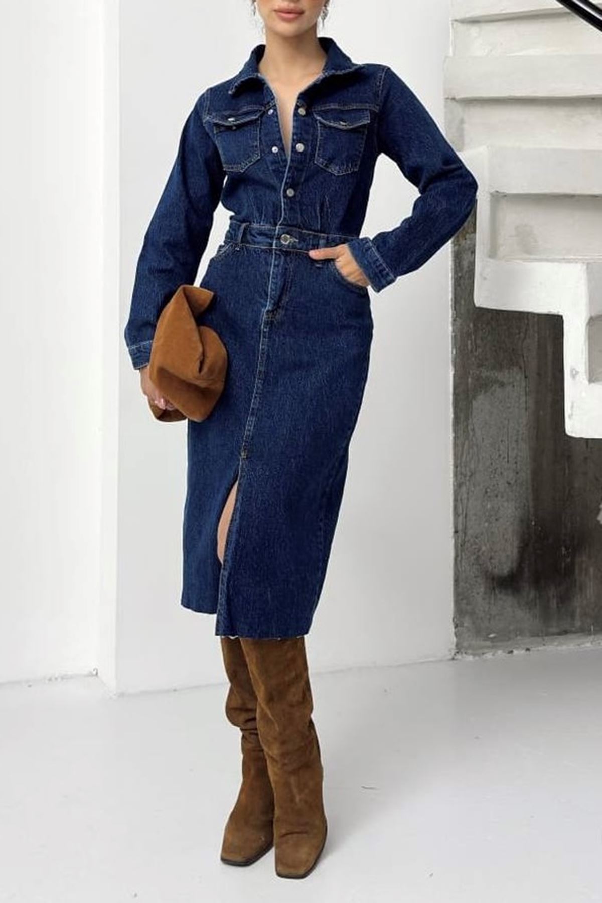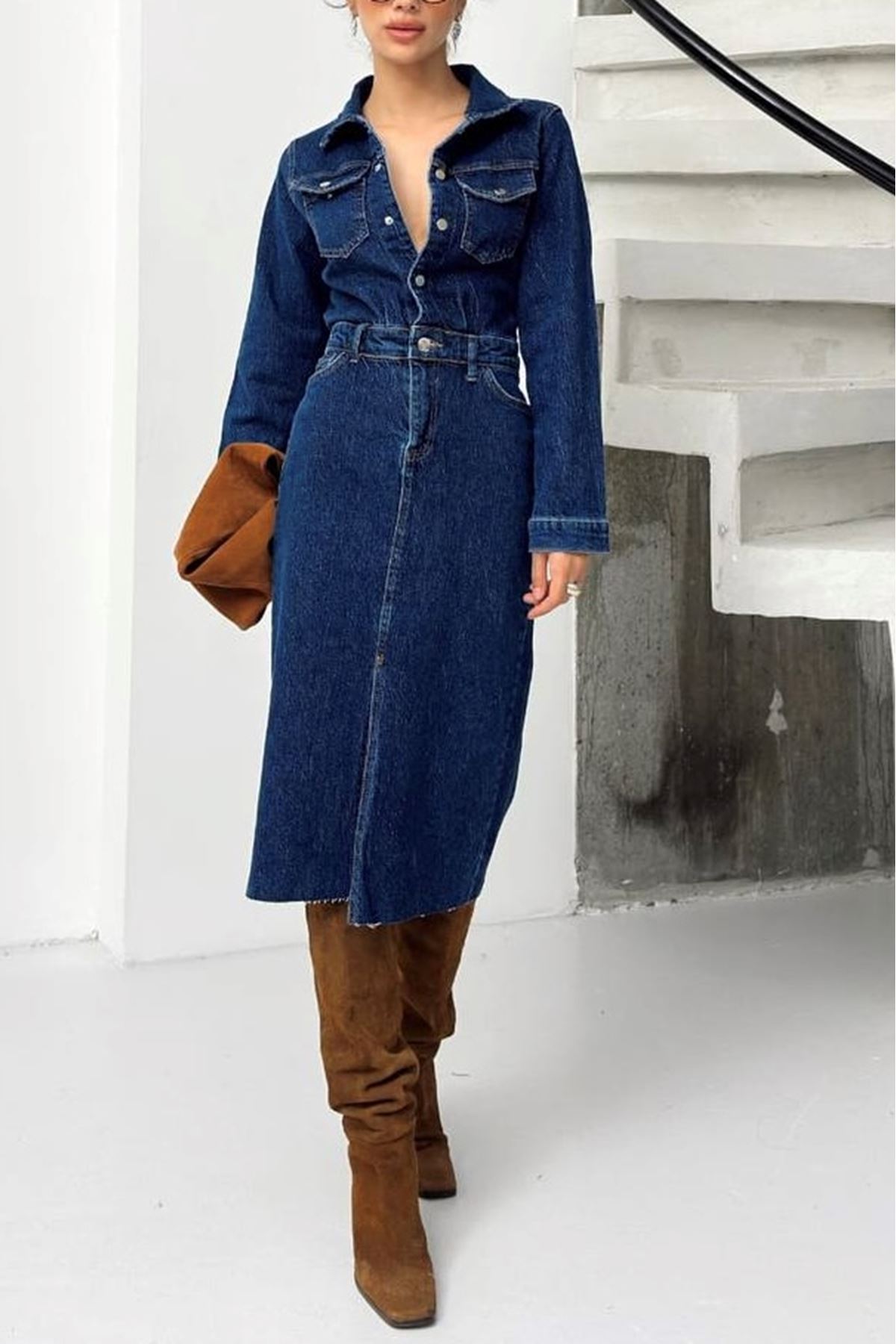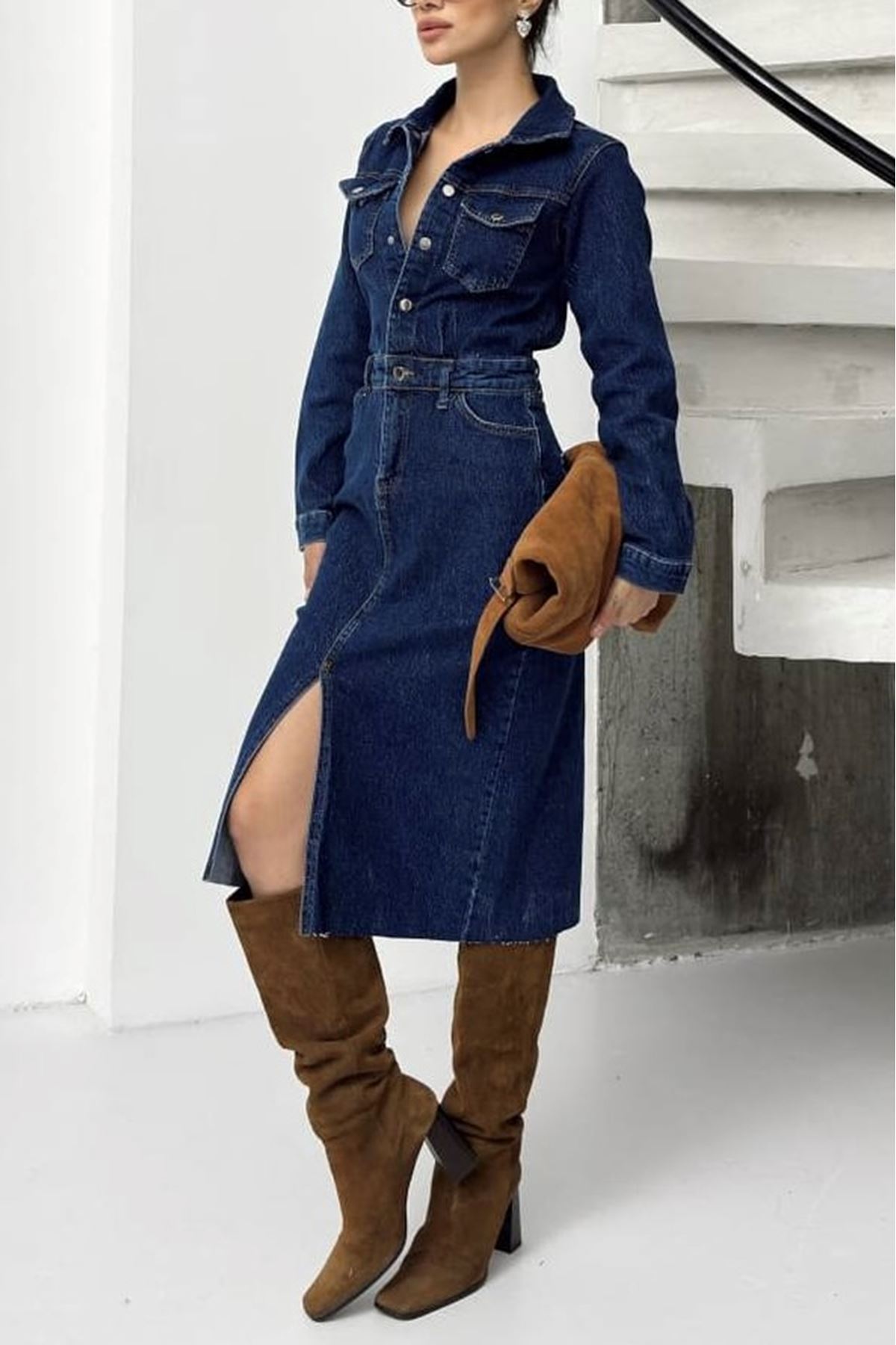 Eteği Yırtmaçlı Düğmeli Kot Elbise