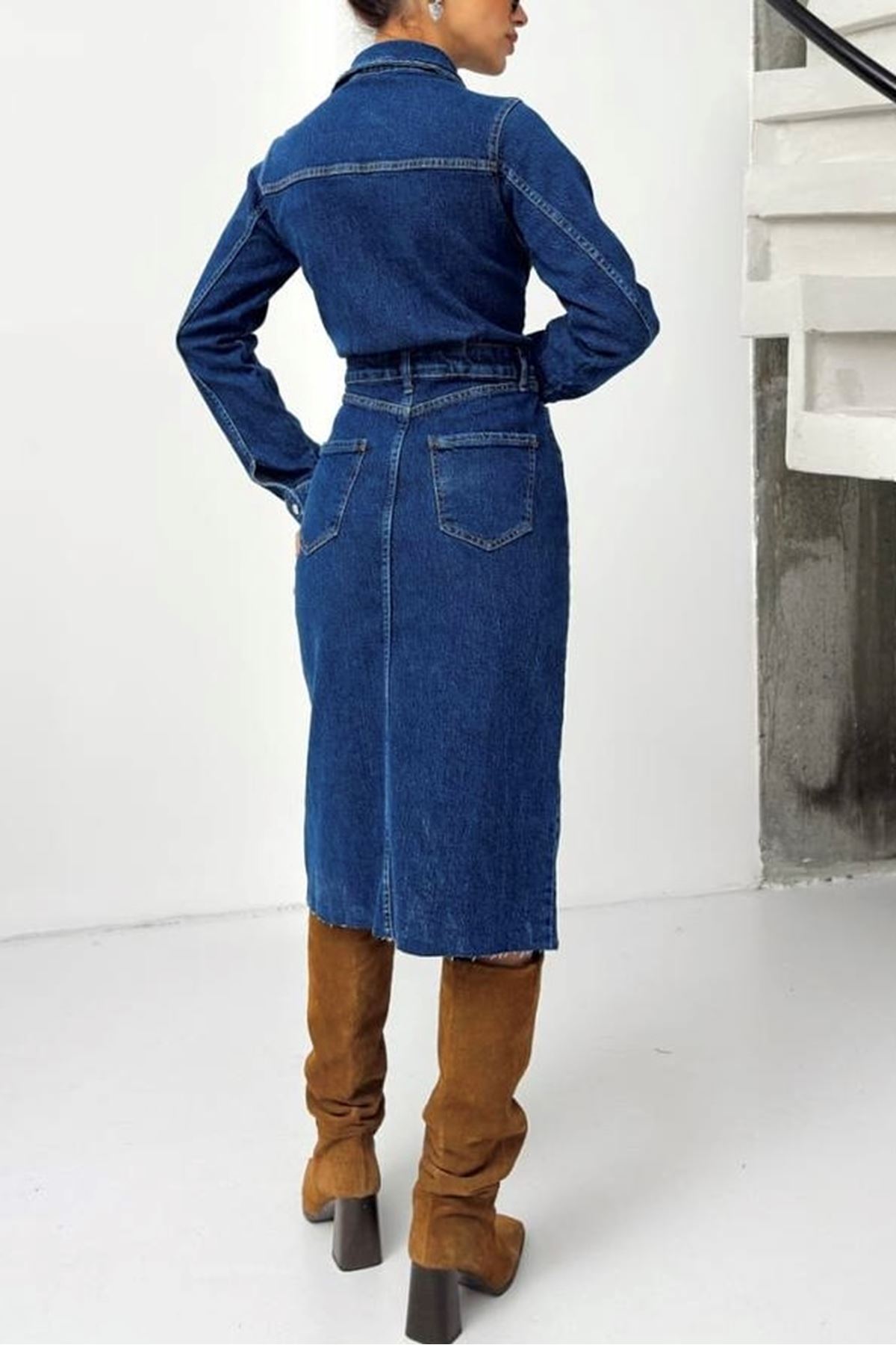 Eteği Yırtmaçlı Düğmeli Kot Elbise-Mavi