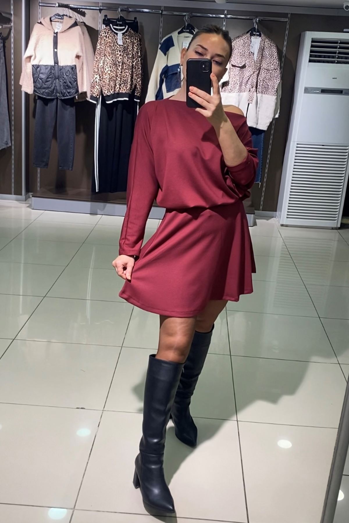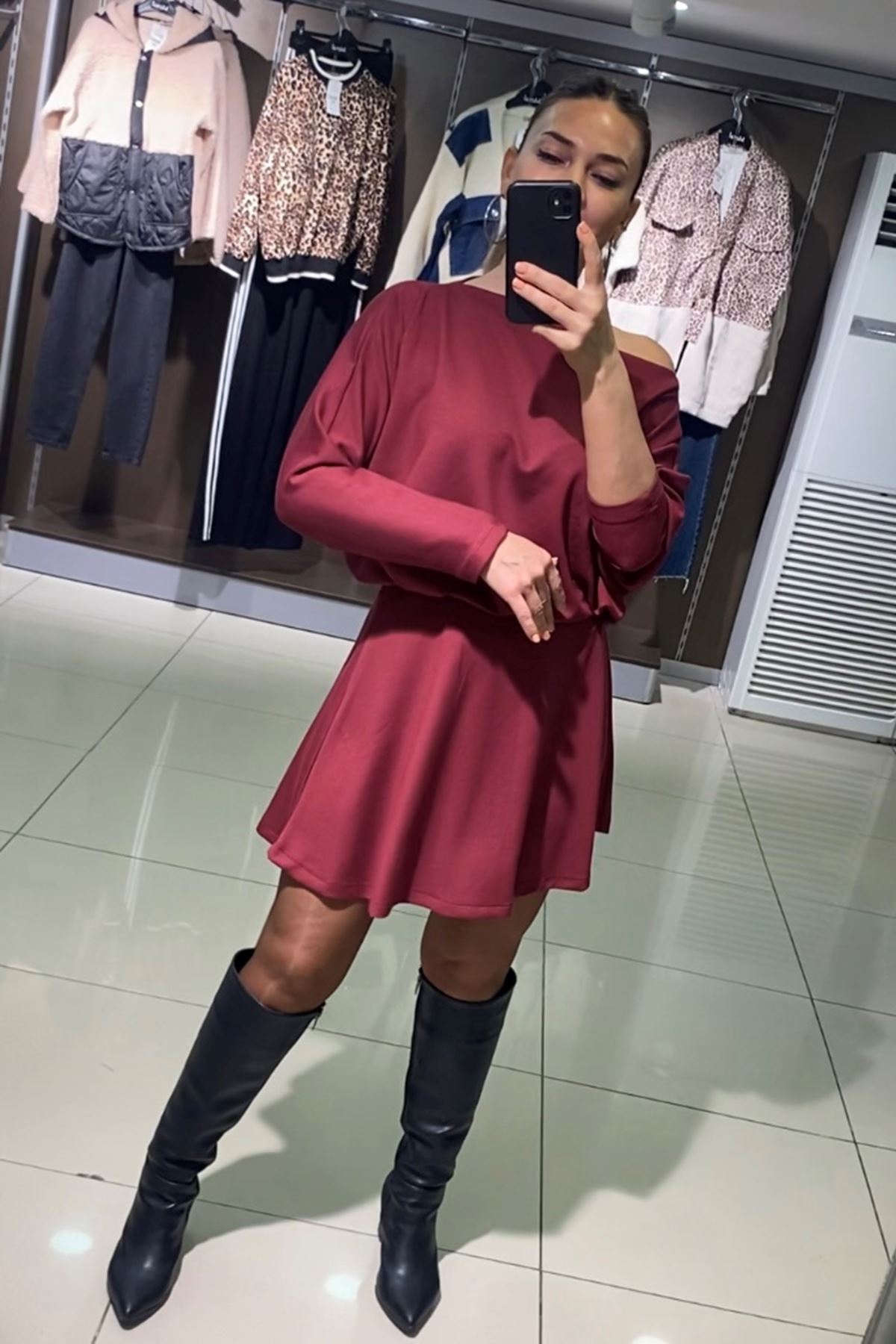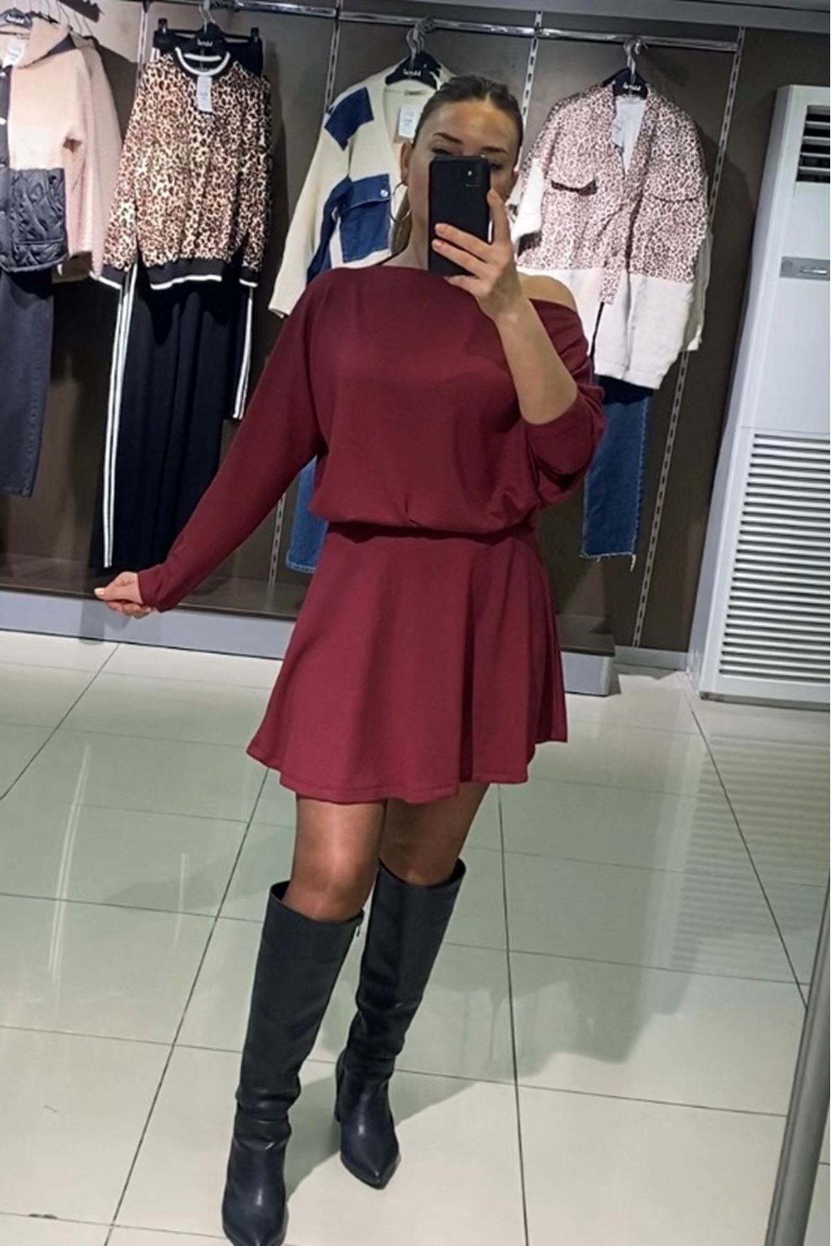Kayık Yaka Salaş Etekli İkili Takım-Bordo