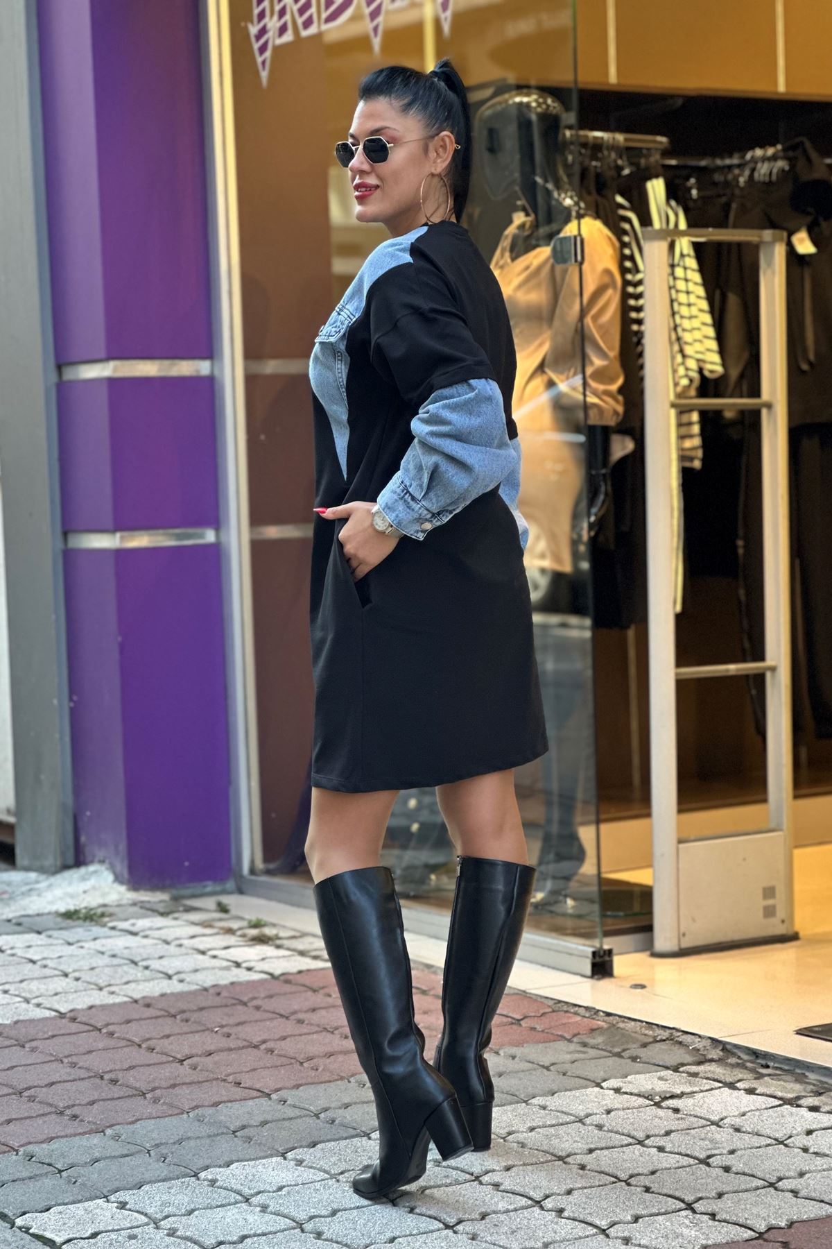 Yaka Ve Kolları Kot Detay Sweatshirt Elbise-Siyah