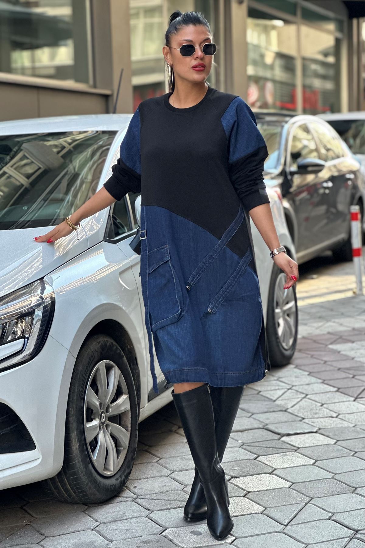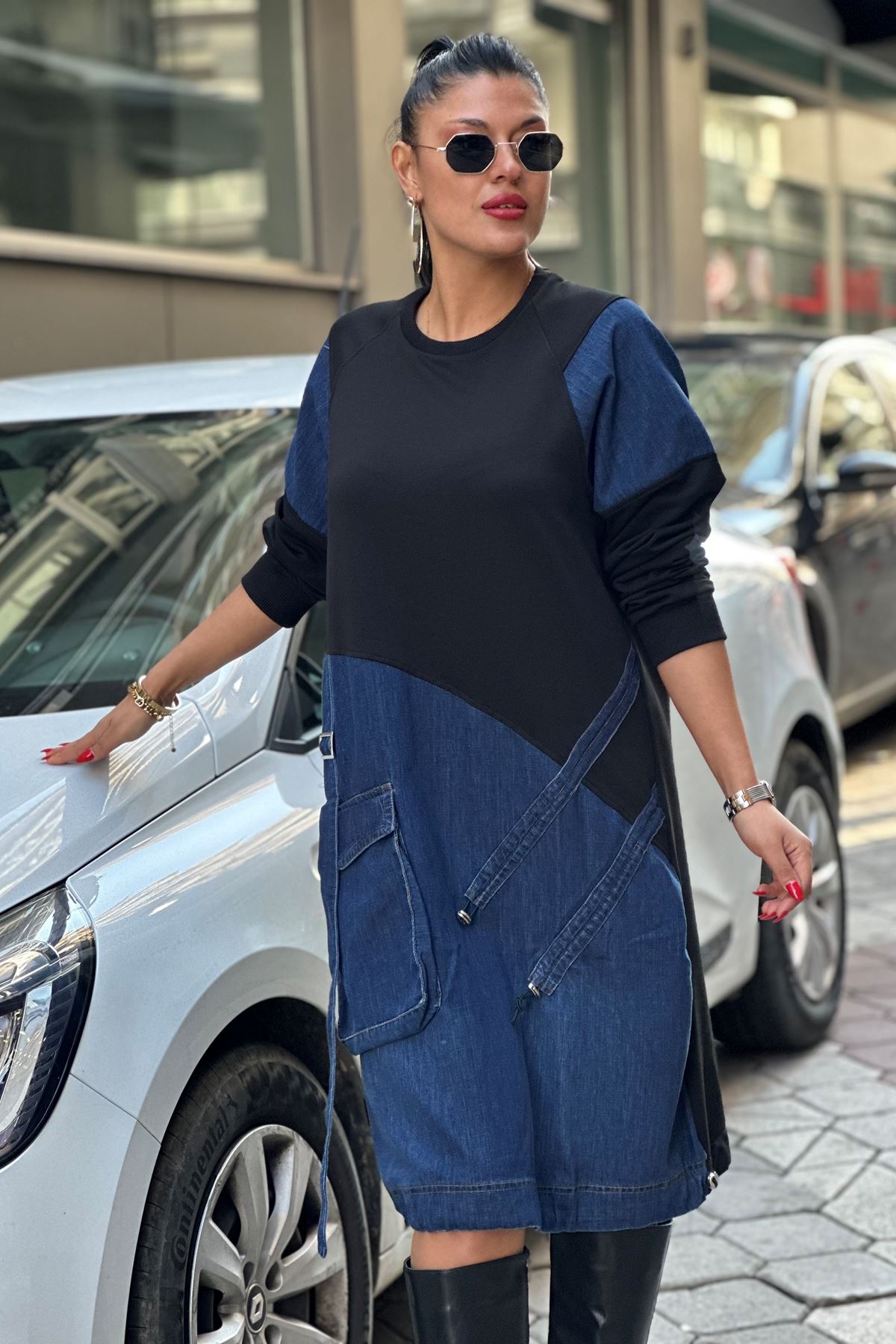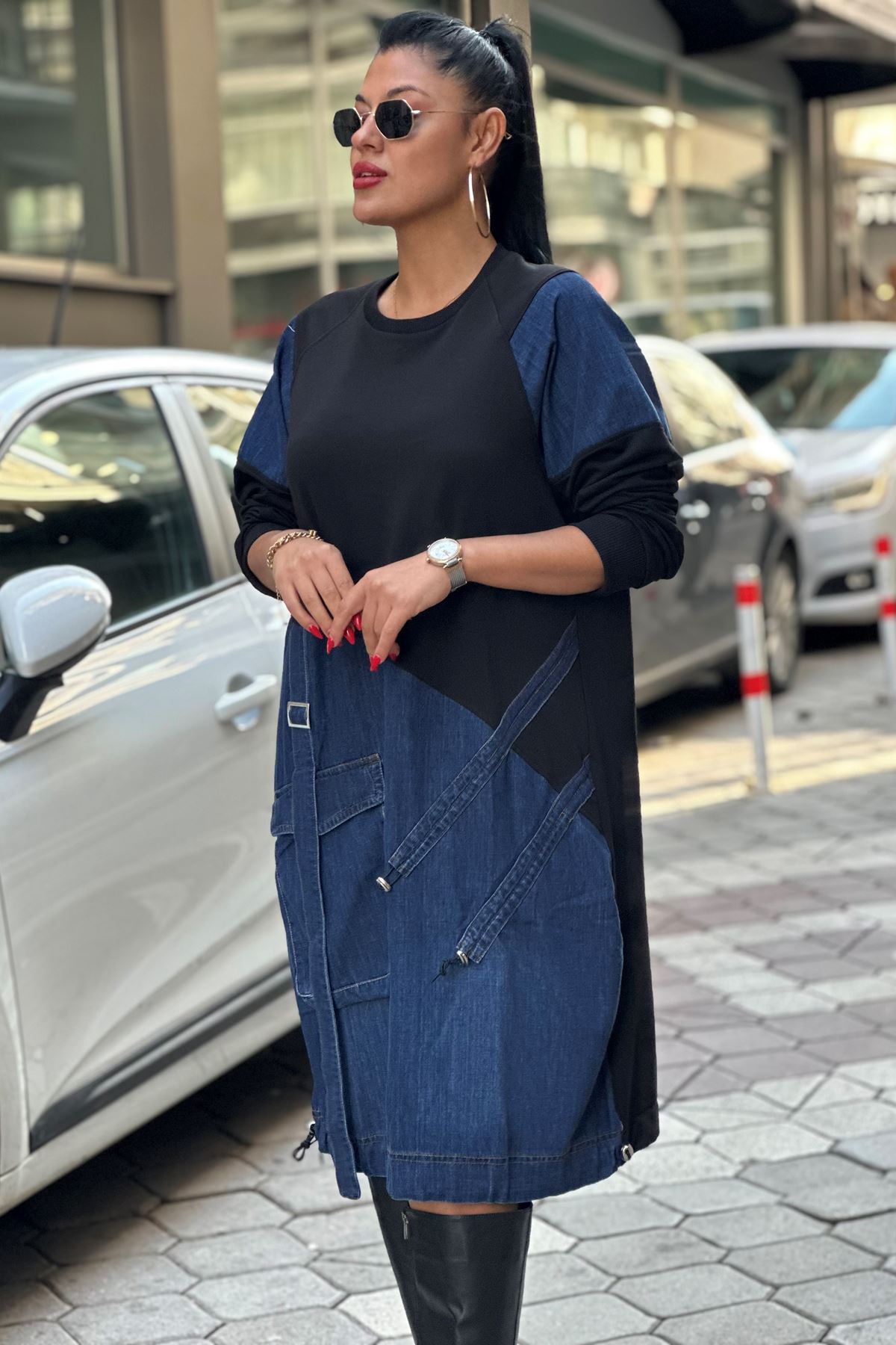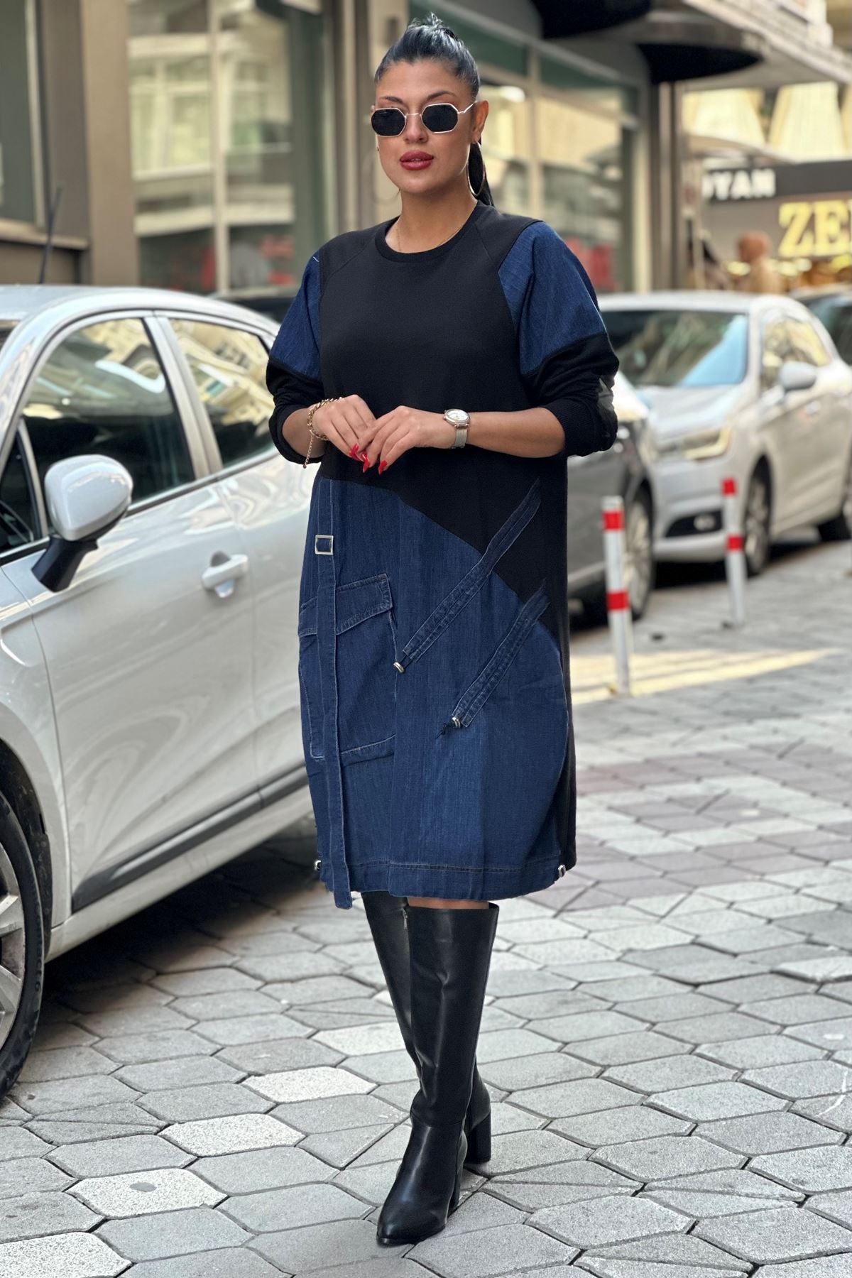 Eteği Büzgülü Kot Detay Sweat Elbise-Siyah