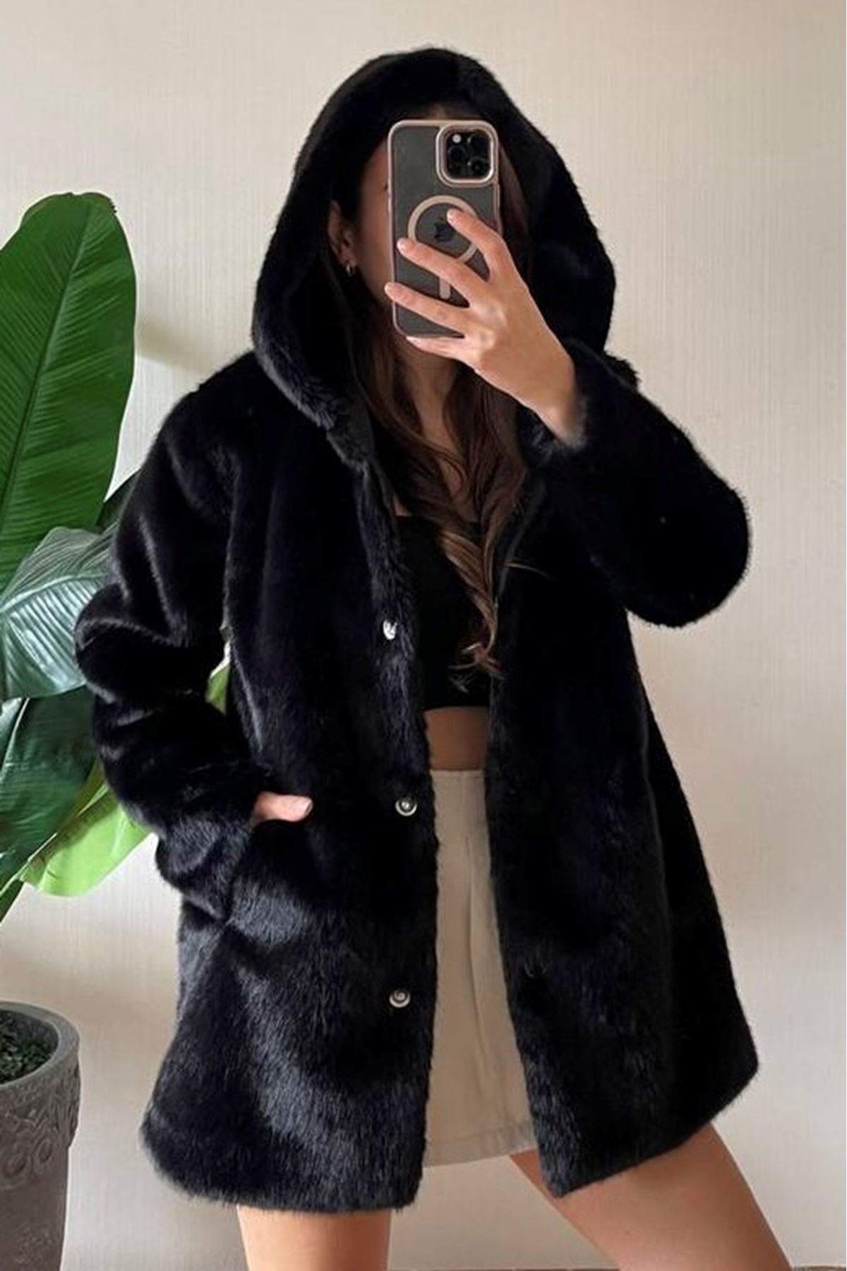 Kapşonlu Çıtçıtlı Suni Tavşan Kürk Mont-Siyah