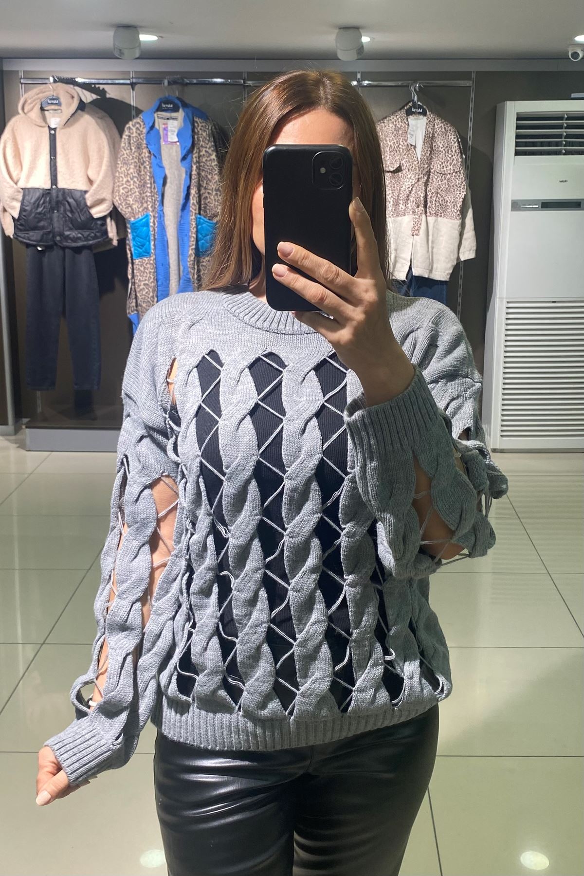 Kol Örgü Detay Ön Pencereli Triko Kazak-Gri