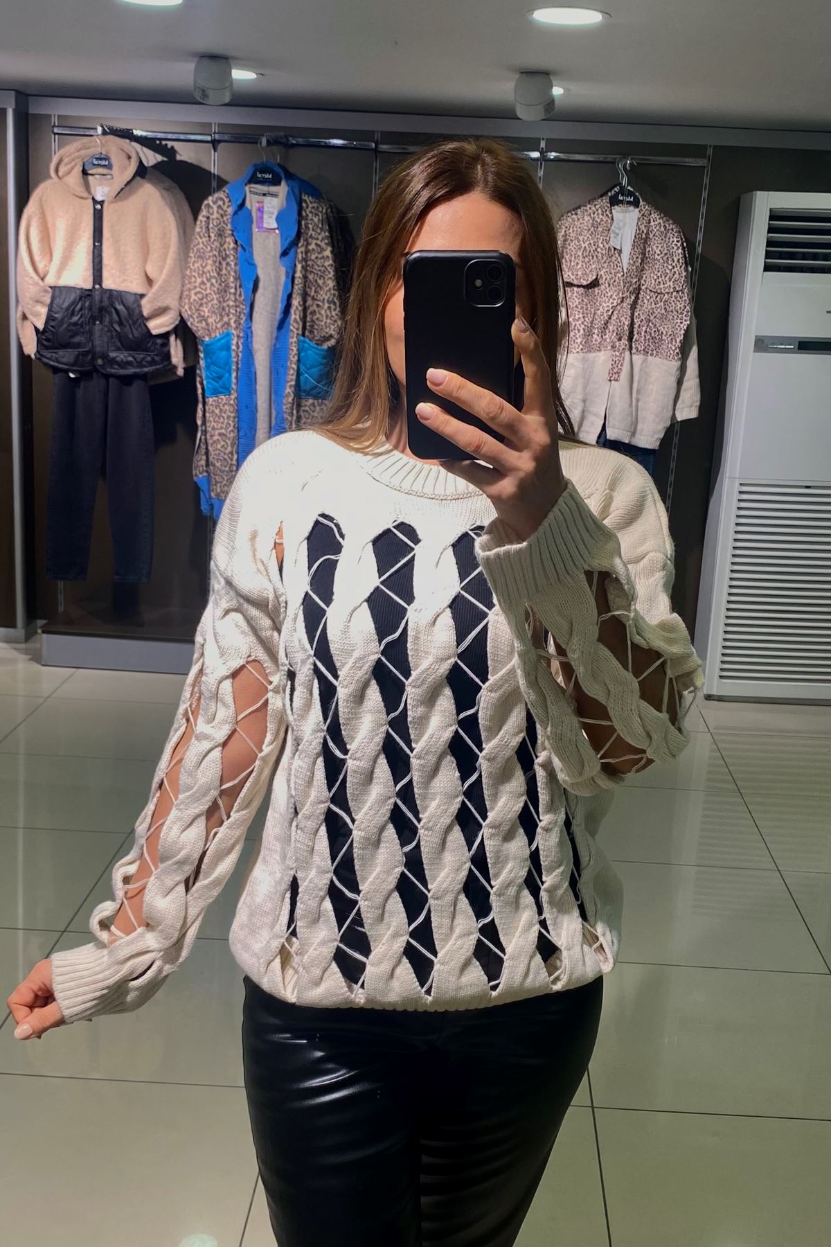 Kol Örgü Detay Ön Pencereli Triko Kazak-Krem