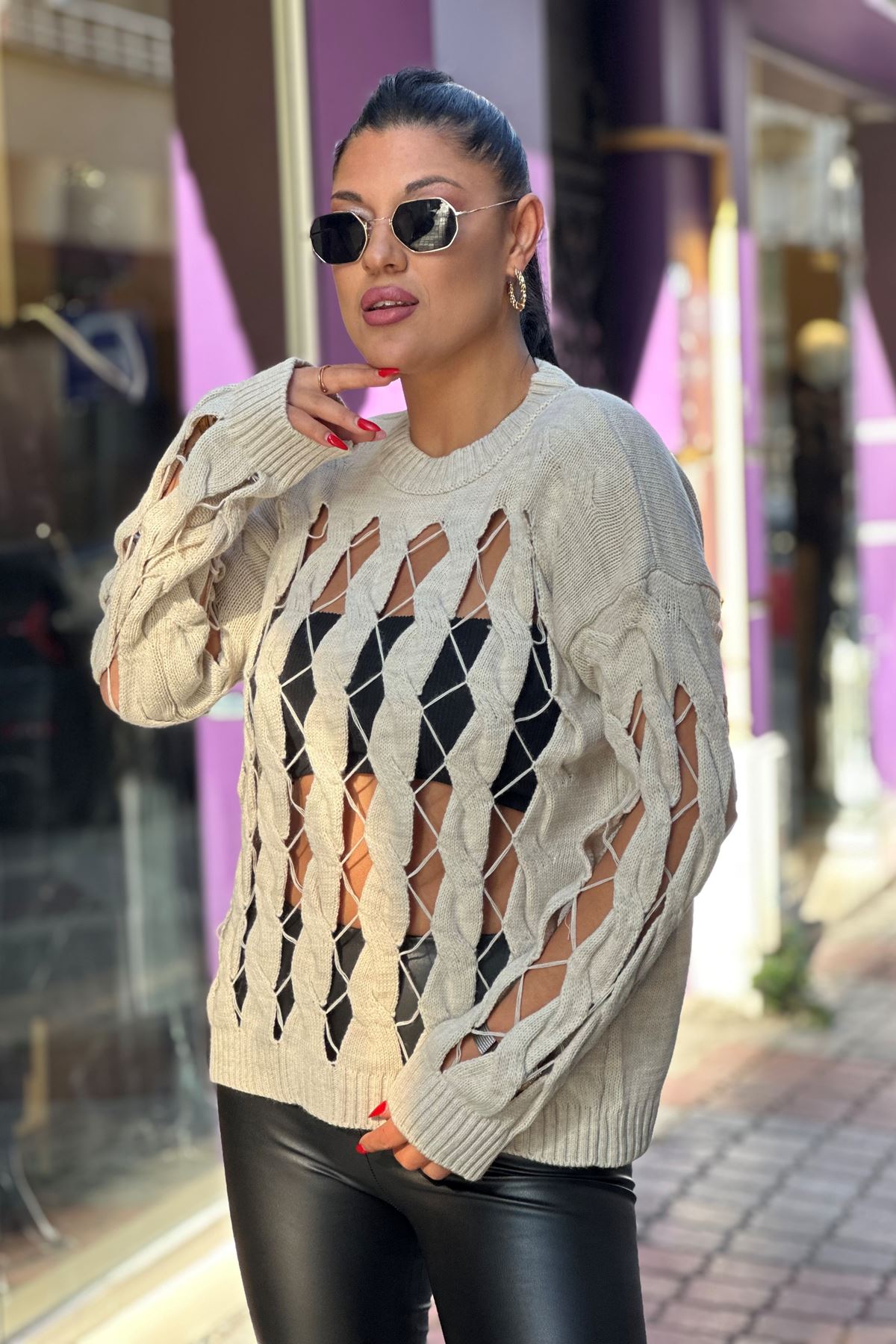 Kol Örgü Detay Ön Pencereli Triko Kazak-Krem
