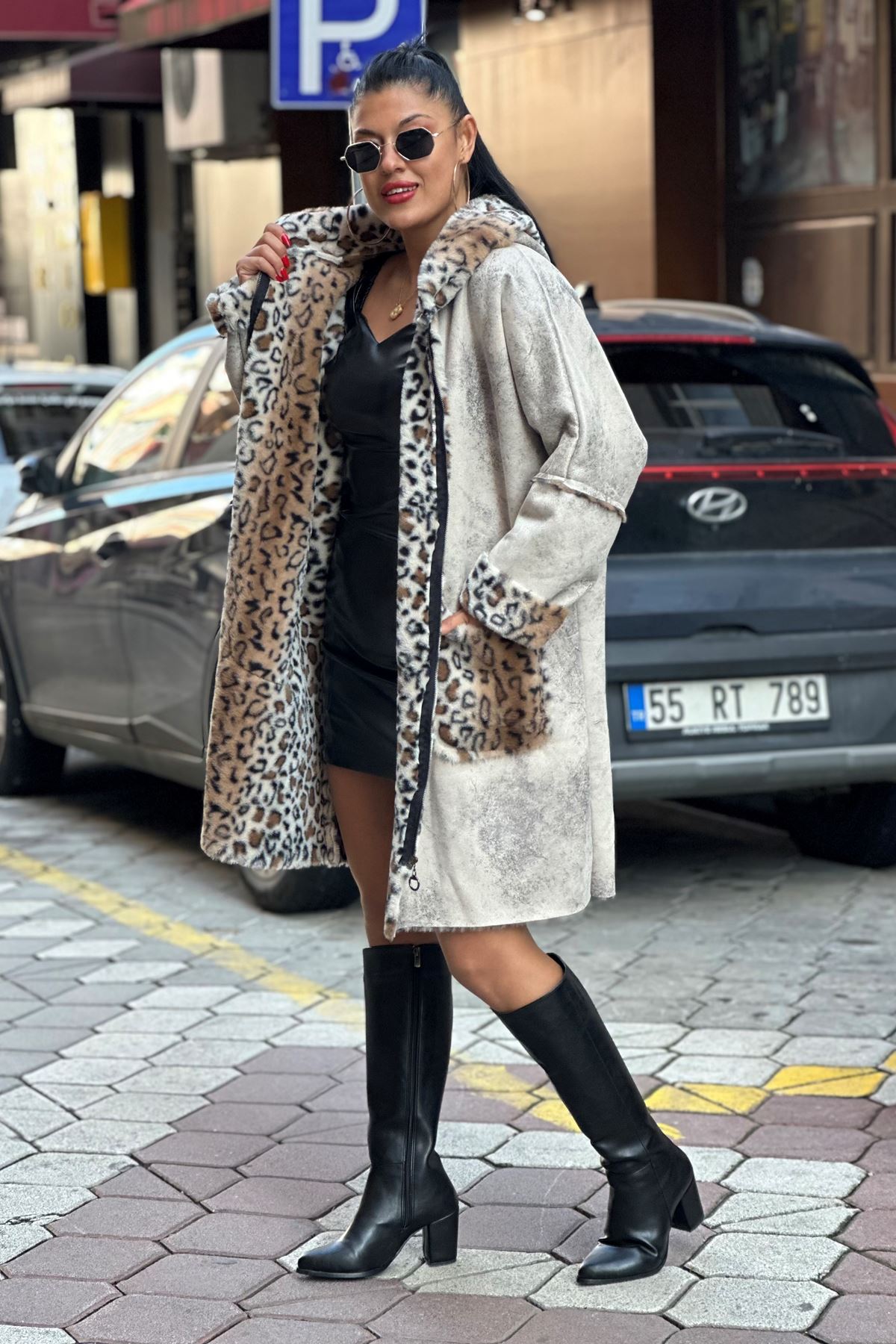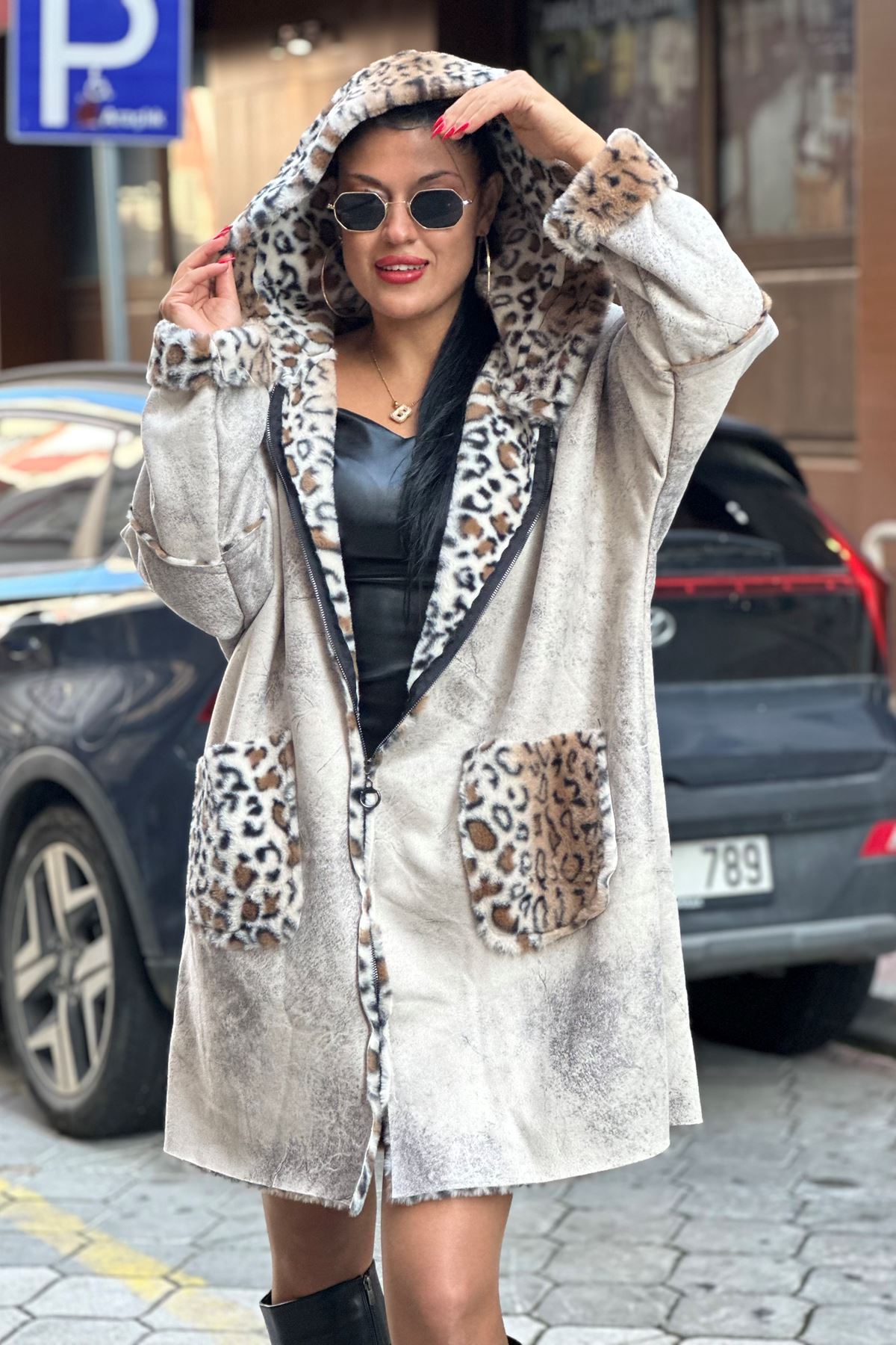 EFSANE 001 LEOPAR DESENLİ FERMUAR DETAYLI UZUN KABAN