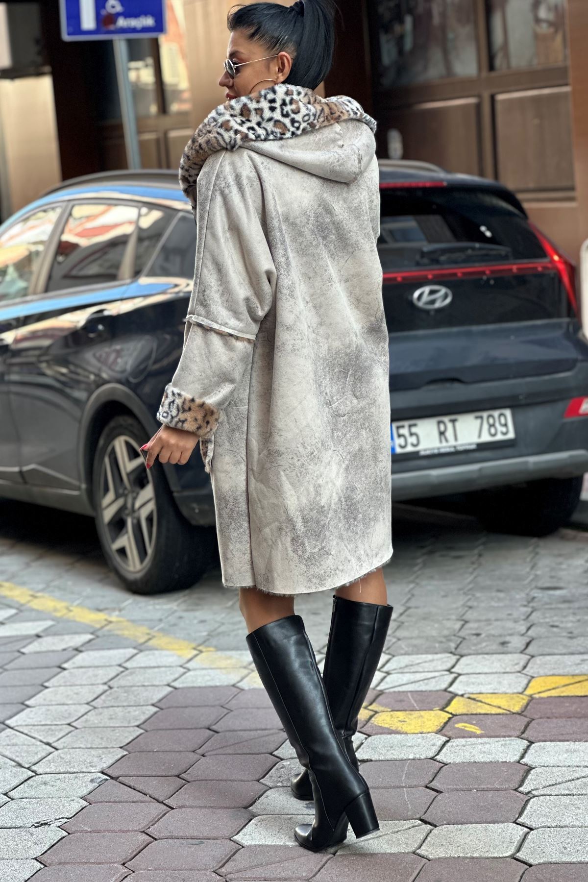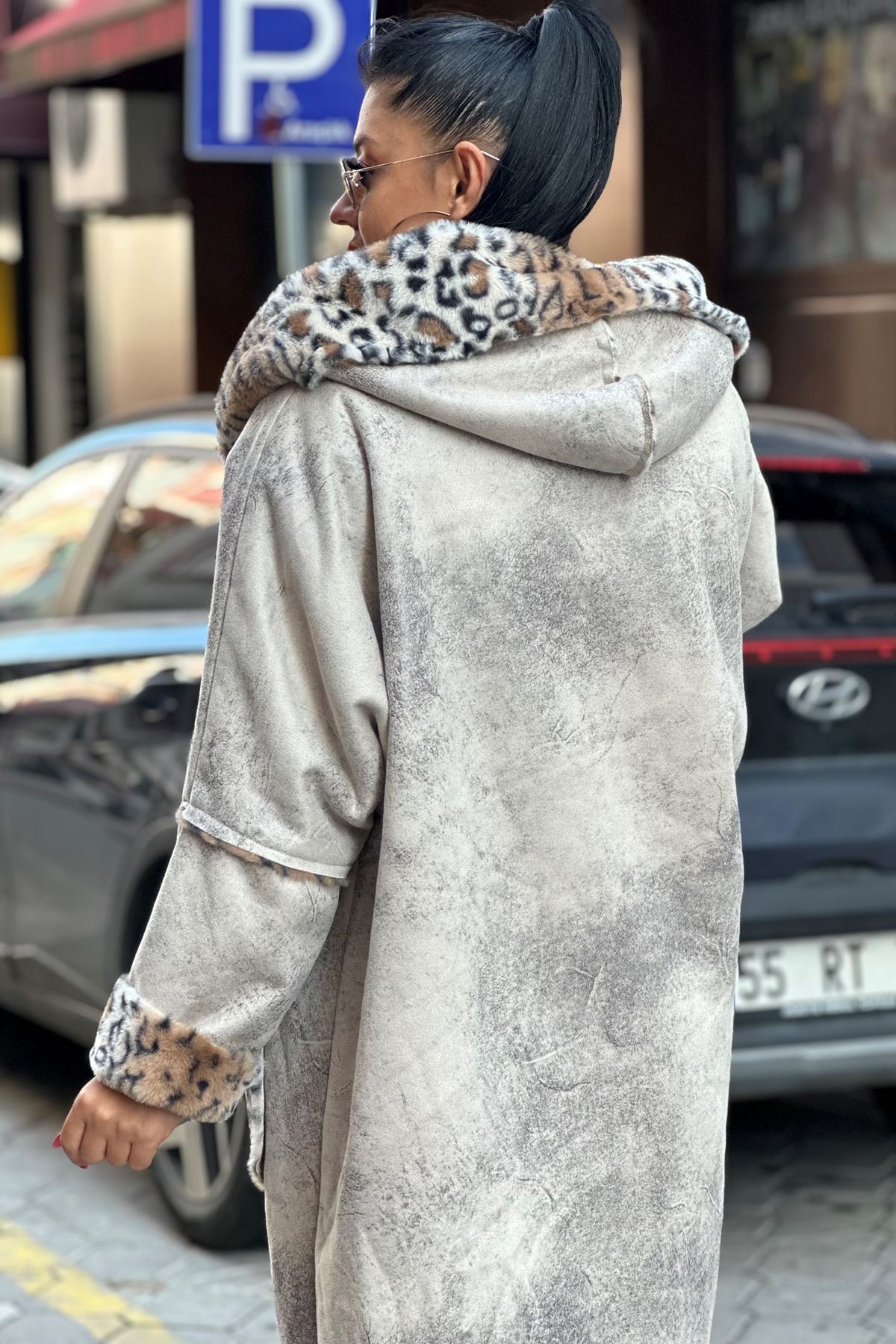 İçi Leopar Desen İthal Kürk Uzun Kaban-Krem