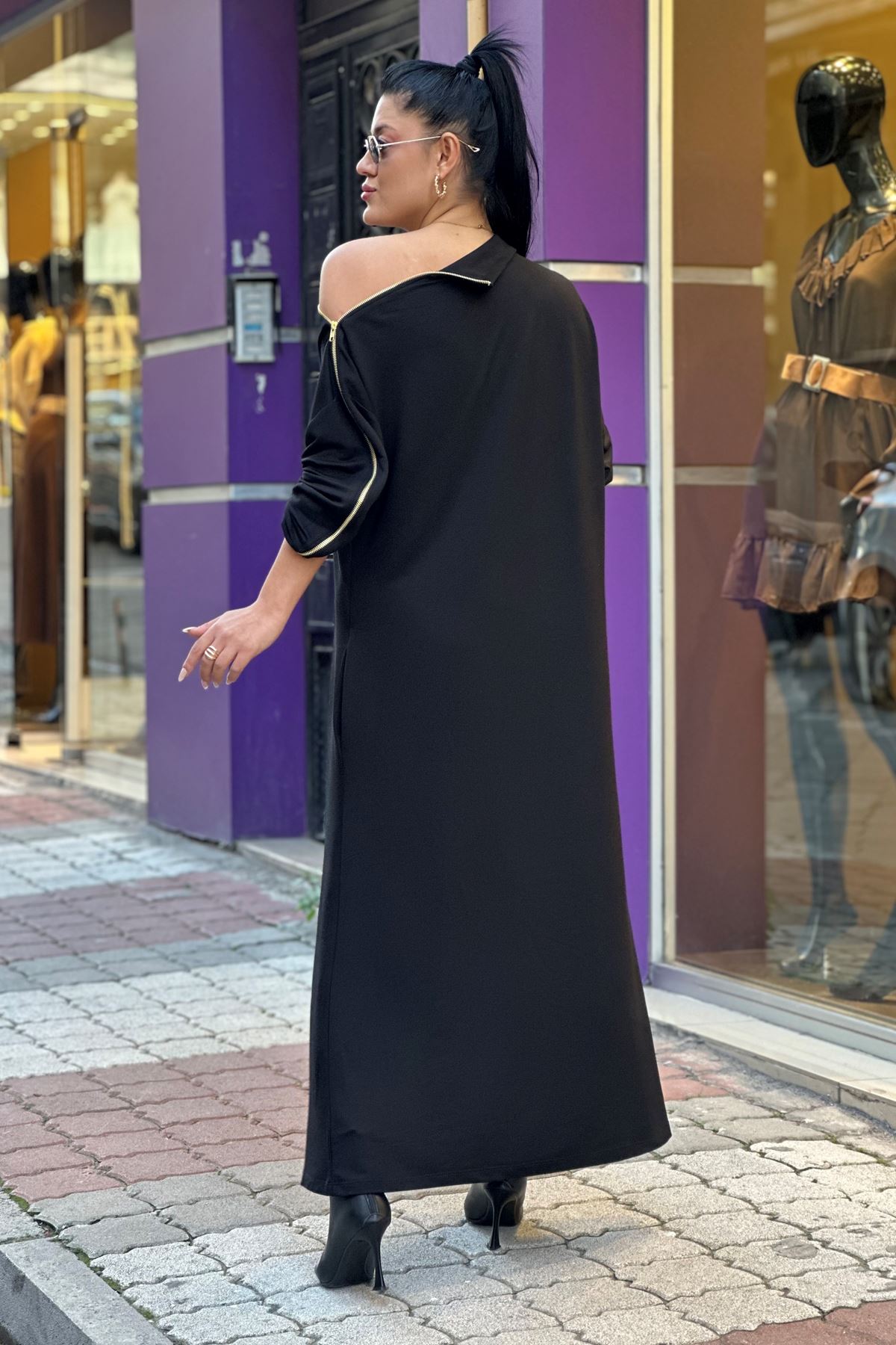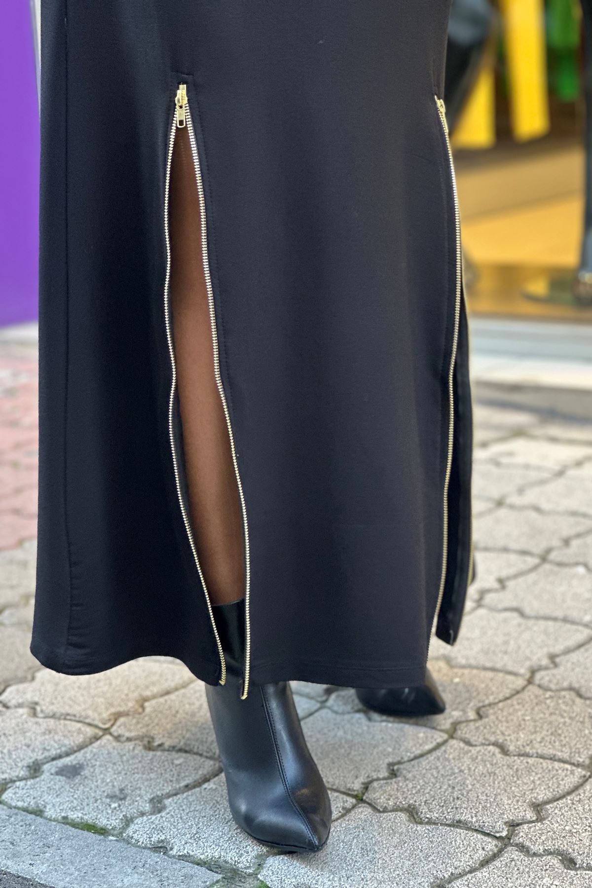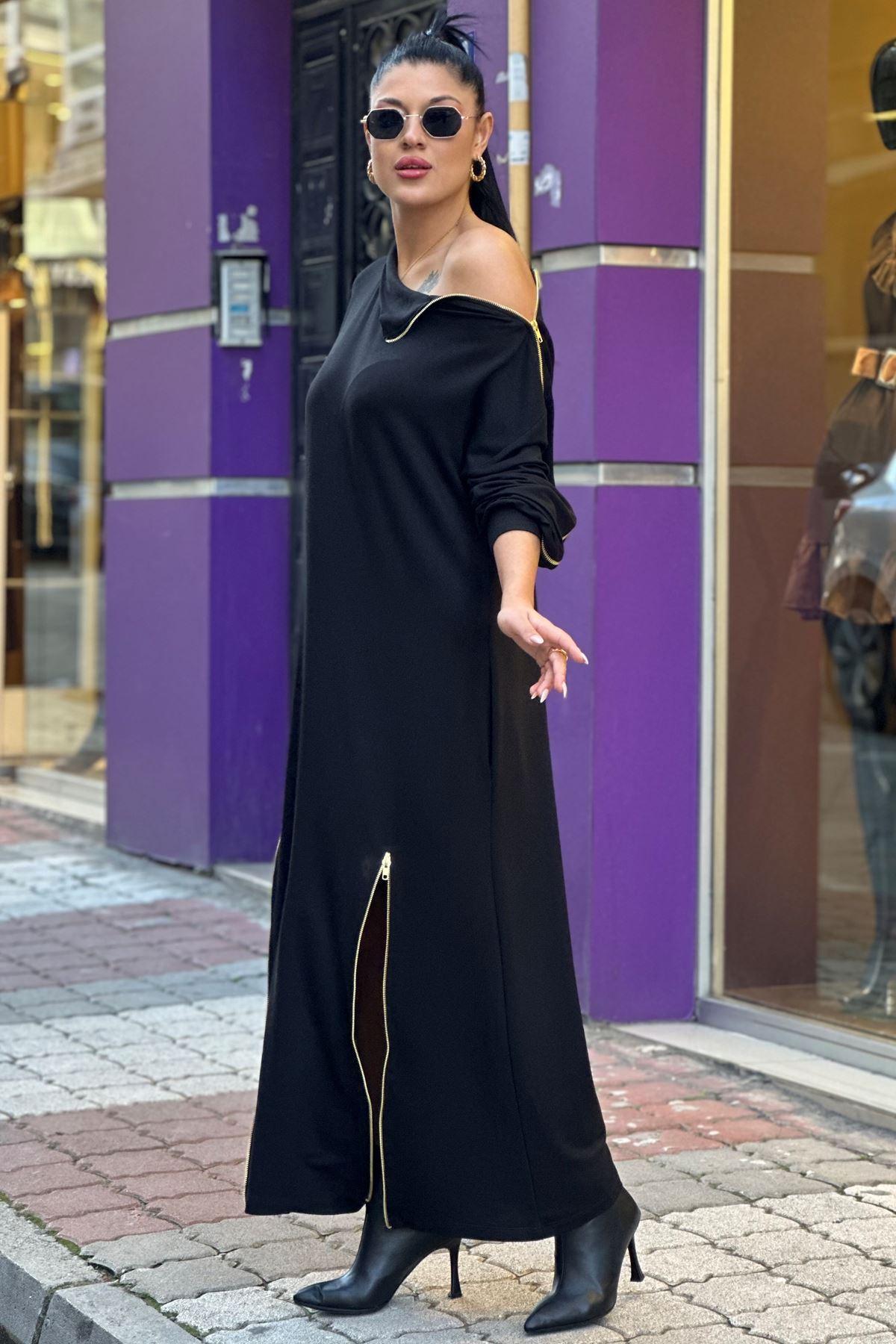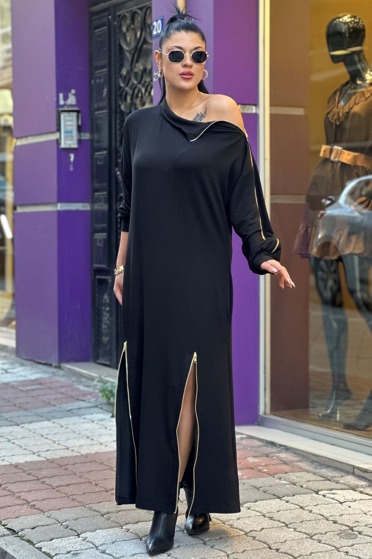 Omuz Ve Eteği Fermuarlı Midi Boy Elbise-Siyah