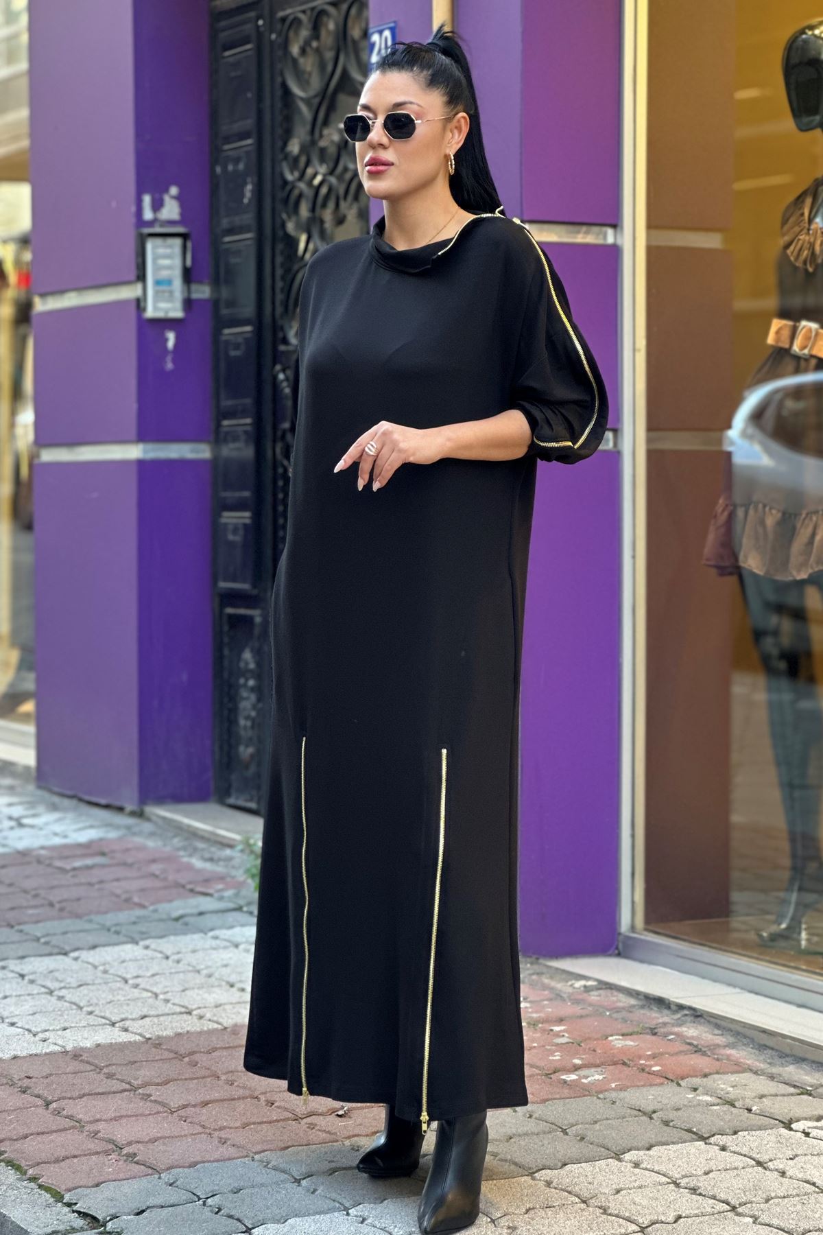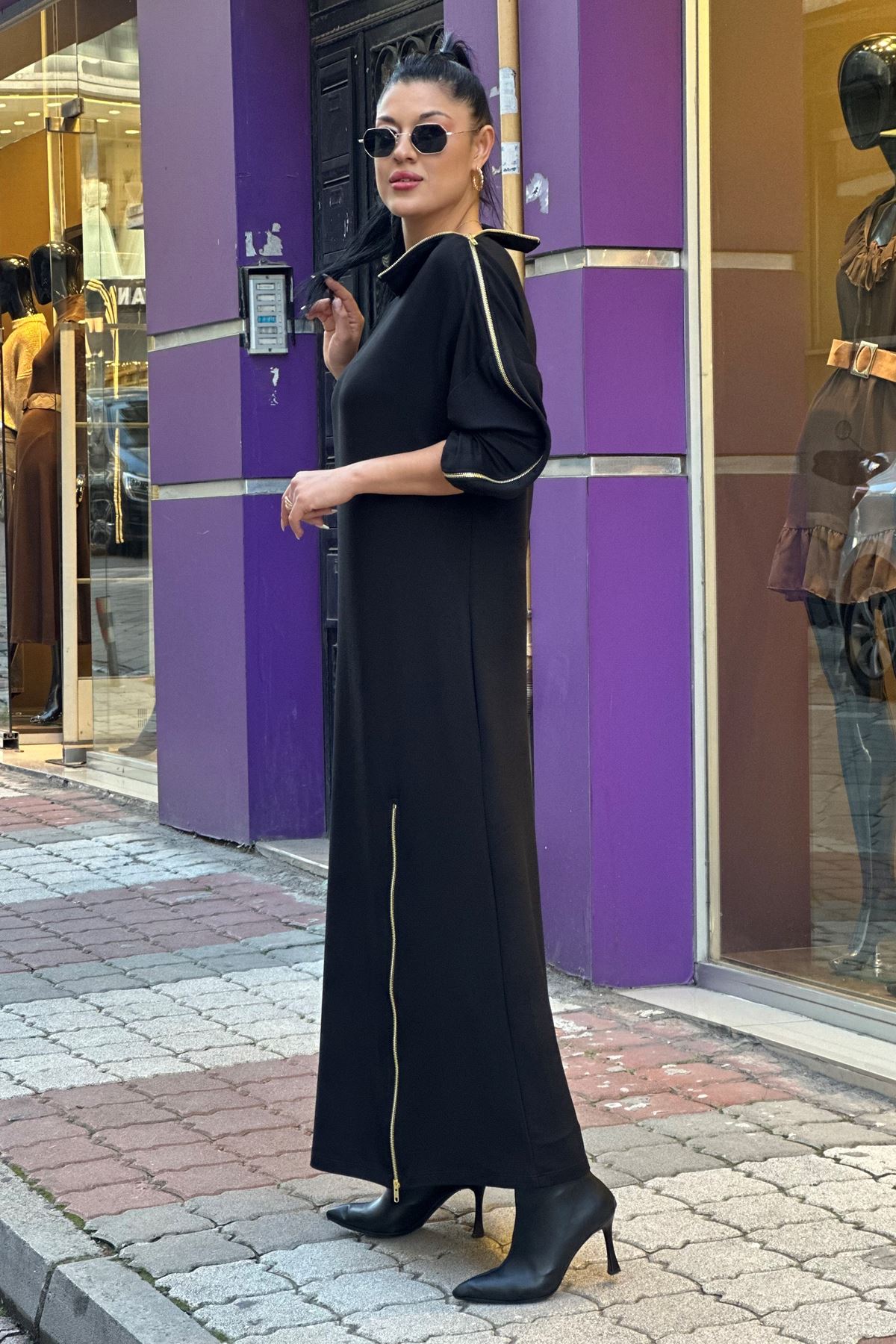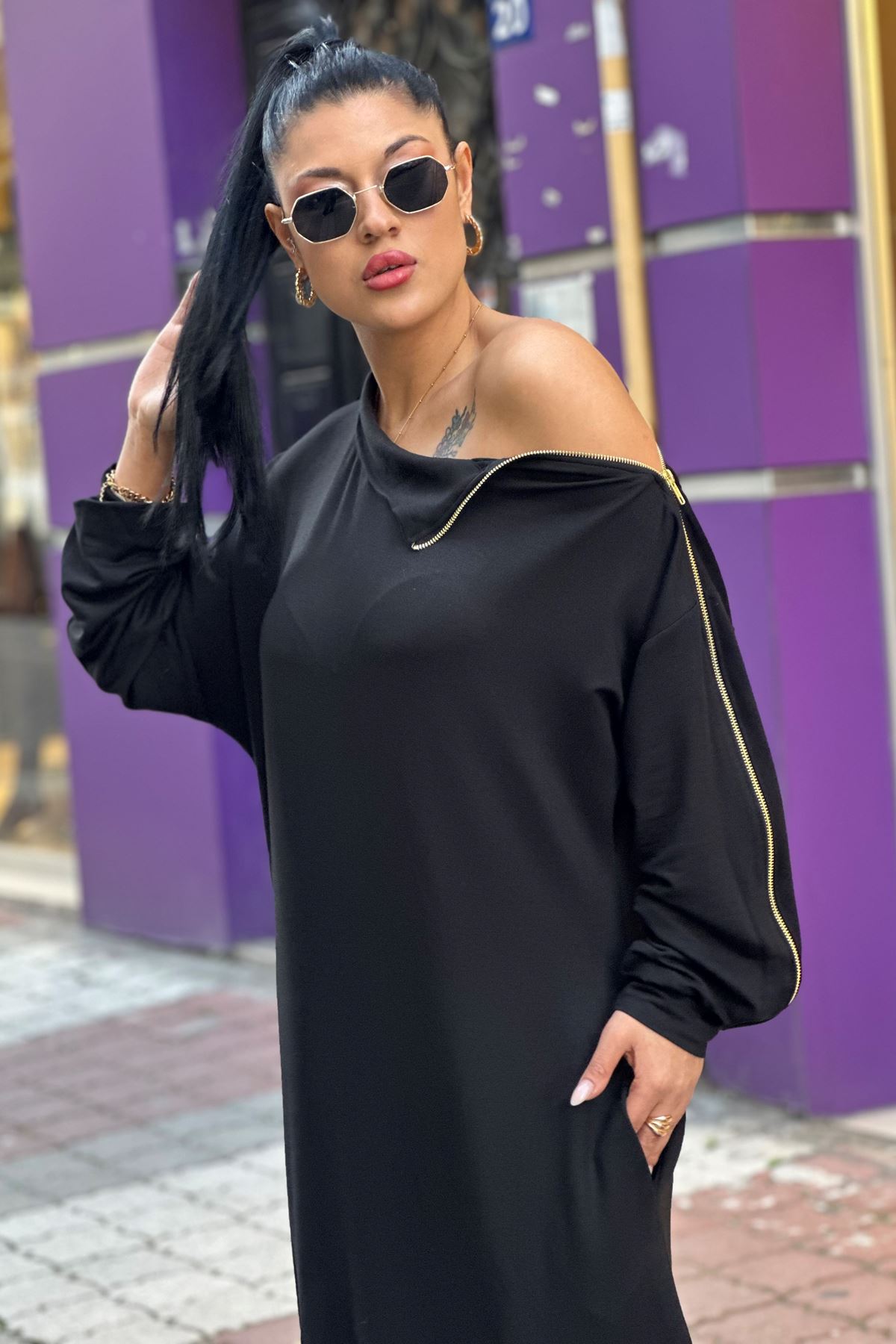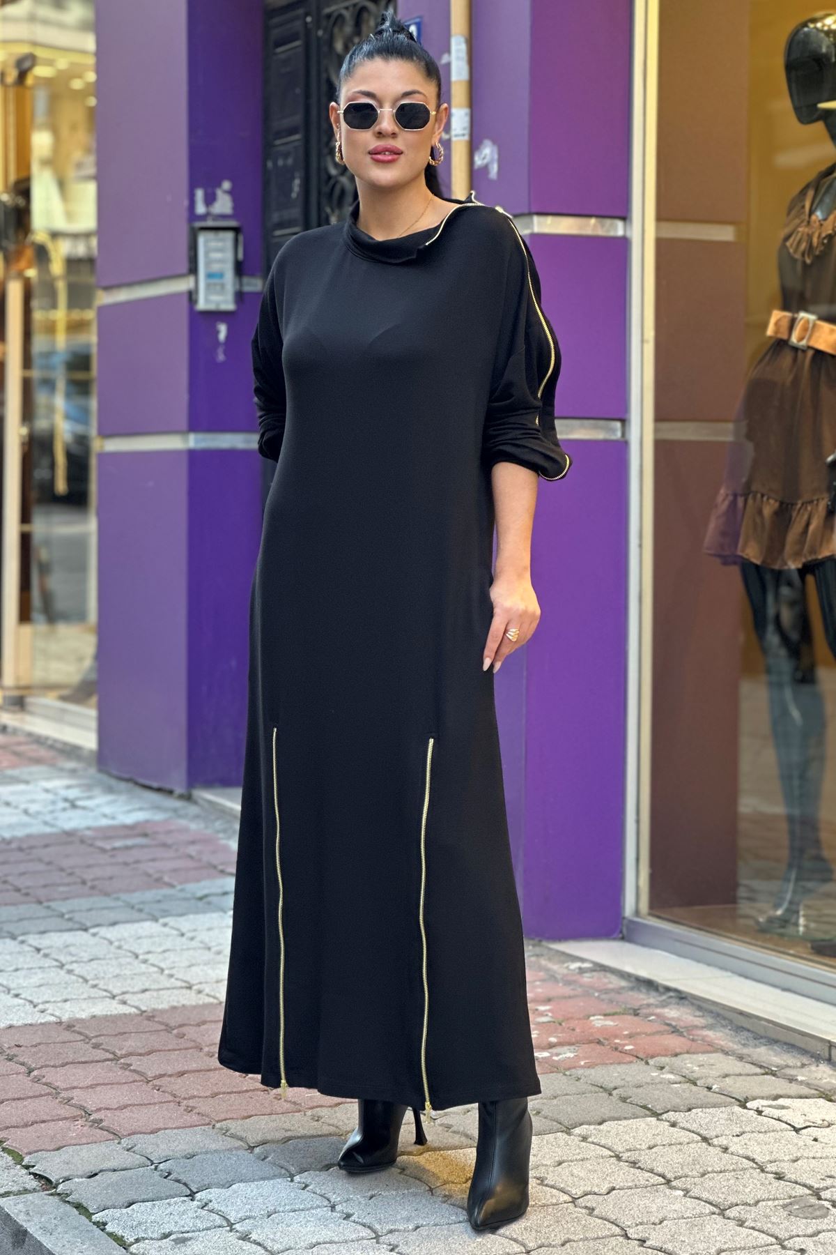 Omuz Ve Eteği Fermuarlı Midi Boy Elbise-Siyah