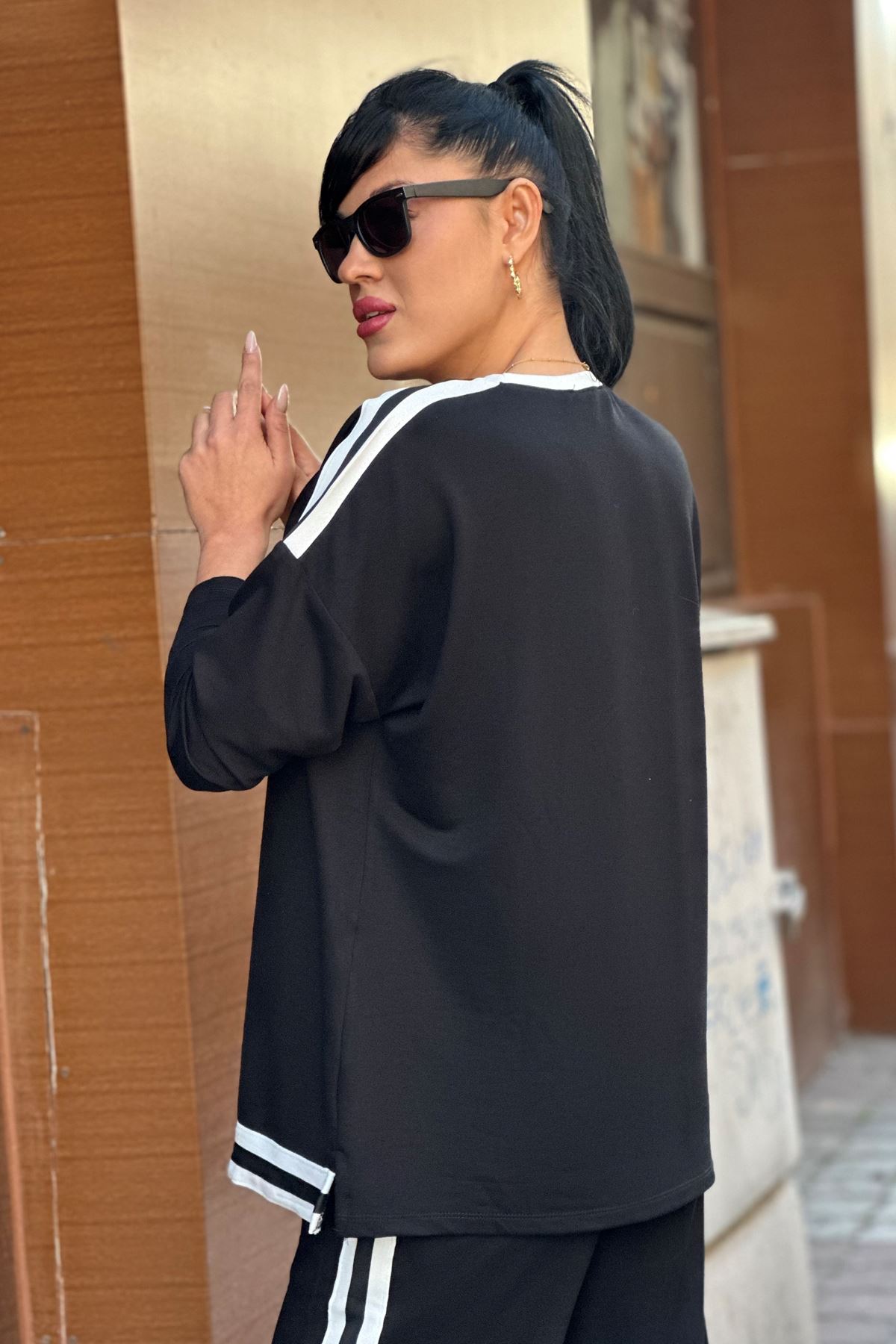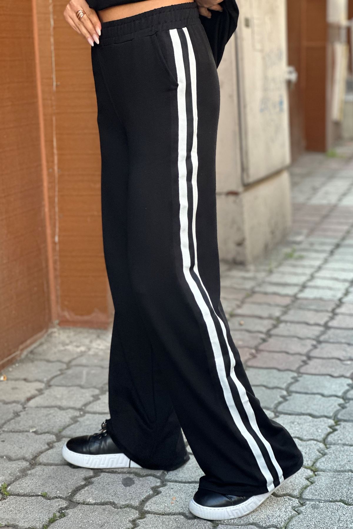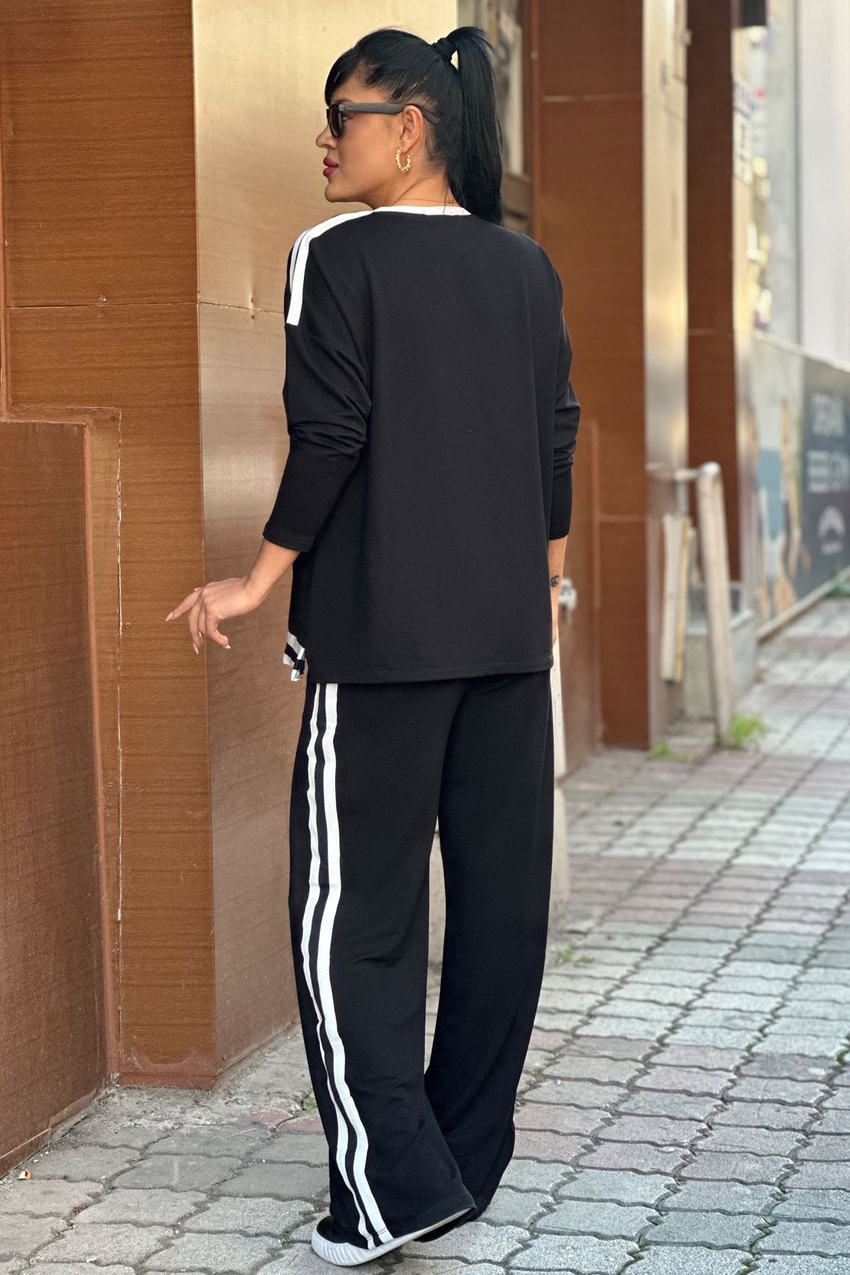 Omuzları Şerit Detay Bol Paça İkili Takım-Siyah