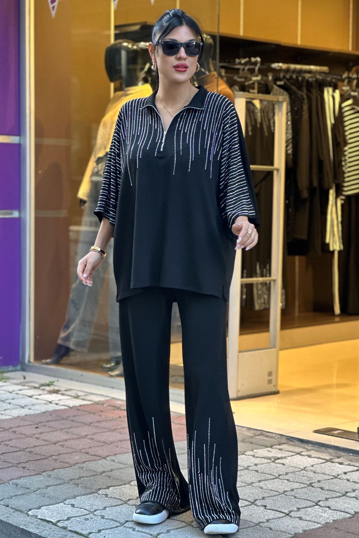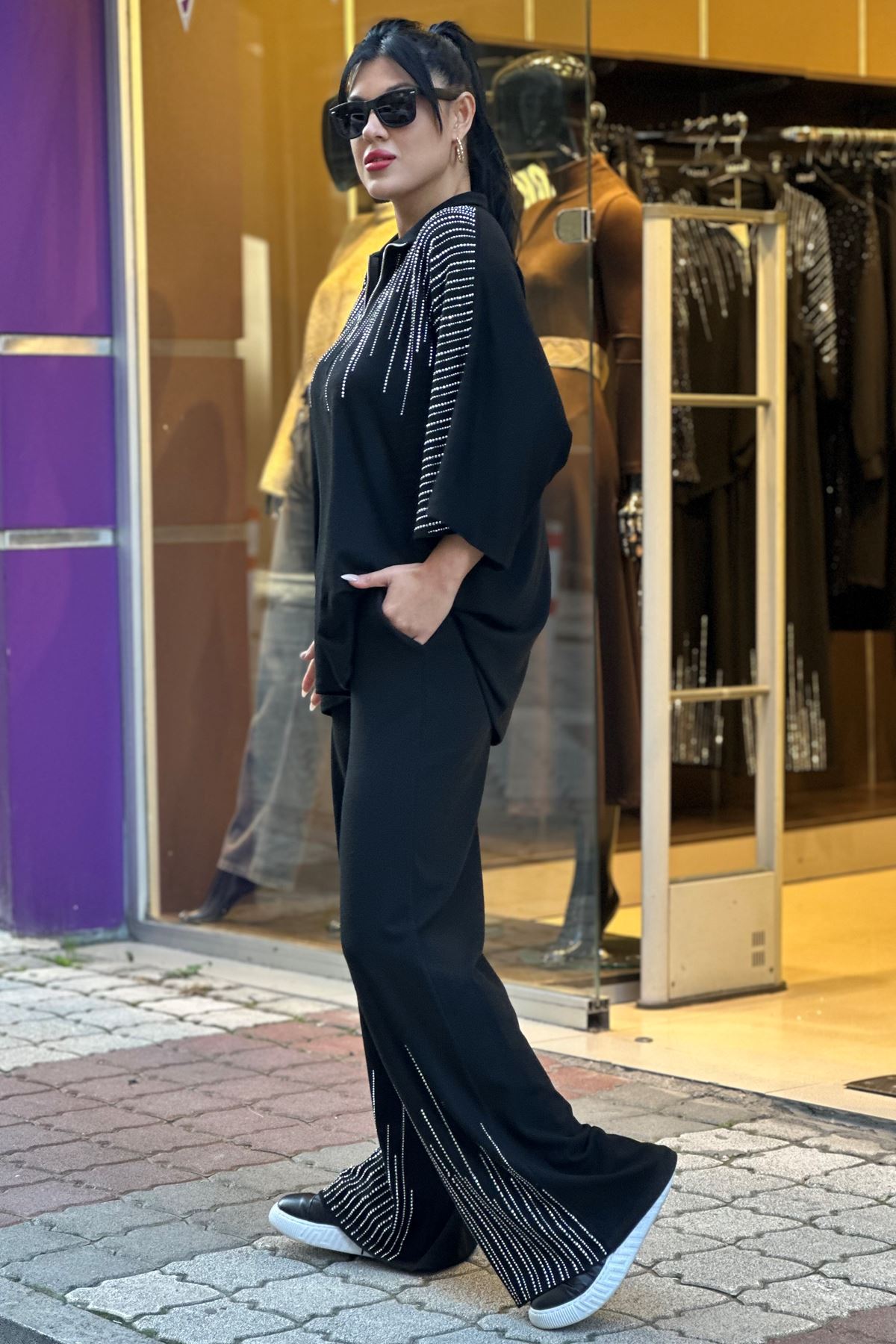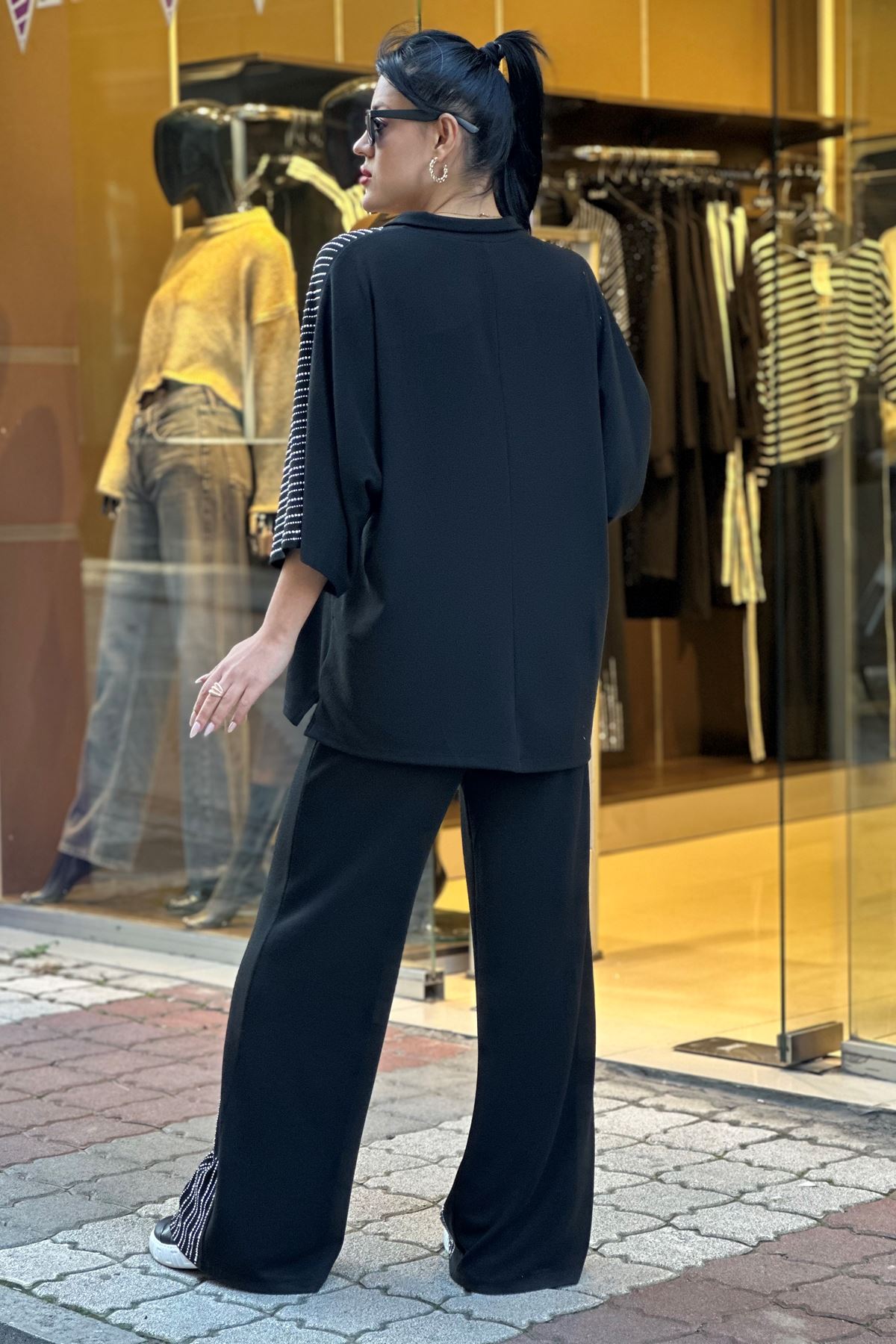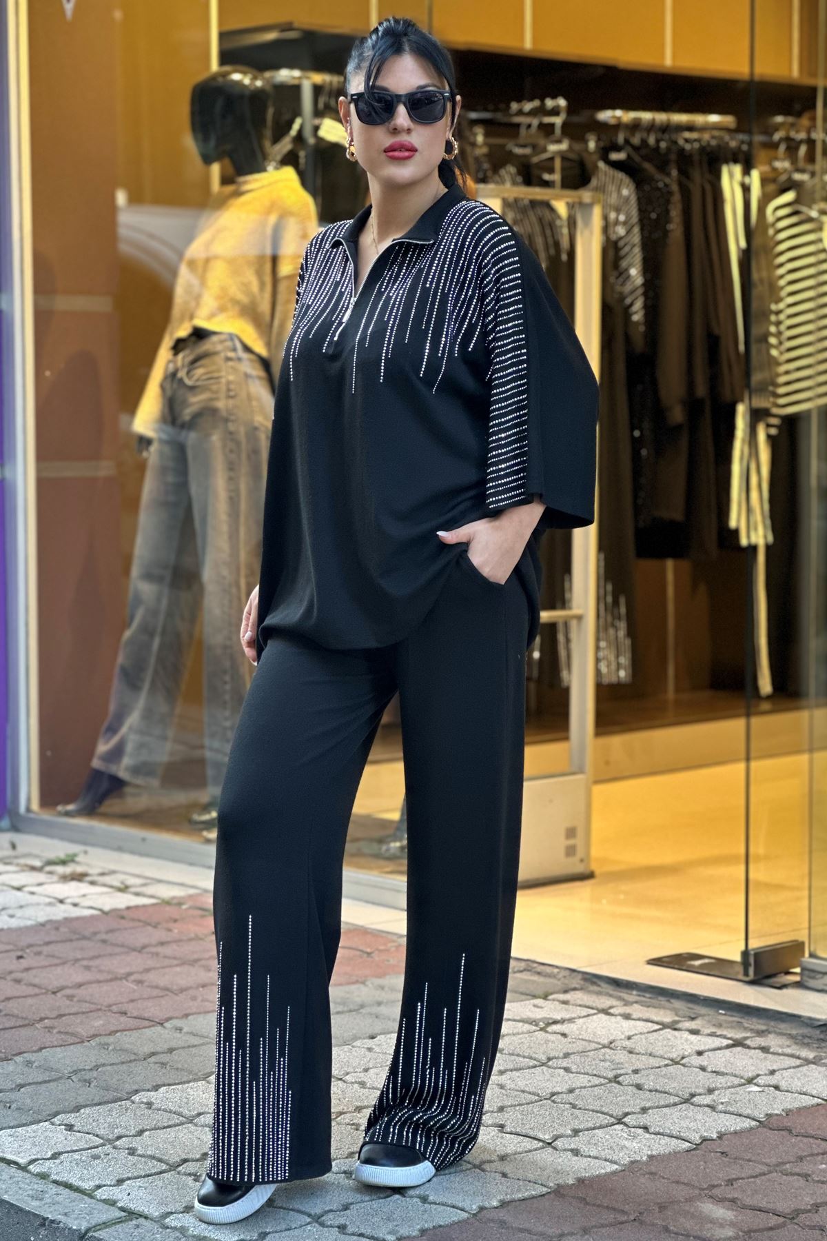 Omuzları ve Paçaları Taşlı İkili Takım-Siyah
