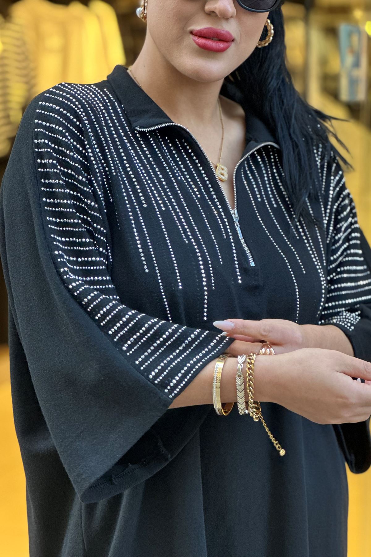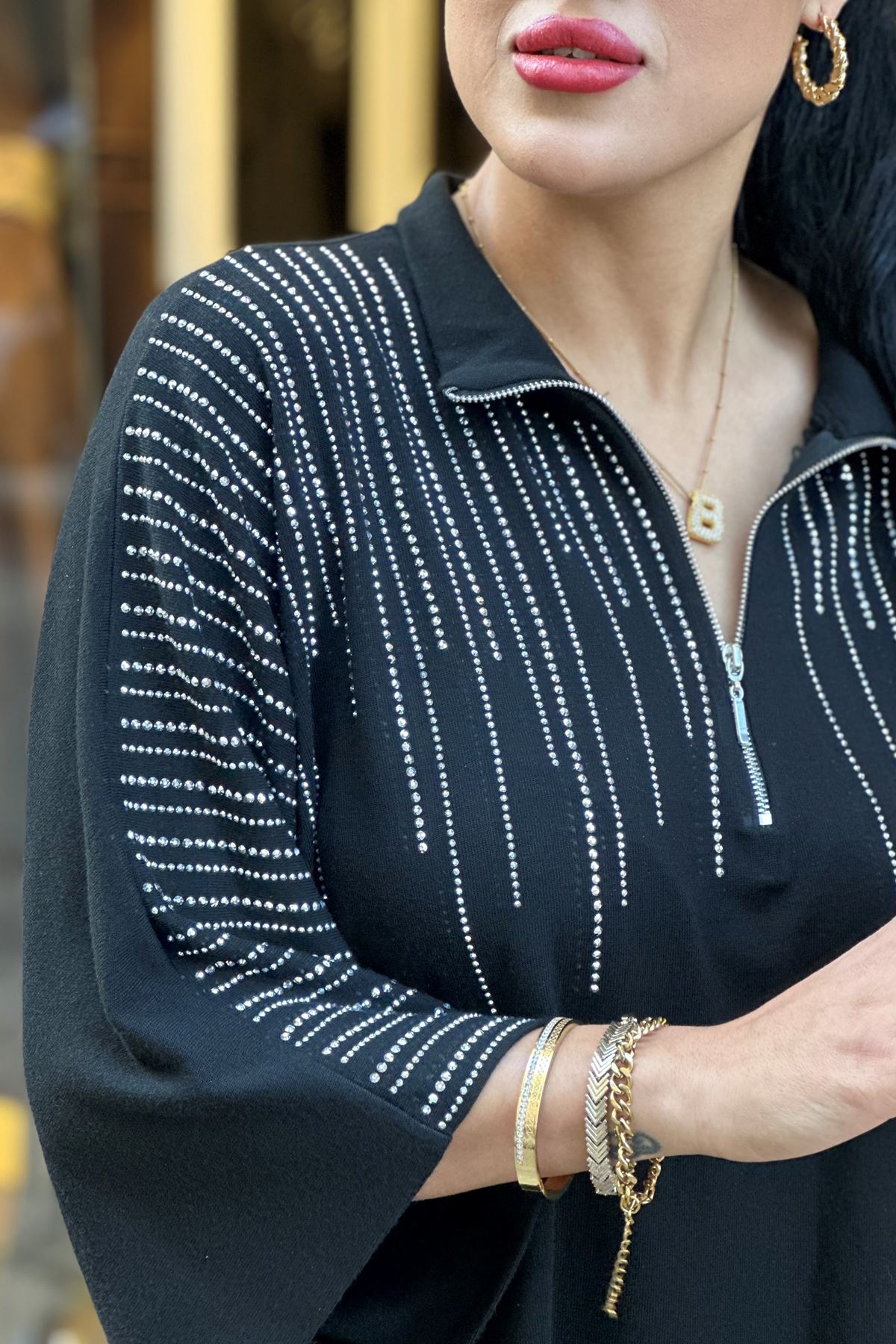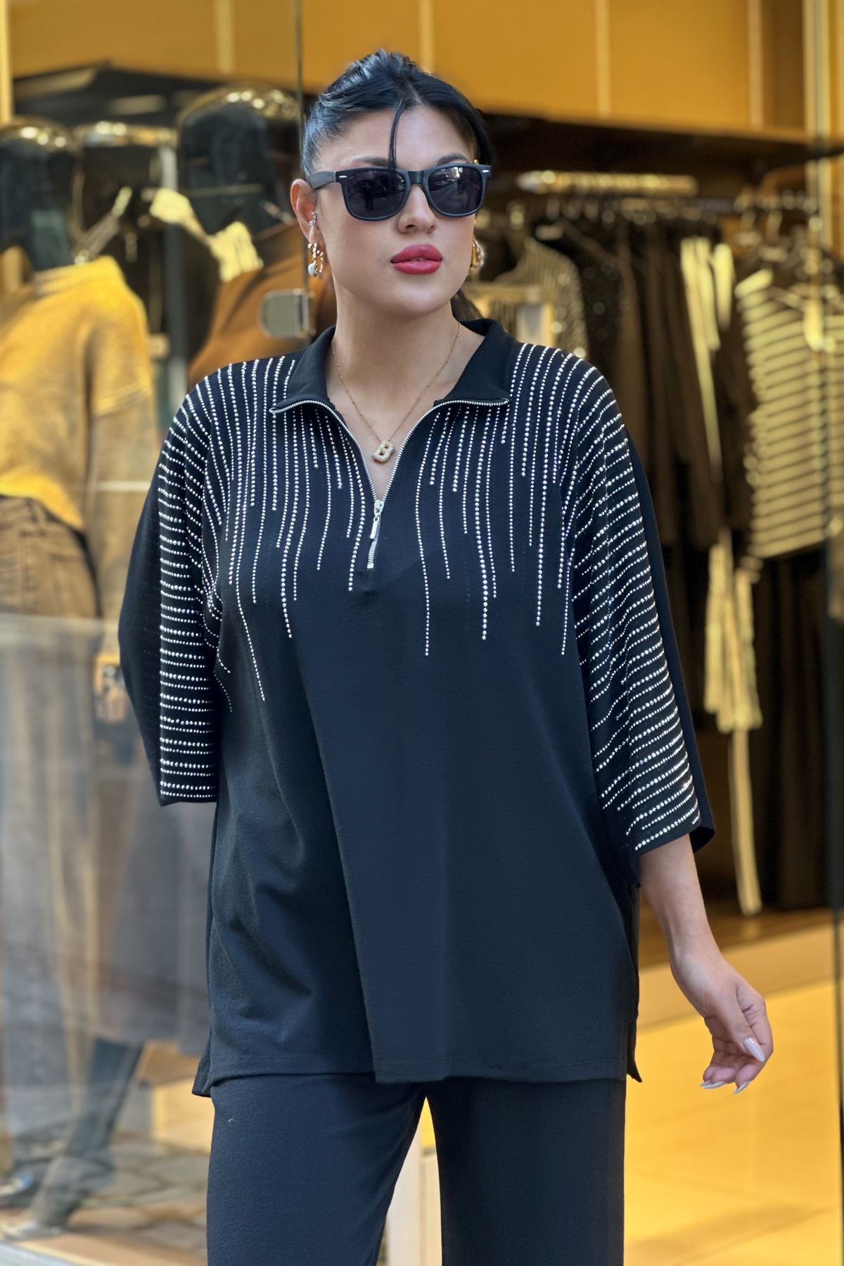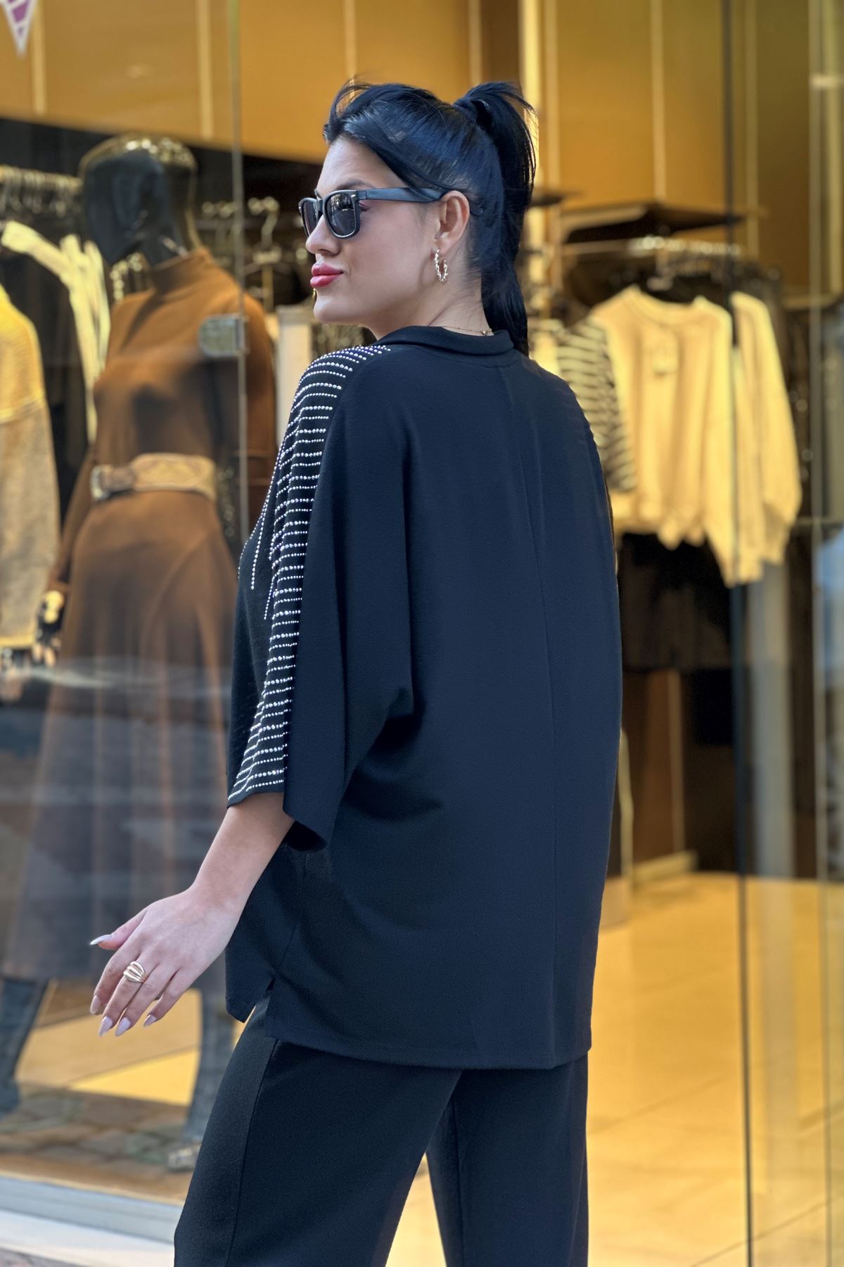 Omuzları ve Paçaları Taşlı İkili Takım-Siyah