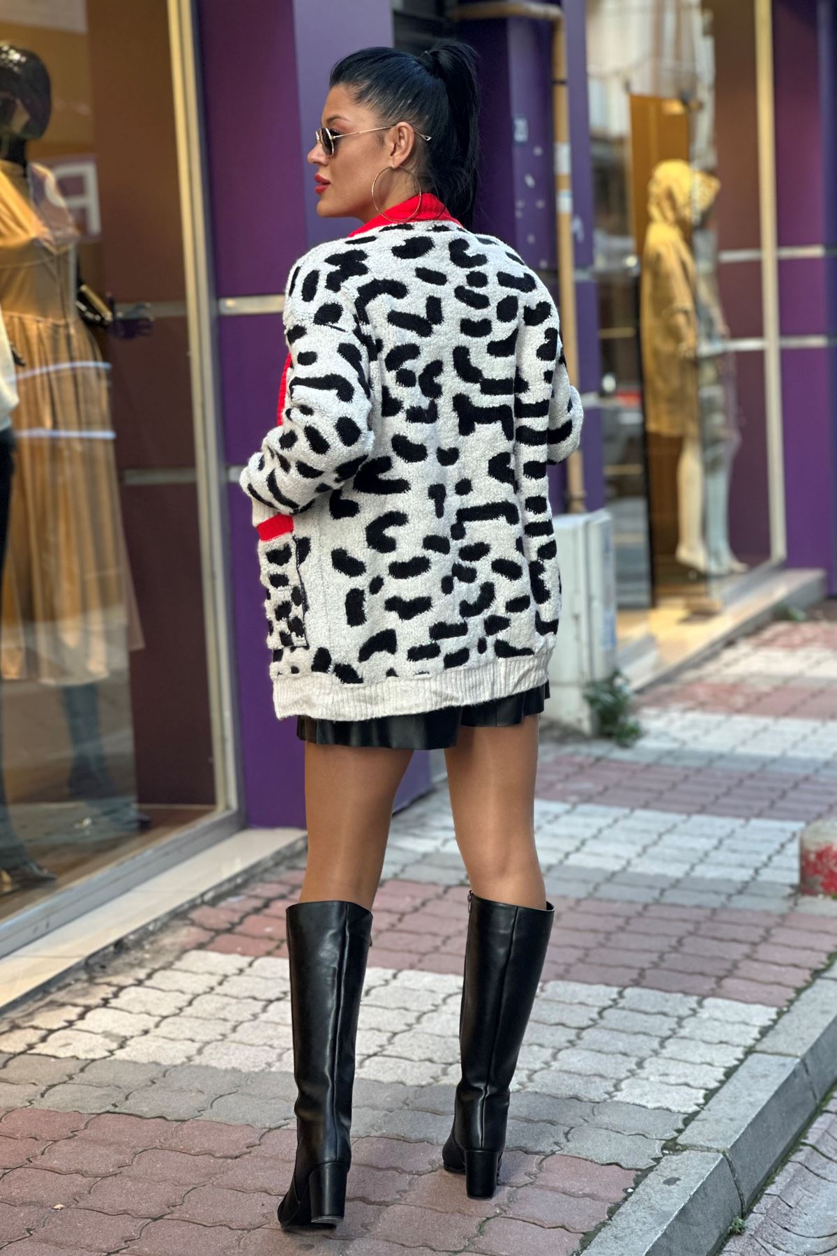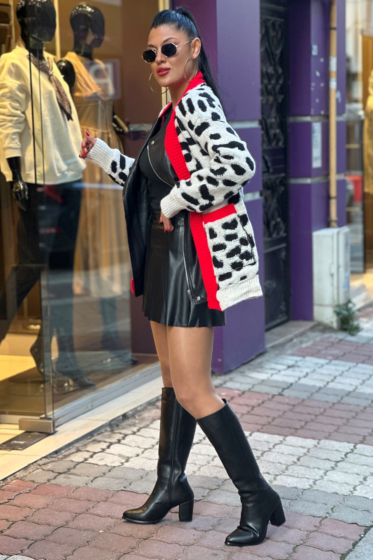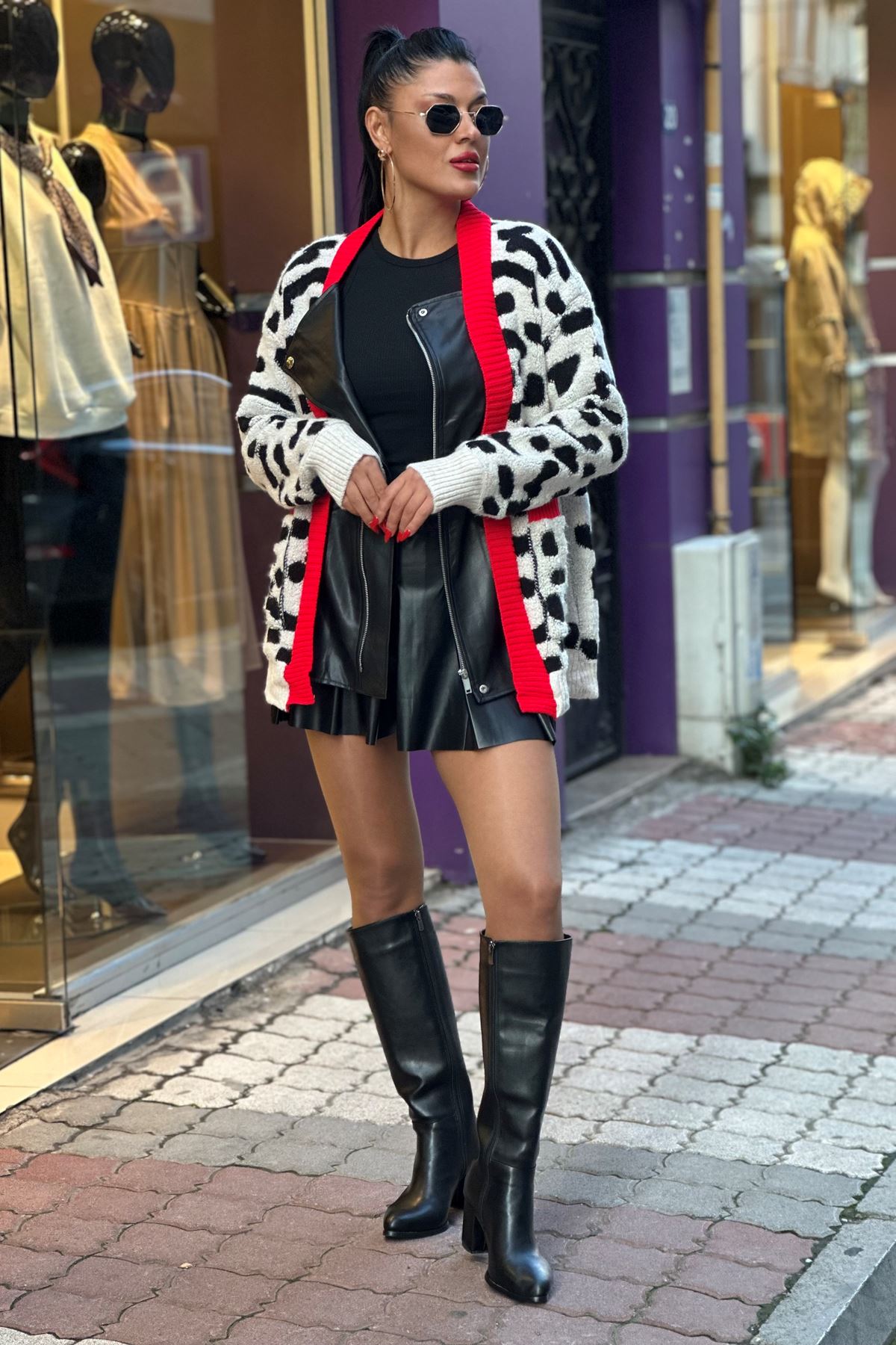 Dalmaç Desenli Deri Fermuar Detay Hırka-Krem