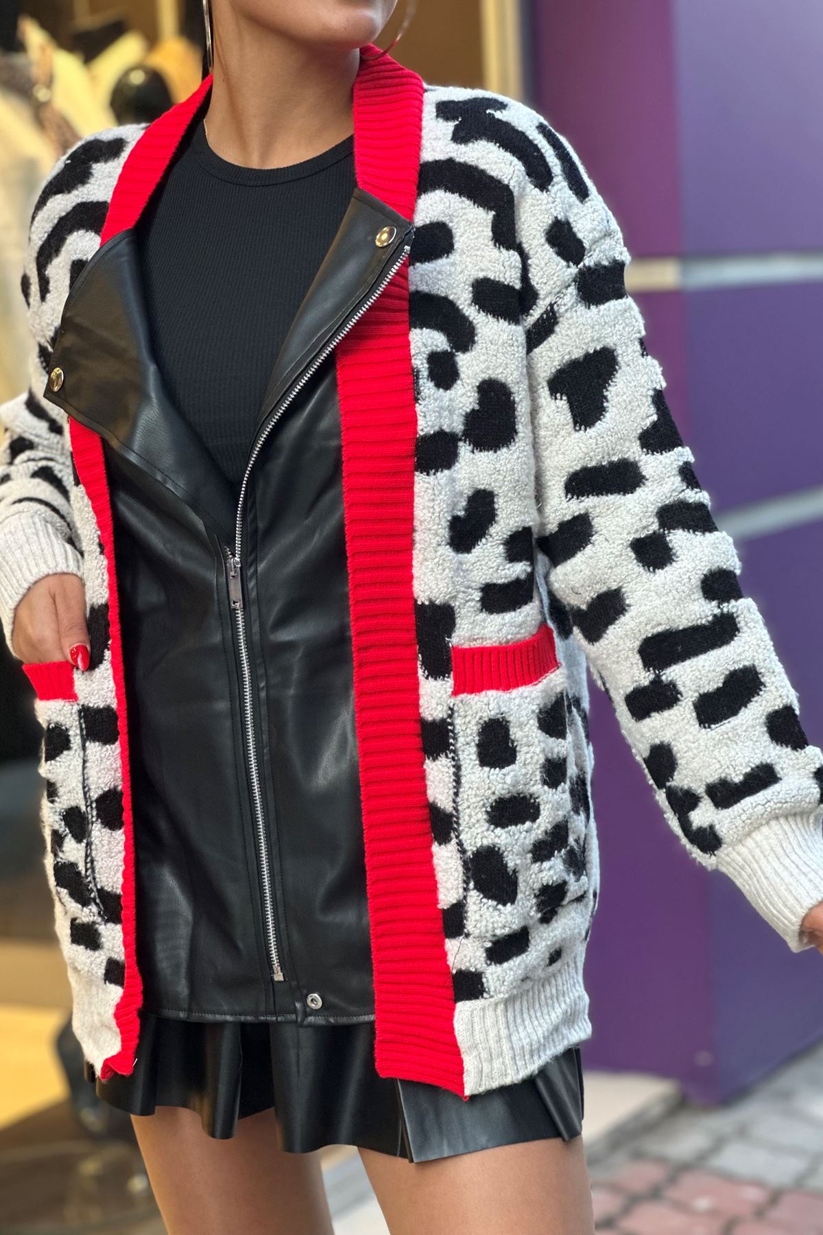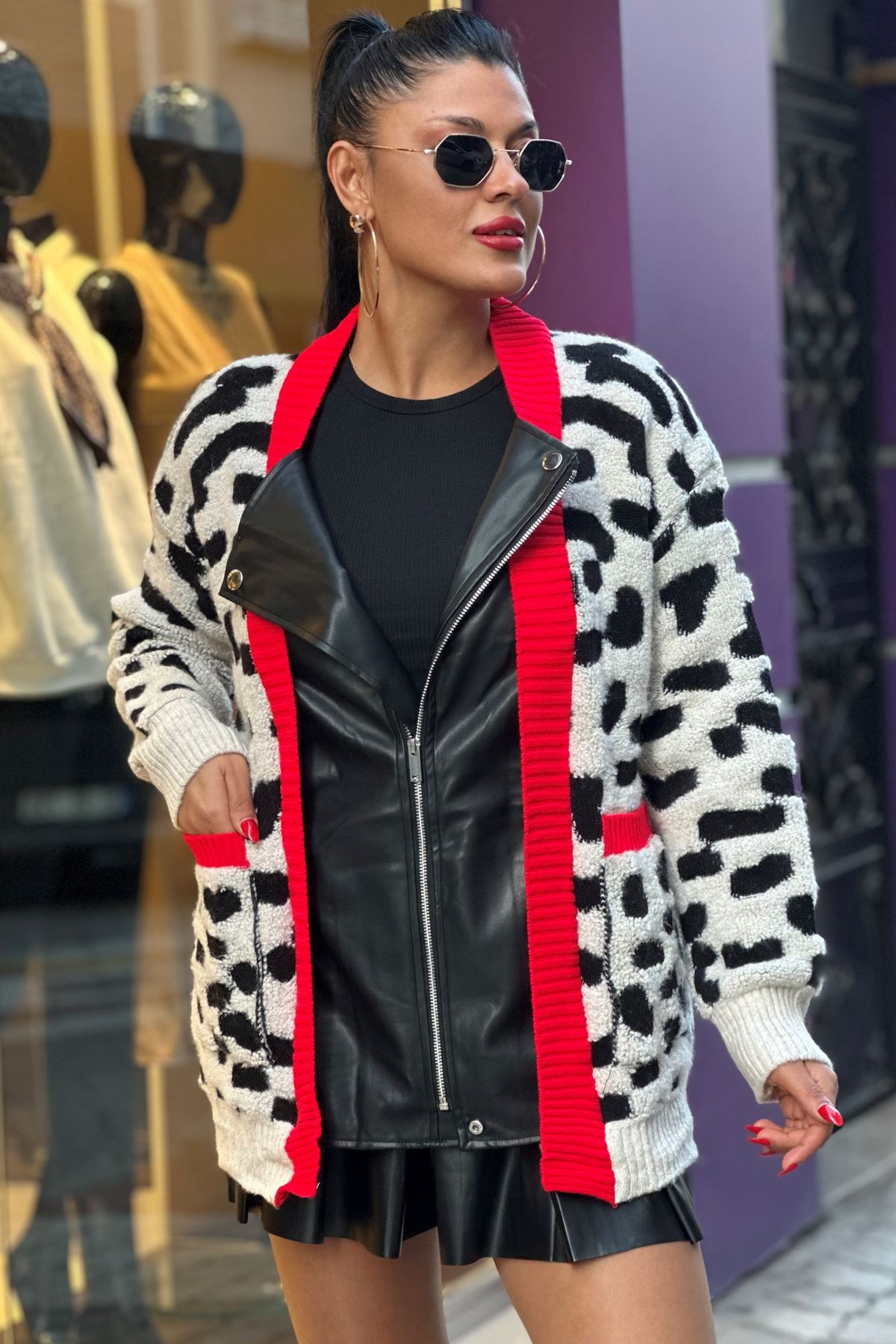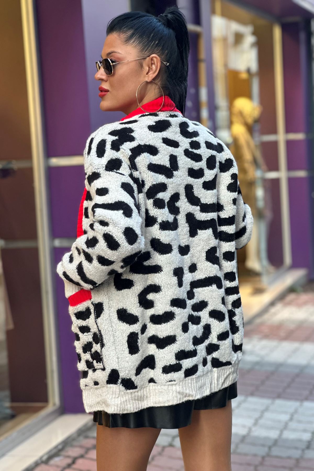 Dalmaç Desenli Deri Fermuar Detay Hırka-Krem