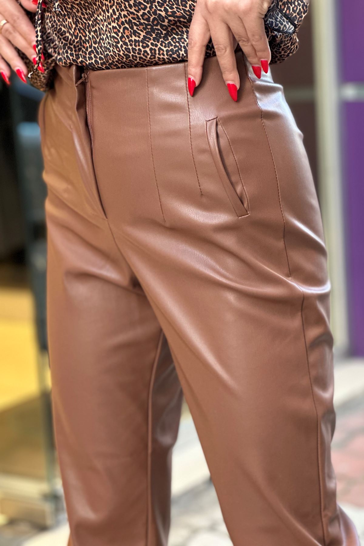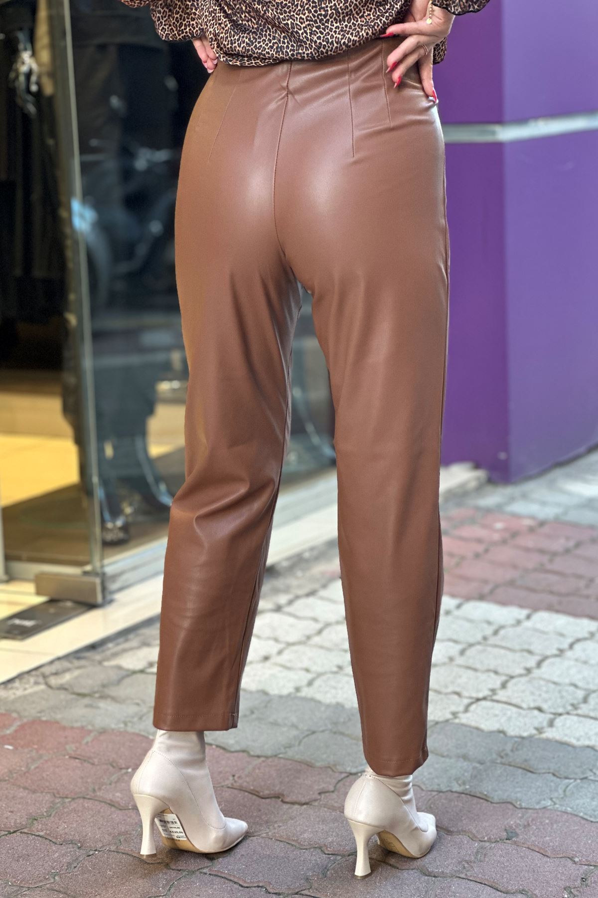 Ön Dikiş Detaylı Yüksek Bel Deri Pantolon-Taba