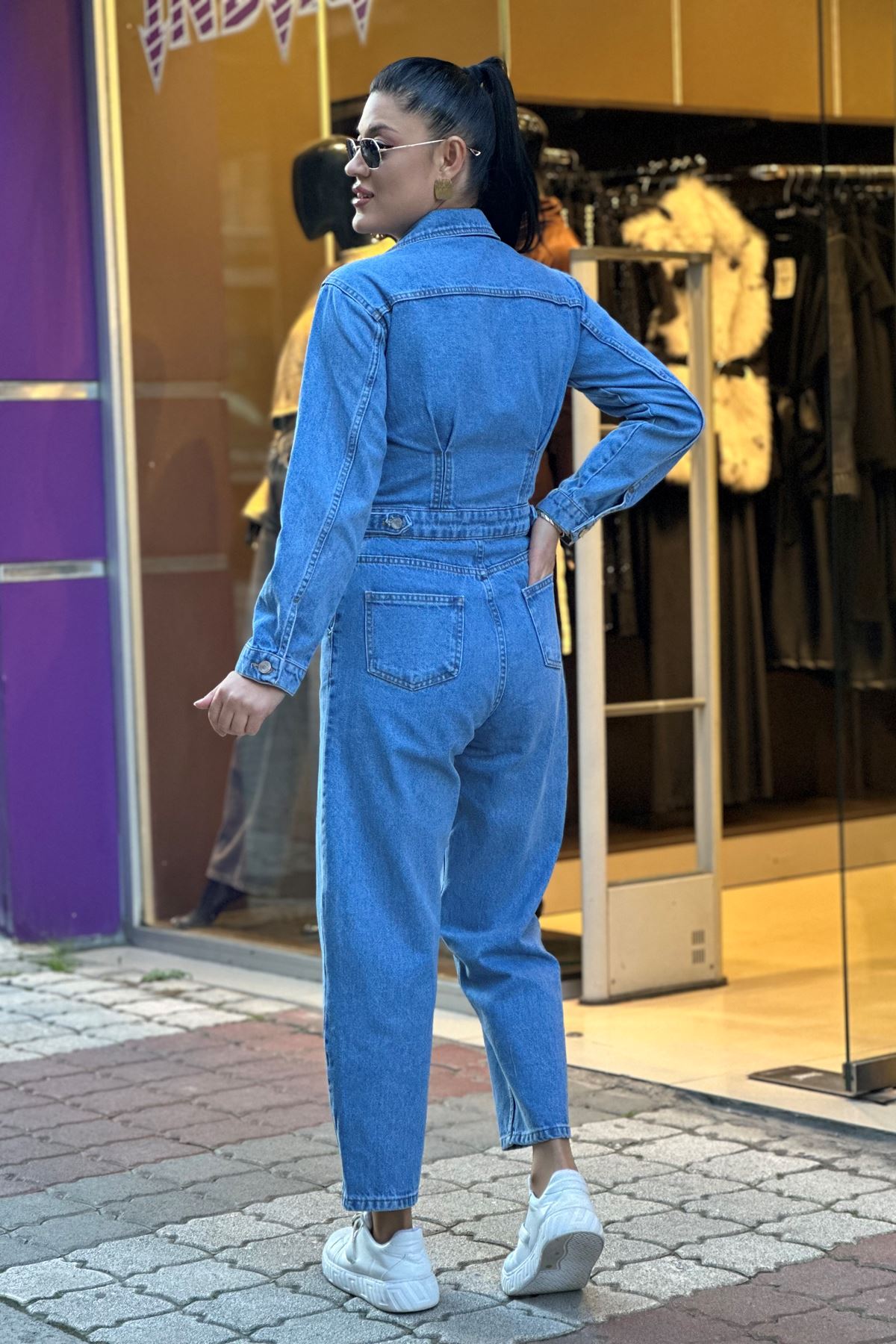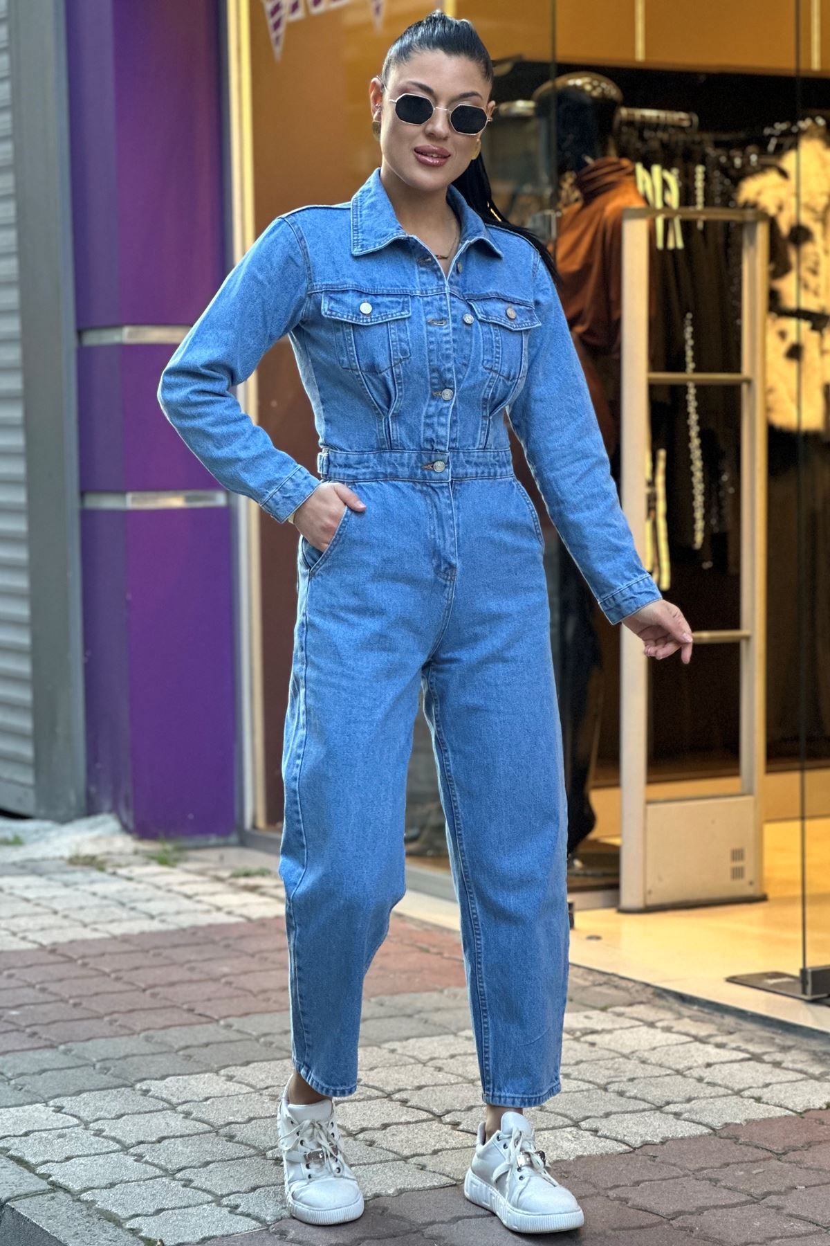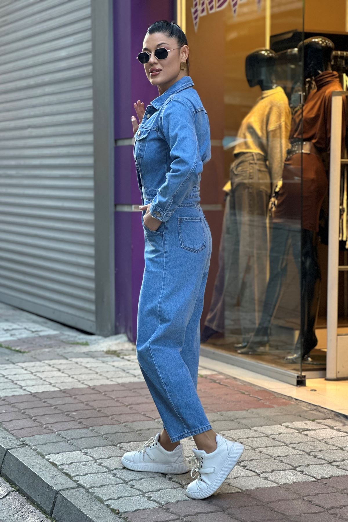 Ön Düğmeli Uzun Kol Kot Tulum-Açık Mavi