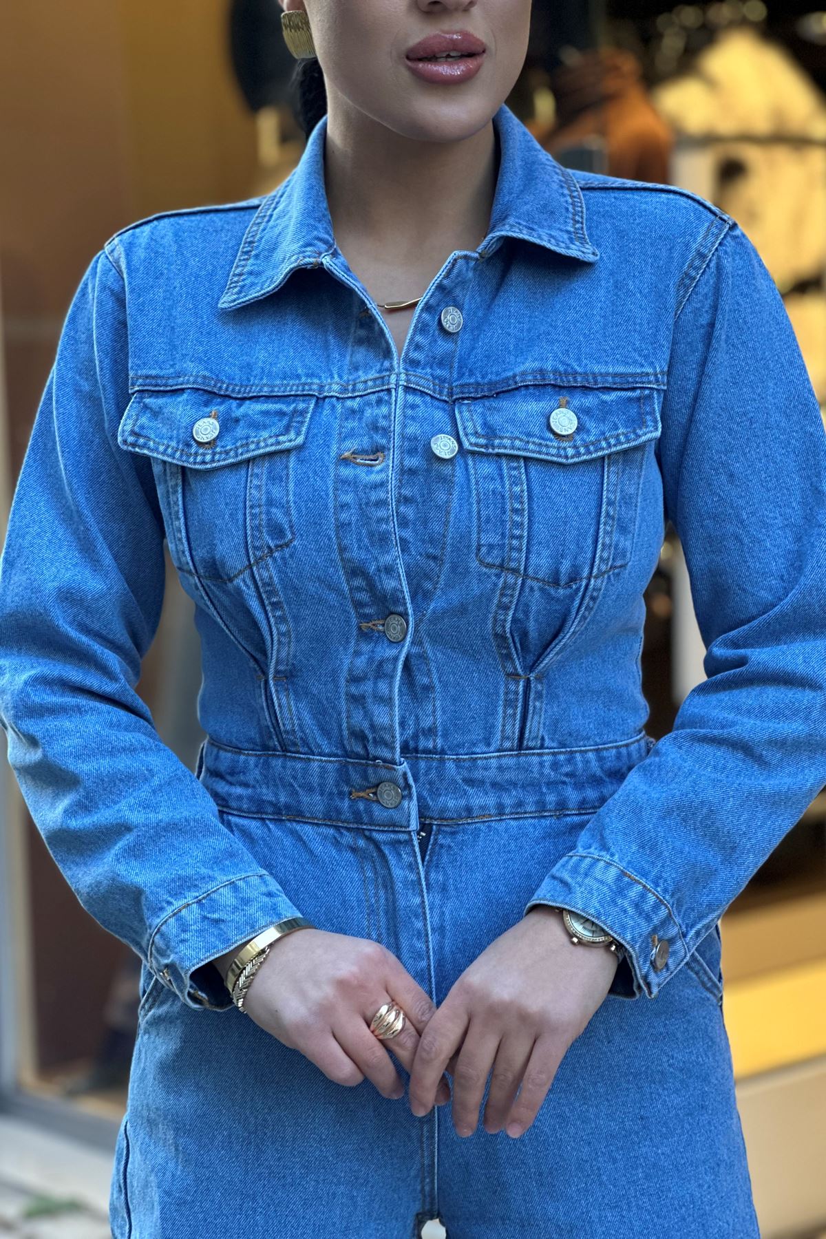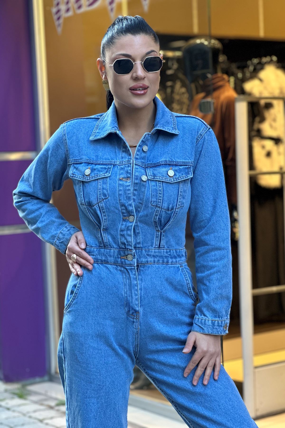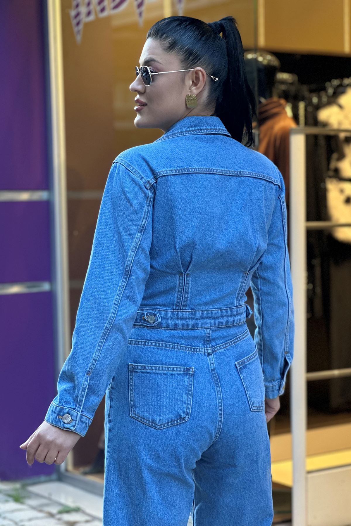 Ön Düğmeli Uzun Kol Kot Tulum-Açık Mavi