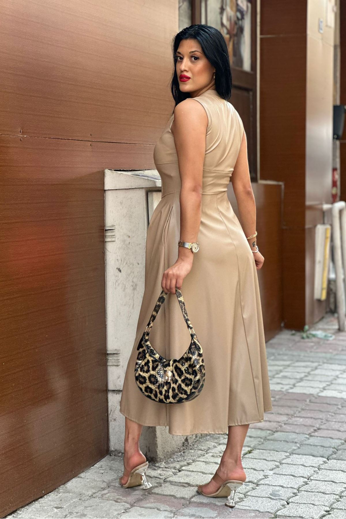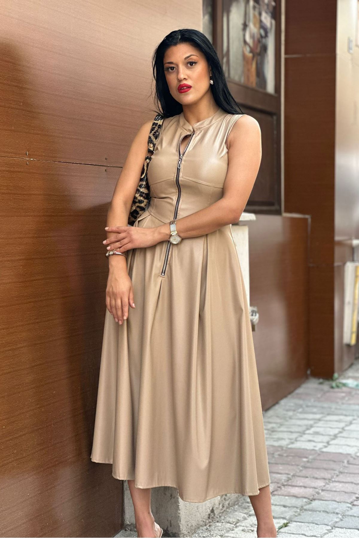 Ön Fermuarlı Midi Boy Deri Elbise-Vizon