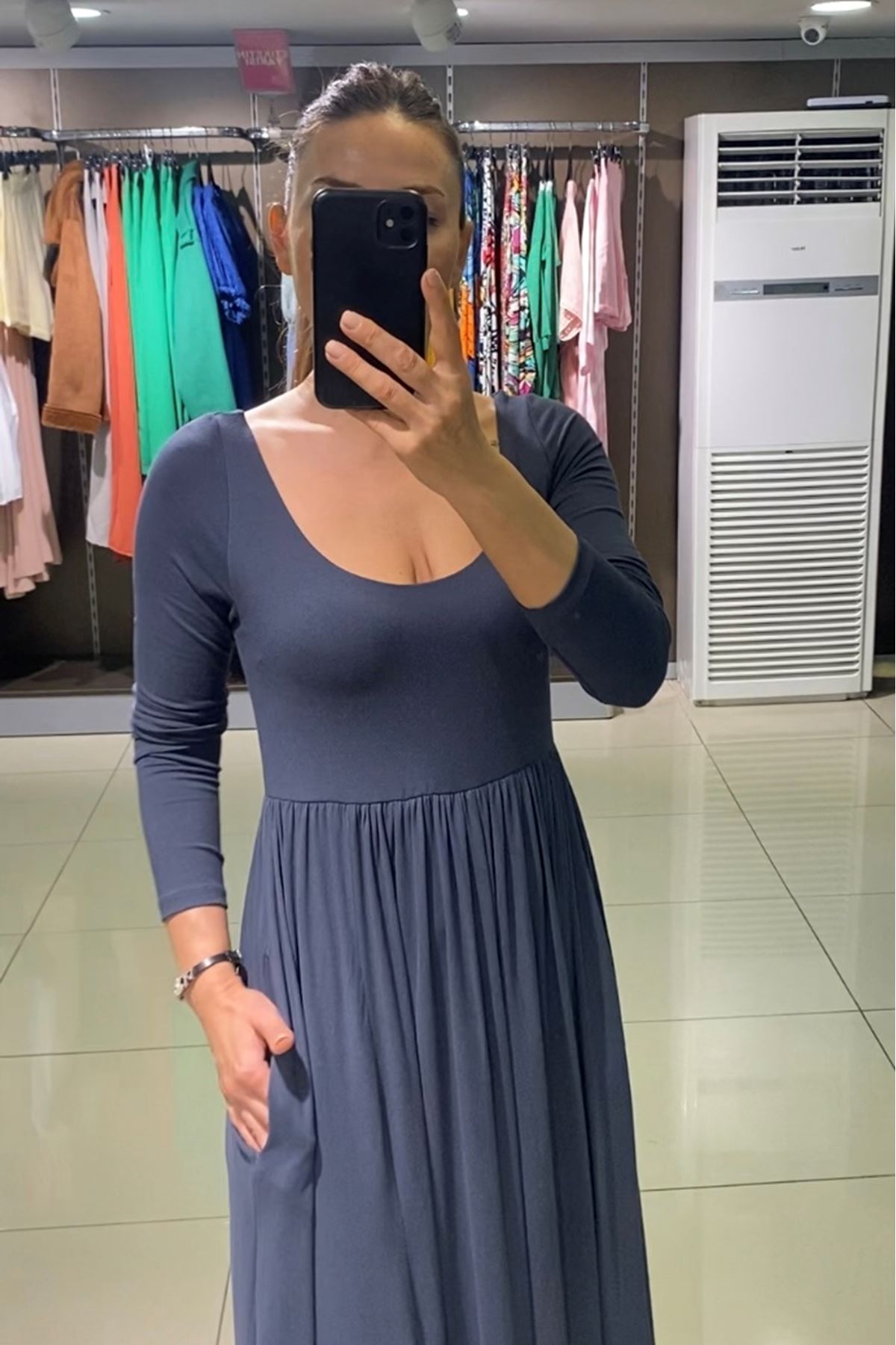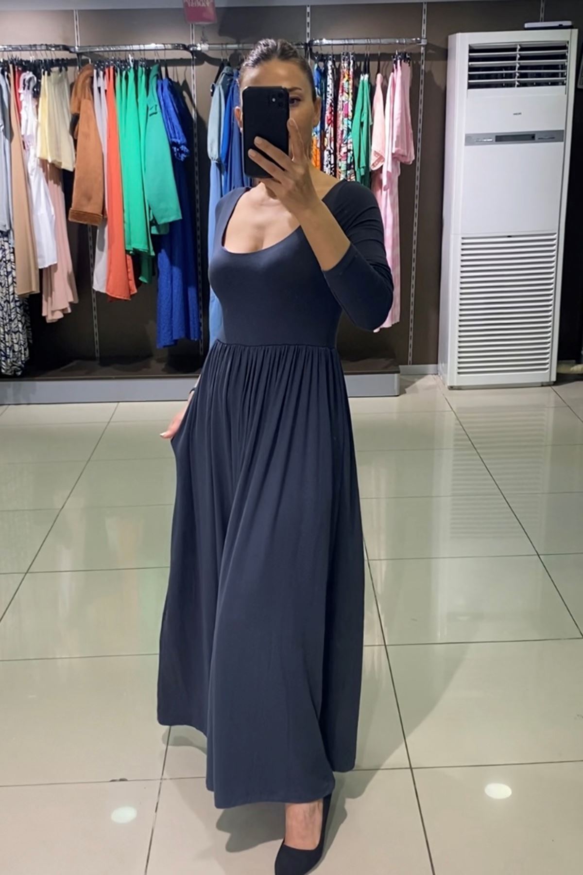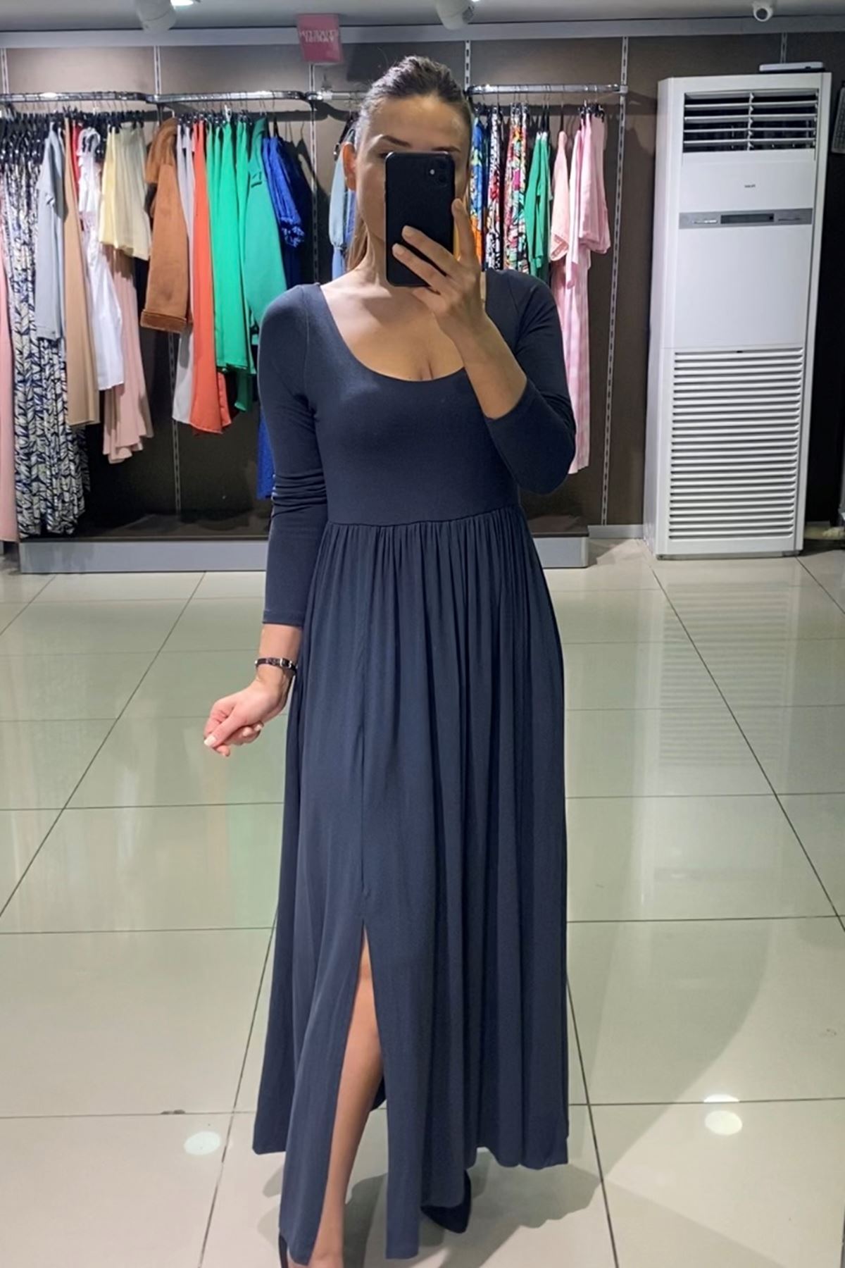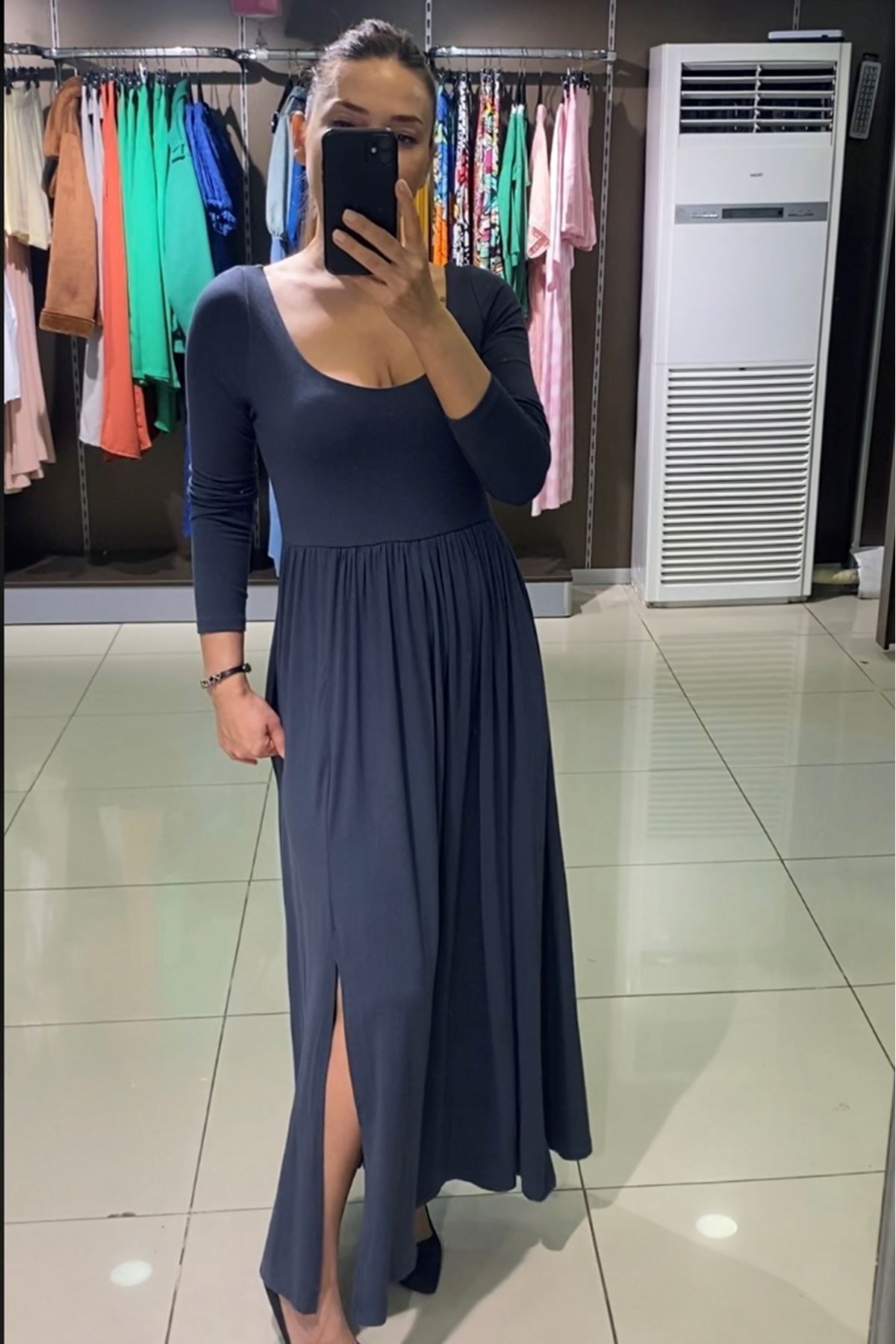 Oval Yaka Yırtmaçlı Midi Boy Elbise-Antrasit