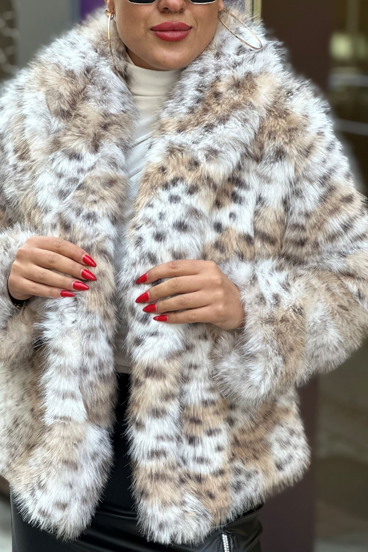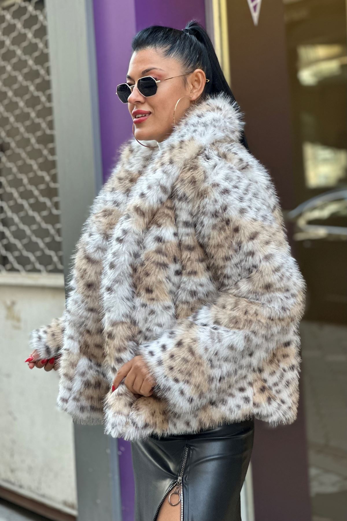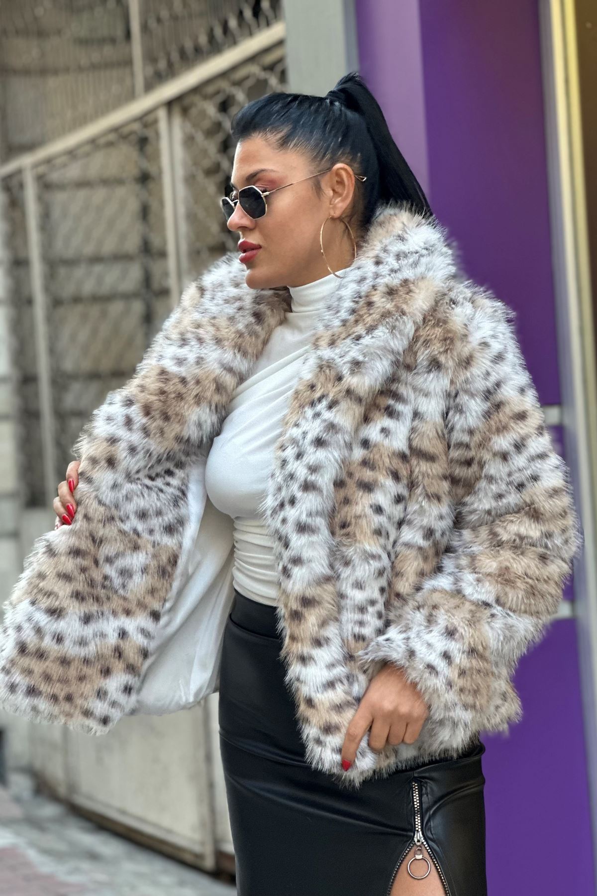 Oversize Görünüm Yakalı Leopar Kürk-Krem