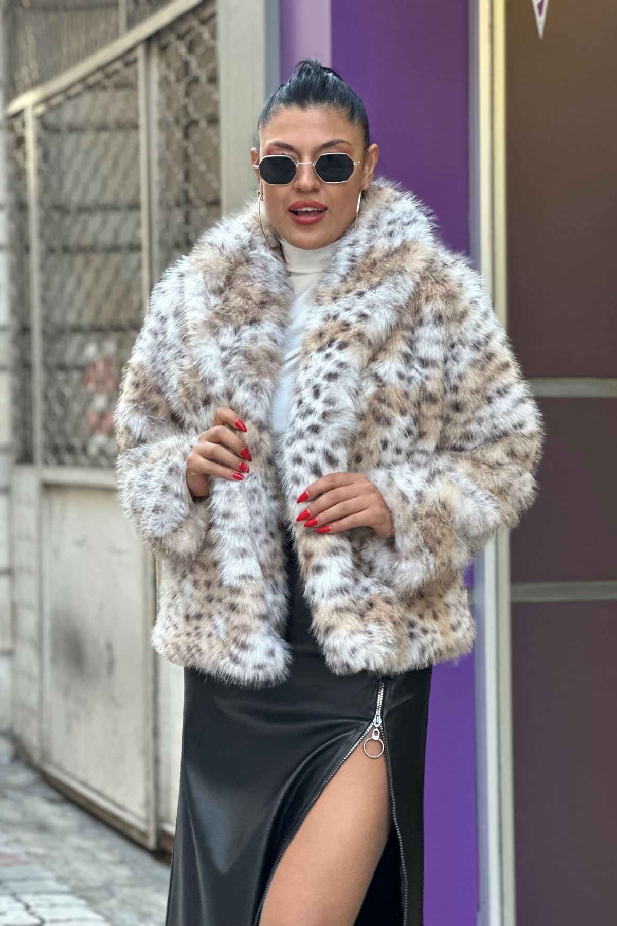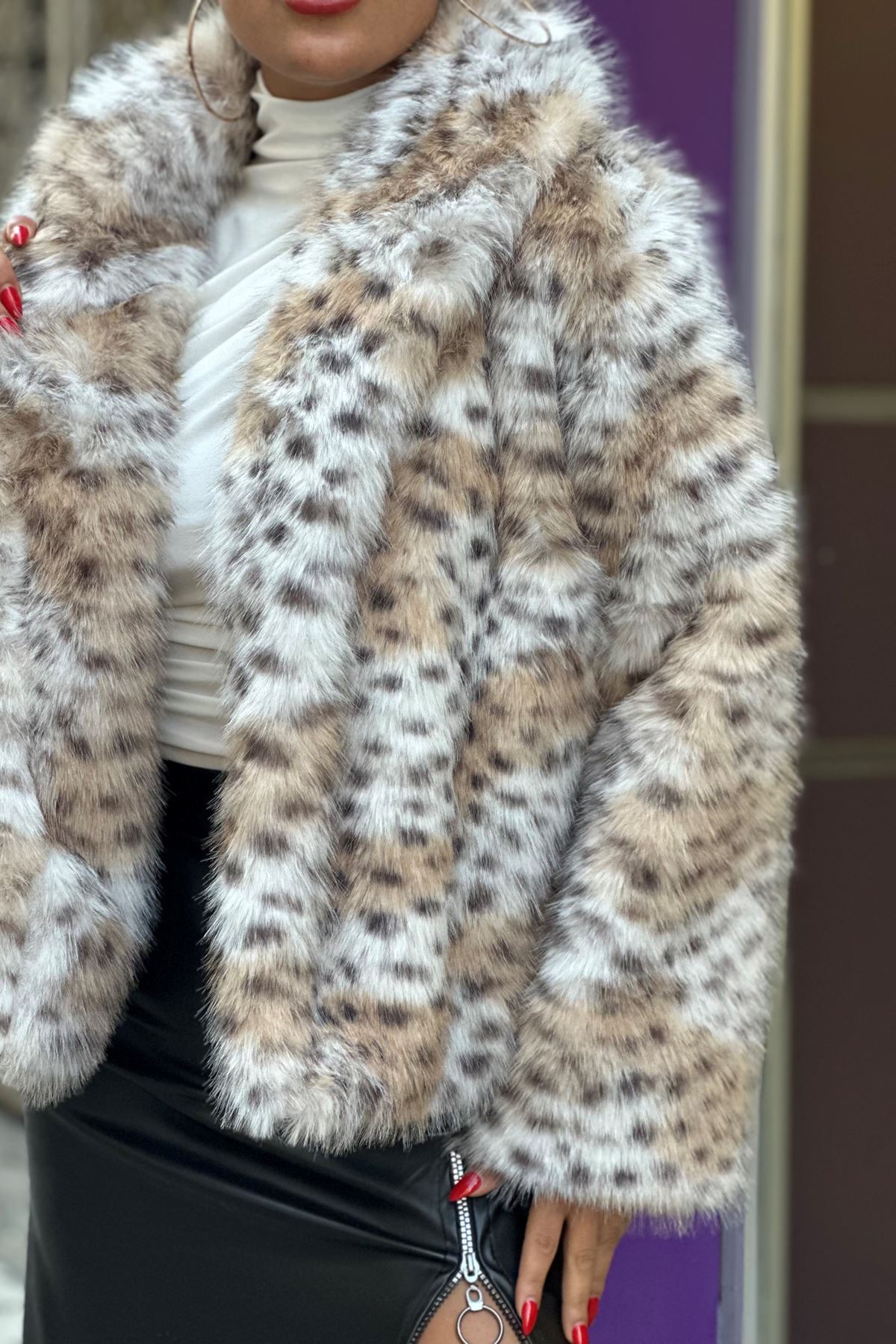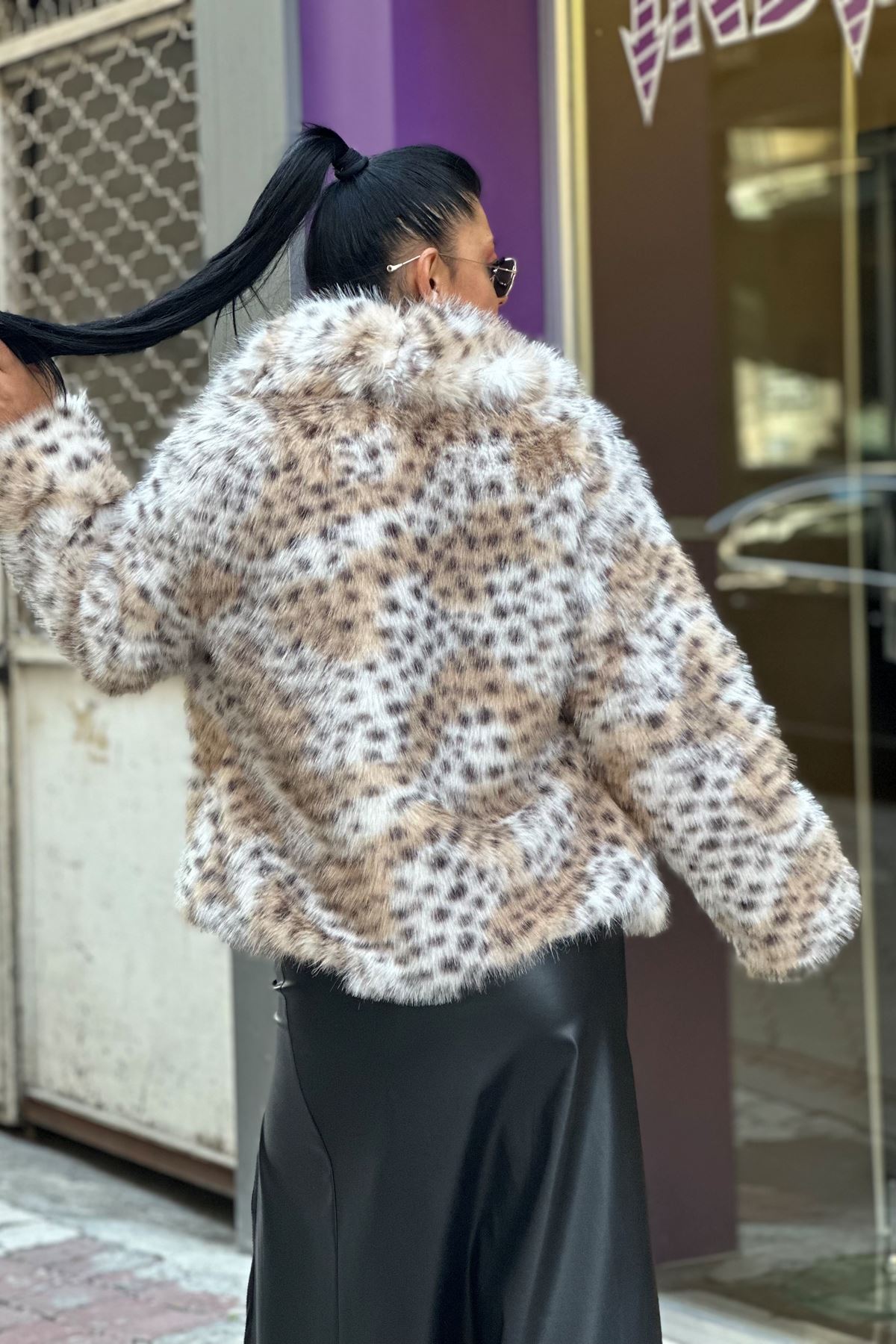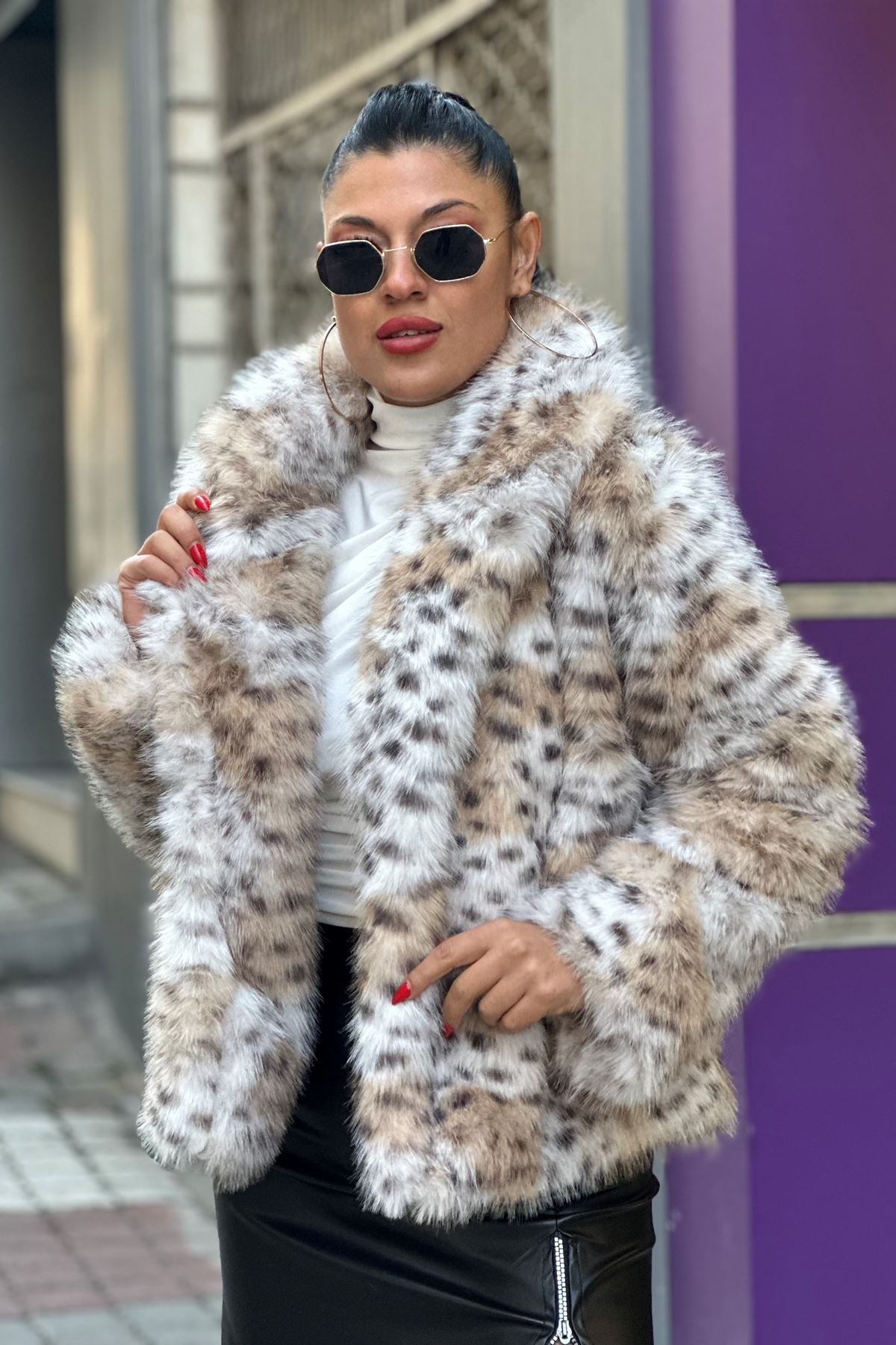 Oversize Görünüm Yakalı Leopar Kürk-Krem