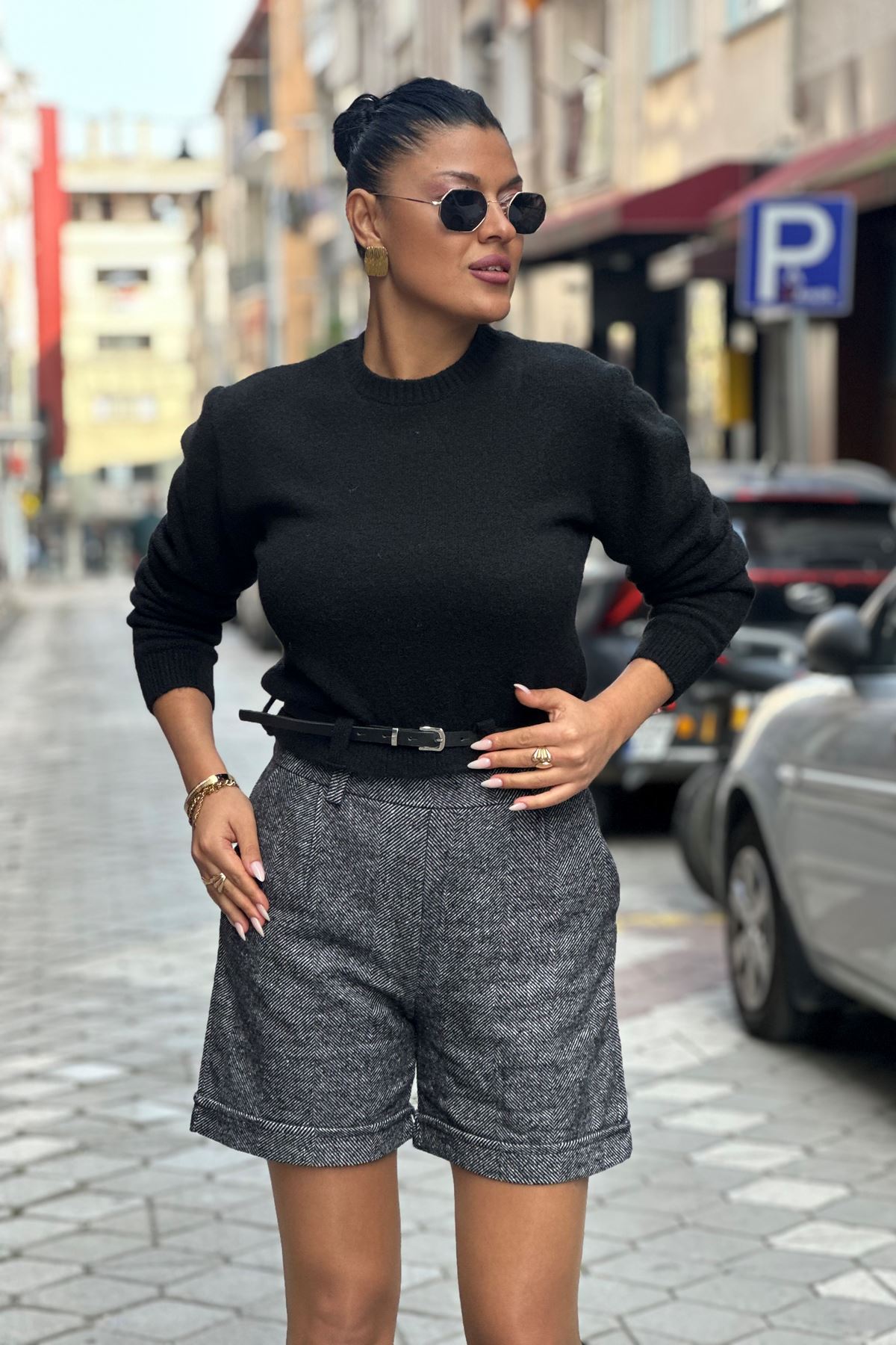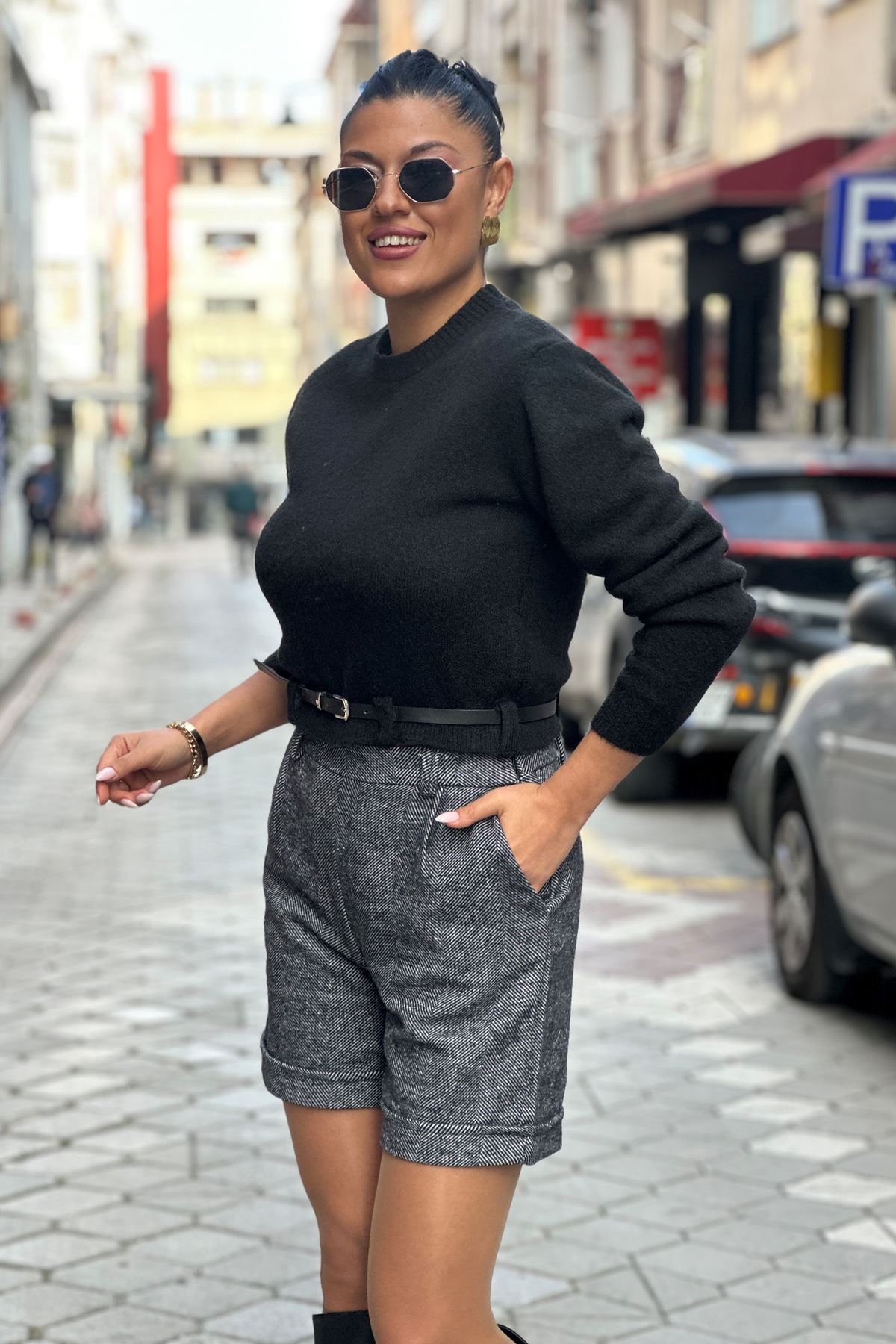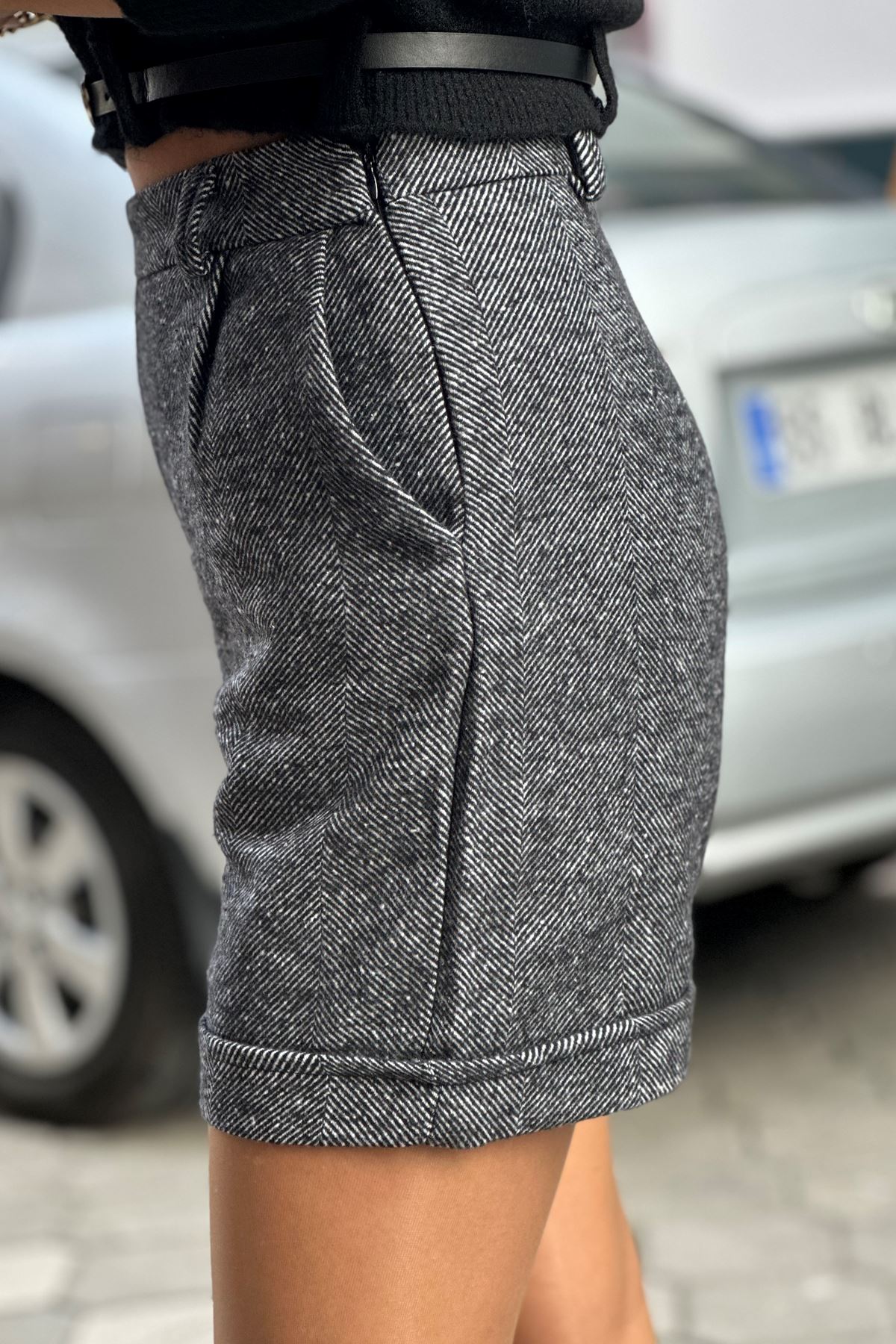 Paçası Katlamalı Yüksek Bel Kaşe Şort-Füme