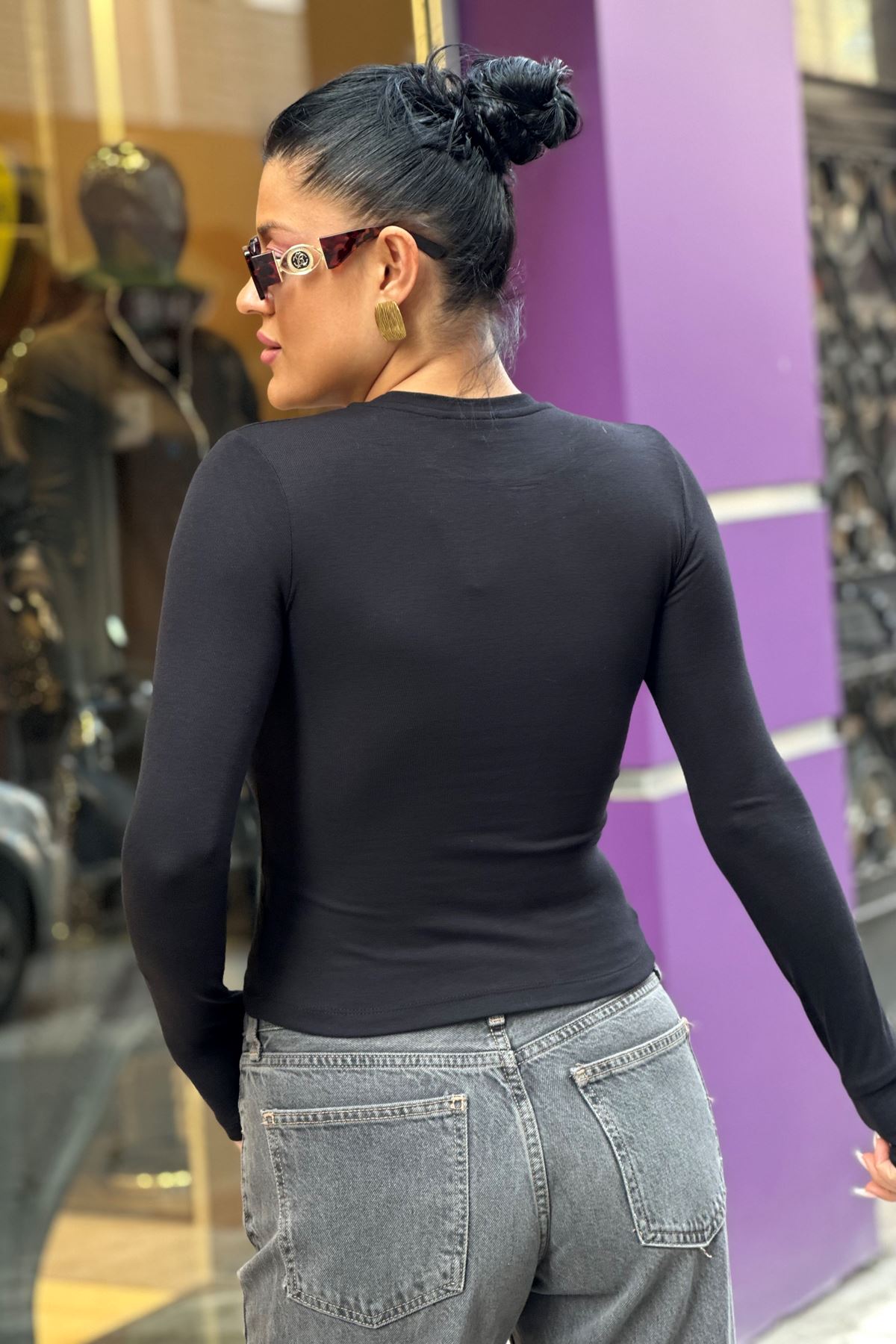 Parmak Geçirmeli Dar Likralı Bluz-Siyah
