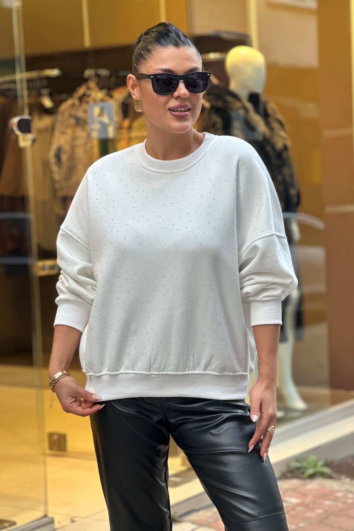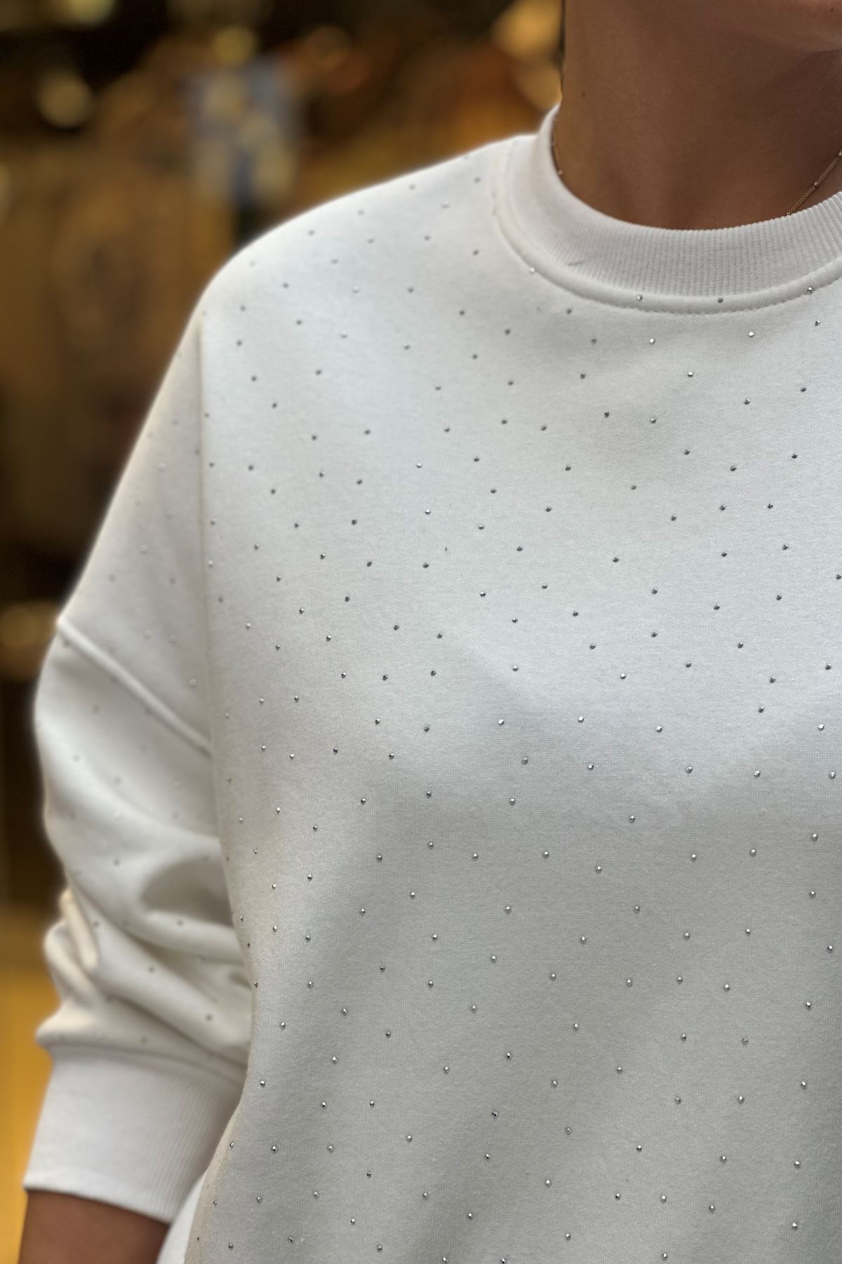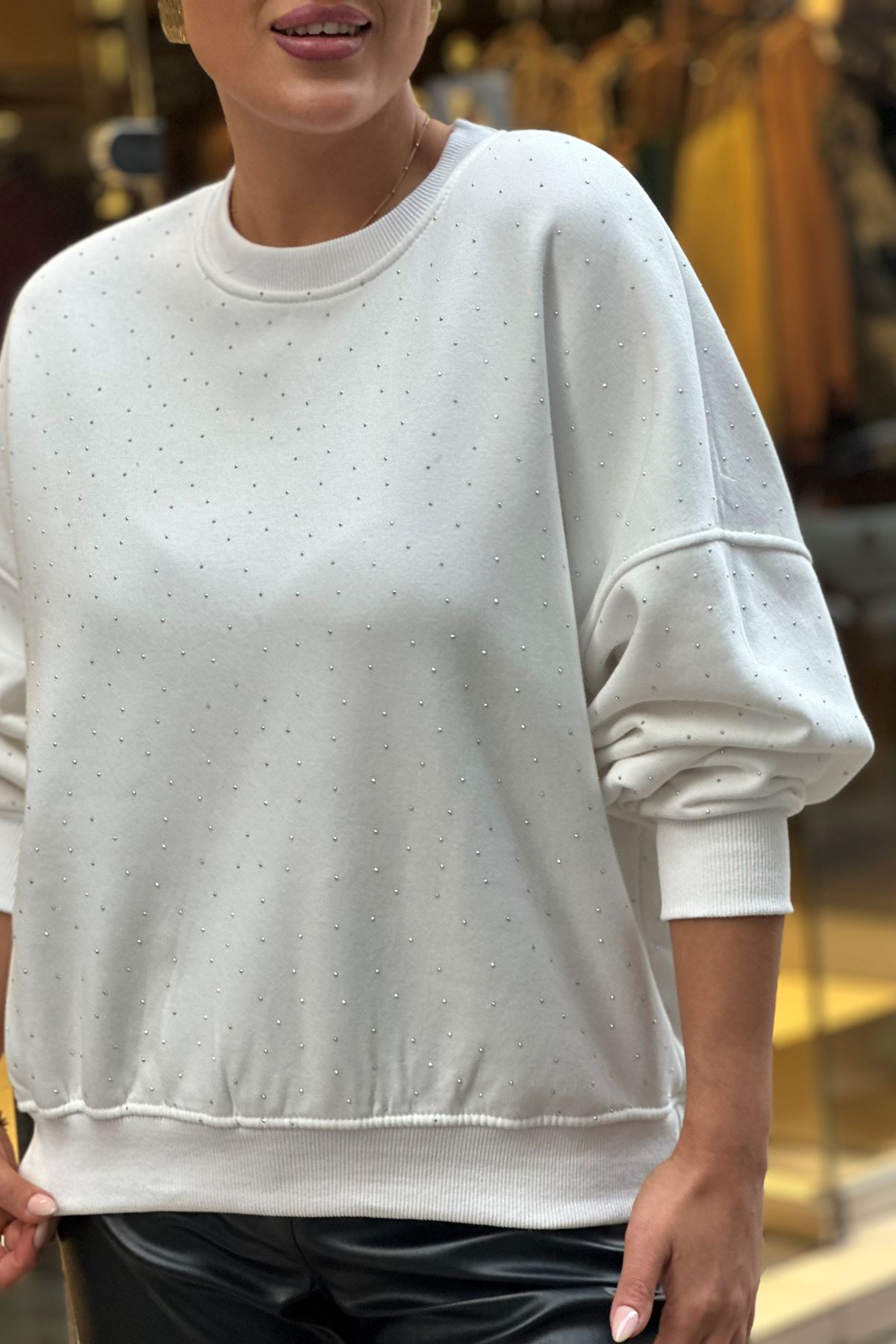 Tamamı Taş Üç İplik Şardonlu Sweatshirt-Beyaz