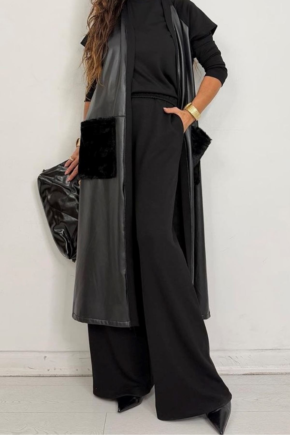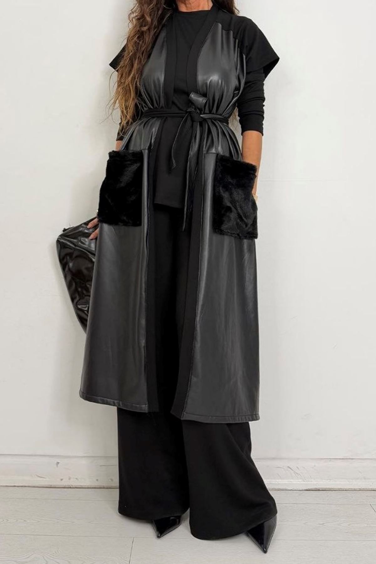 Uzun Deri Yelekli Üçlü Takım-Siyah