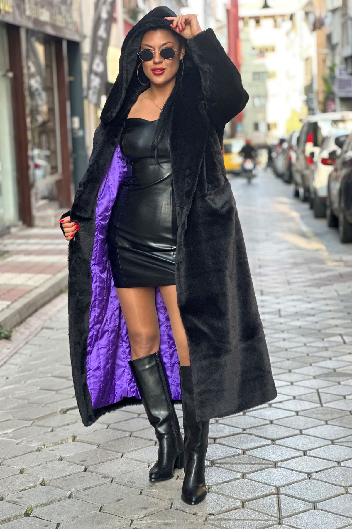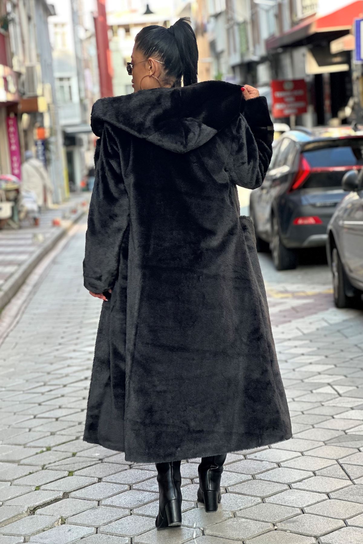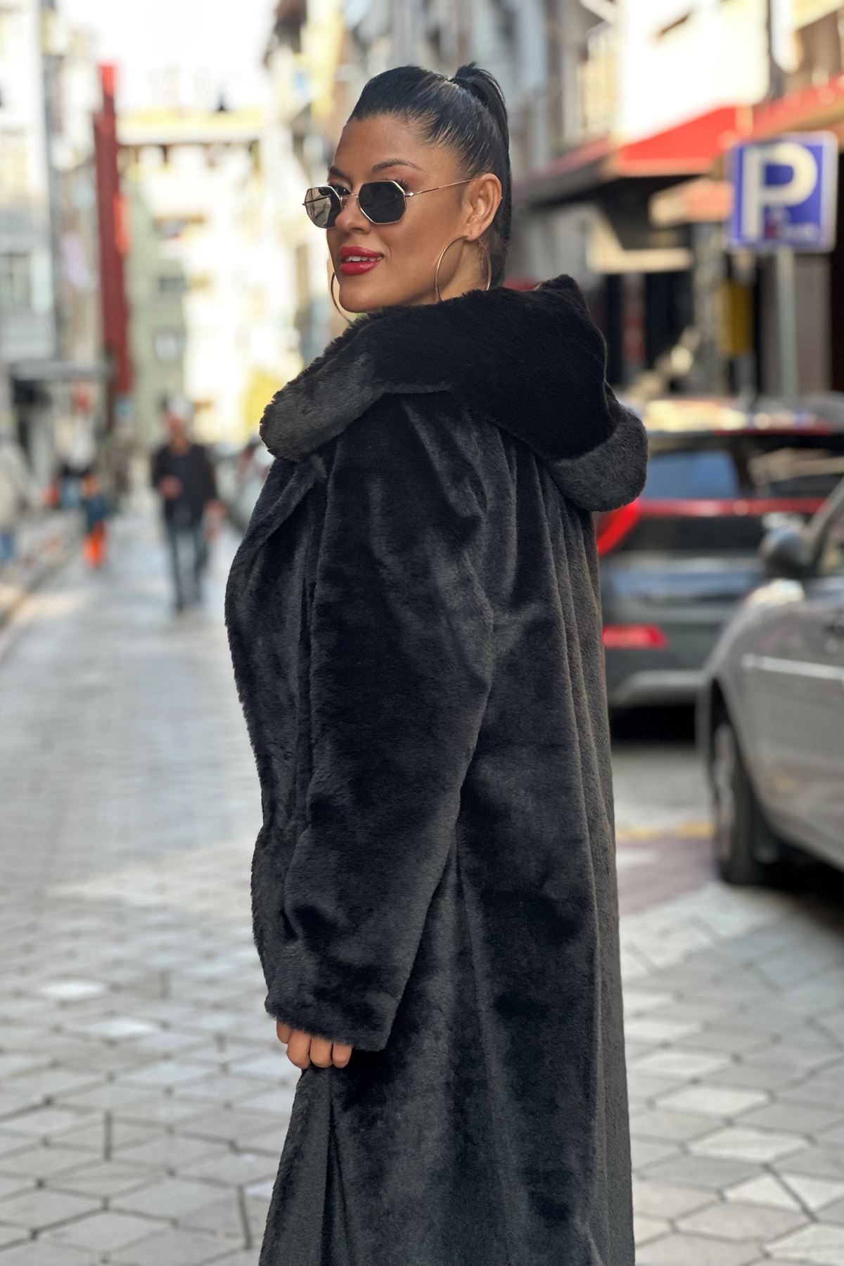 Kapşonlu Uzun İthal Kürk Kaban-Siyah