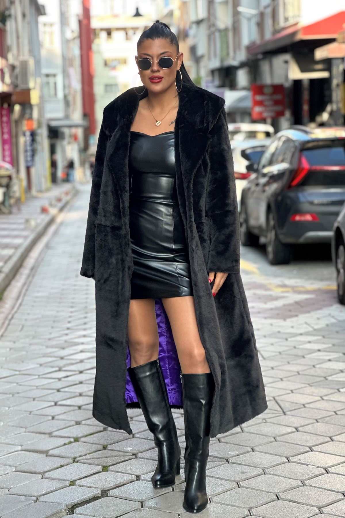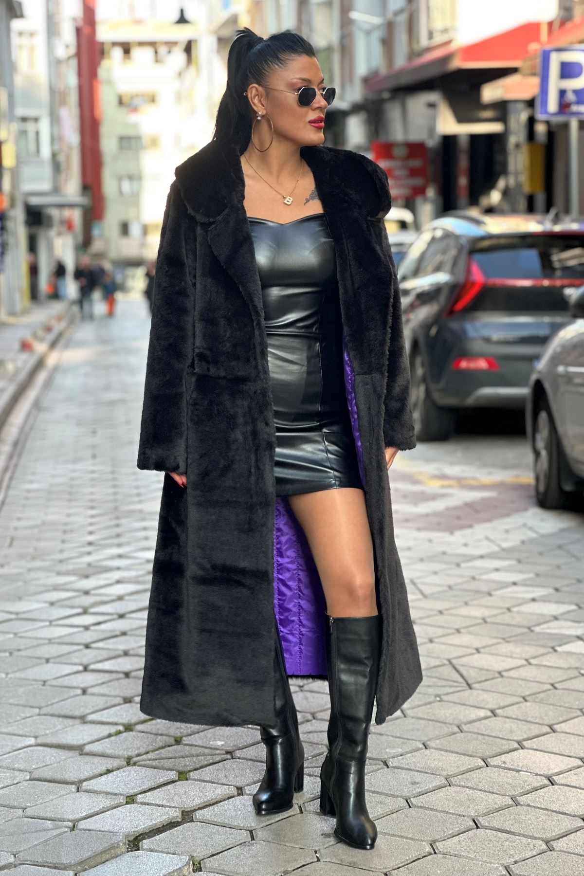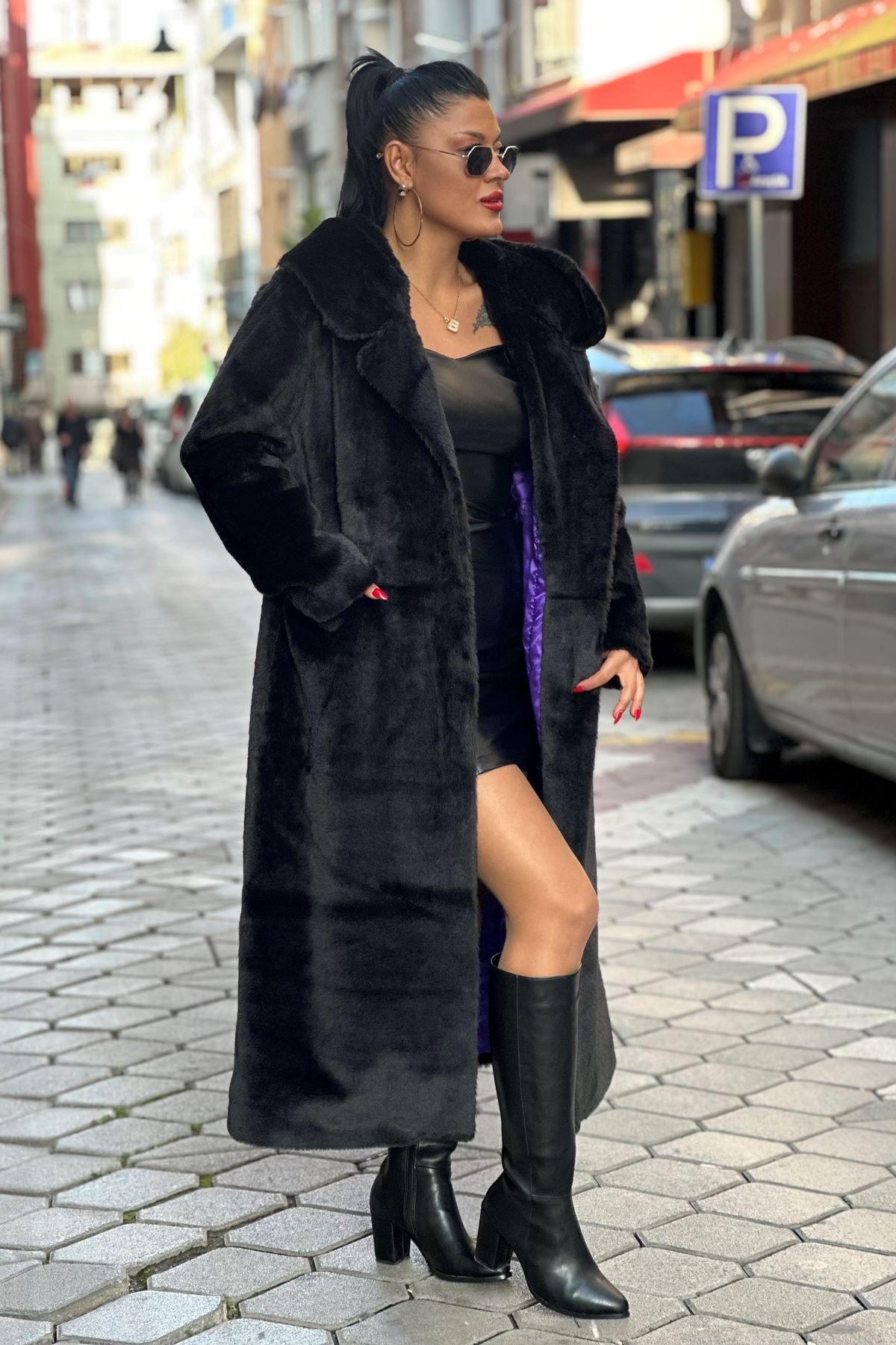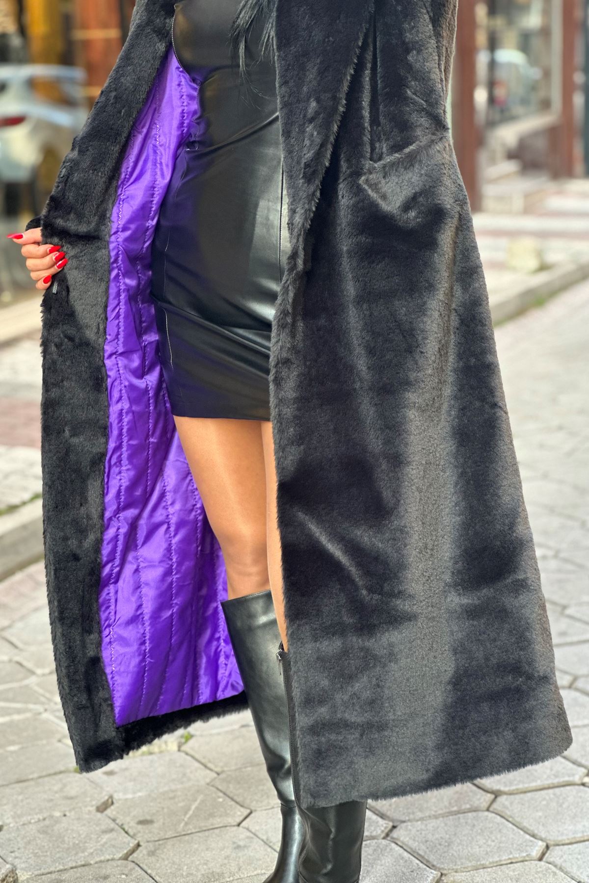 Kapşonlu Uzun İthal Kürk Kaban-Siyah