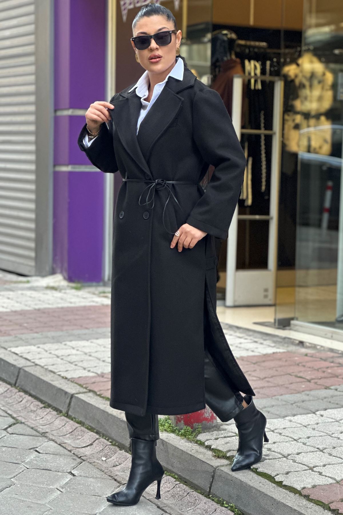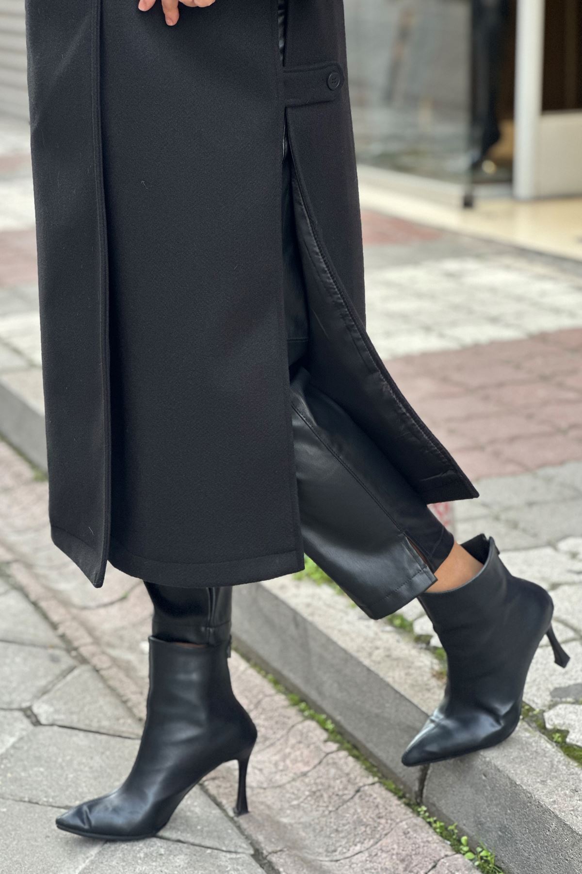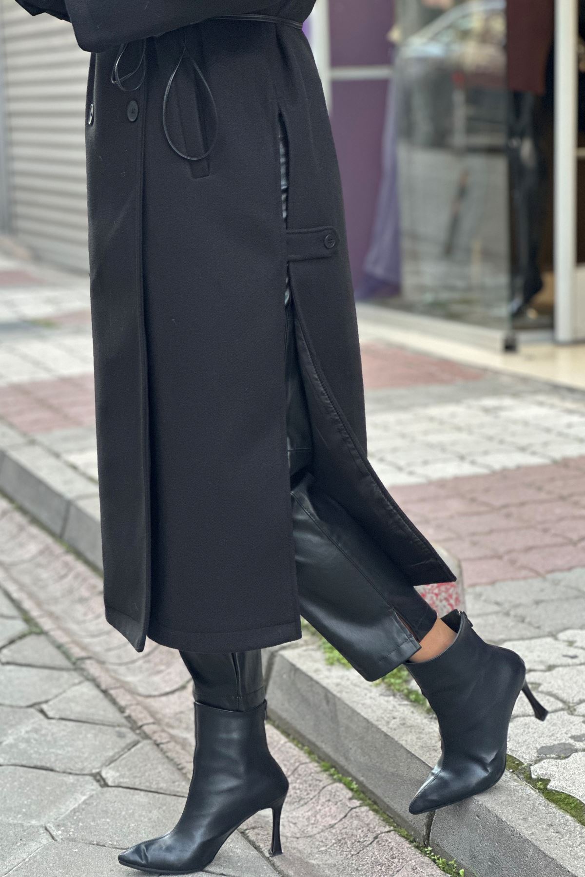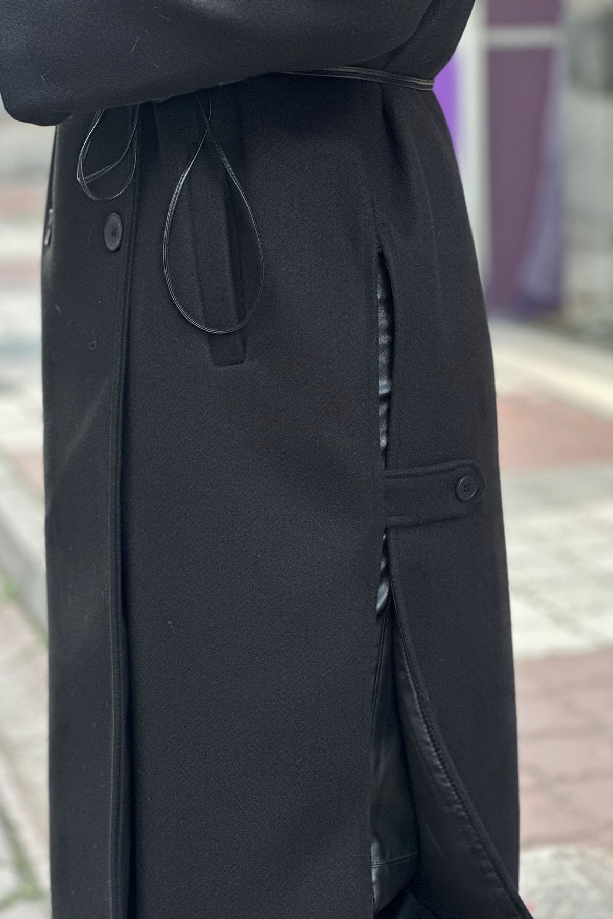 Uzun Yandan Yırtmaçlı Deri Kemerli Kaşe Kaban-Siyah