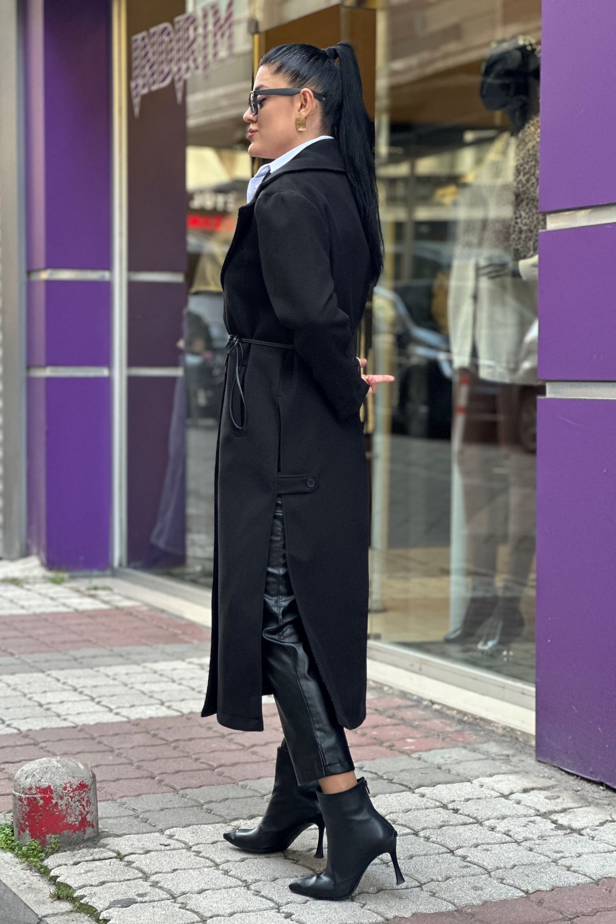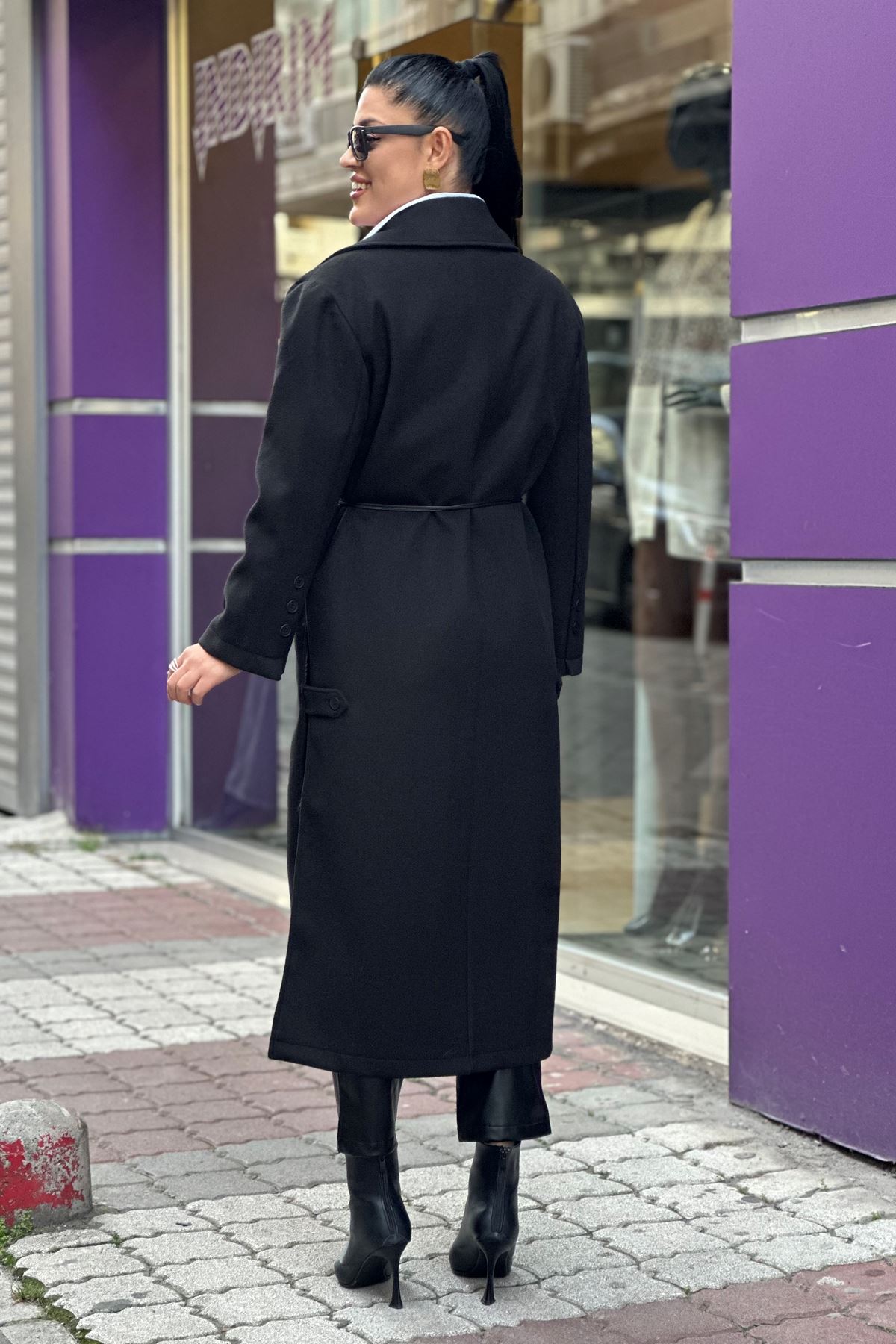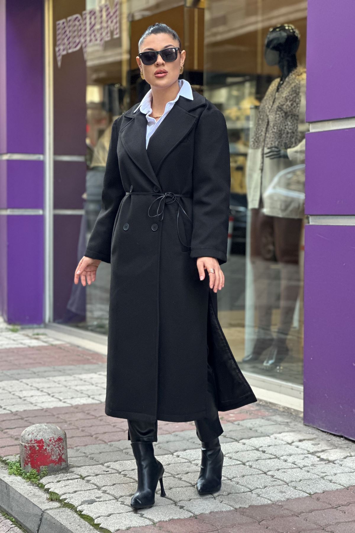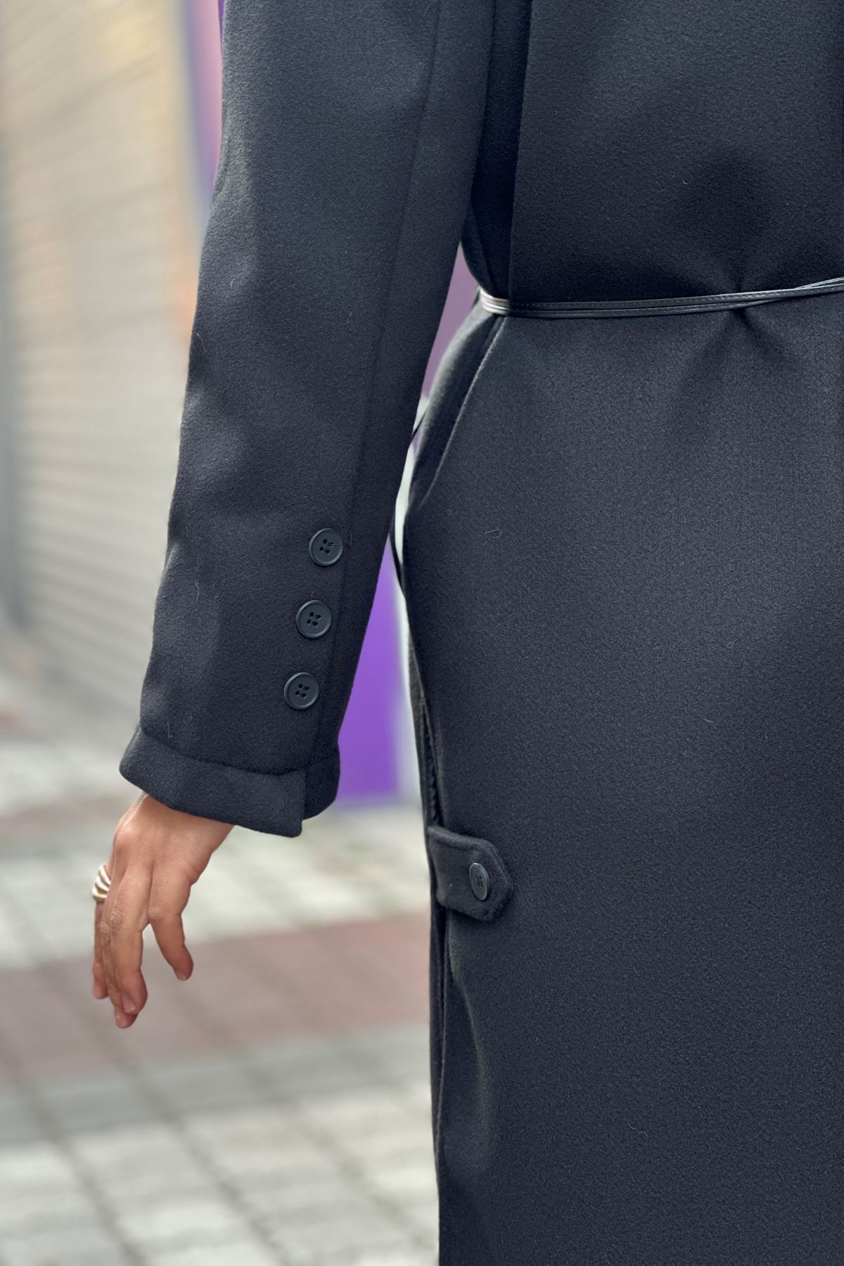 Uzun Yandan Yırtmaçlı Deri Kemerli Kaşe Kaban-Siyah