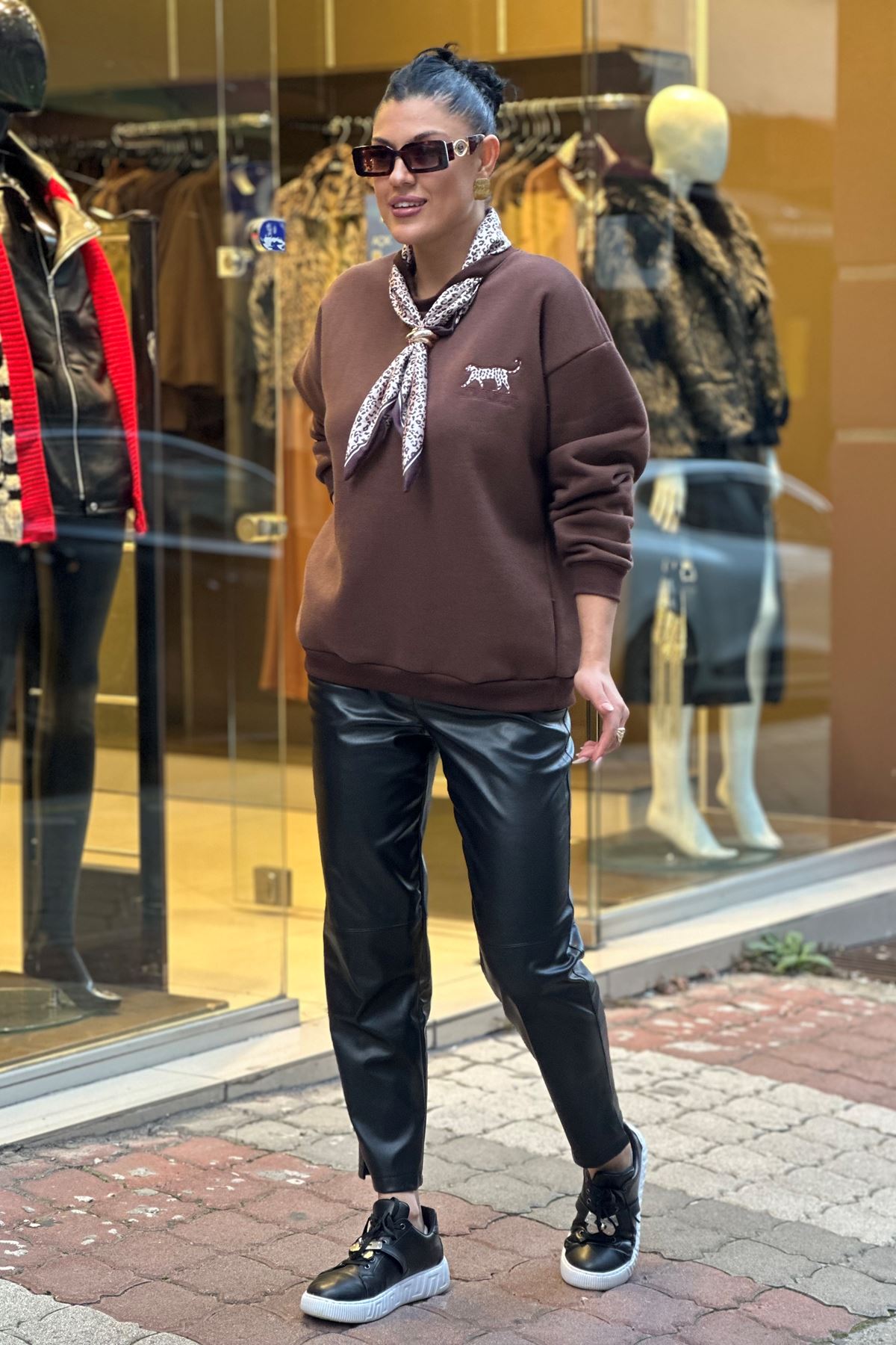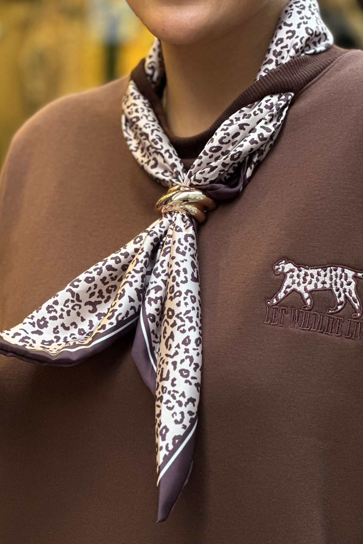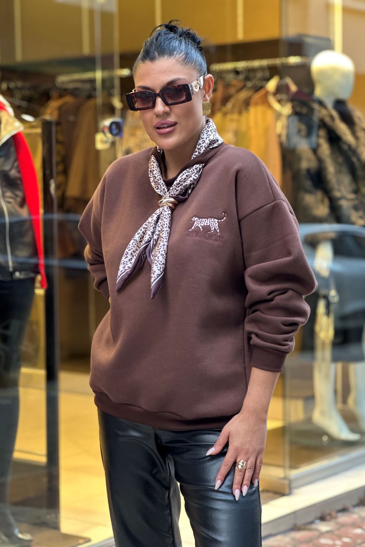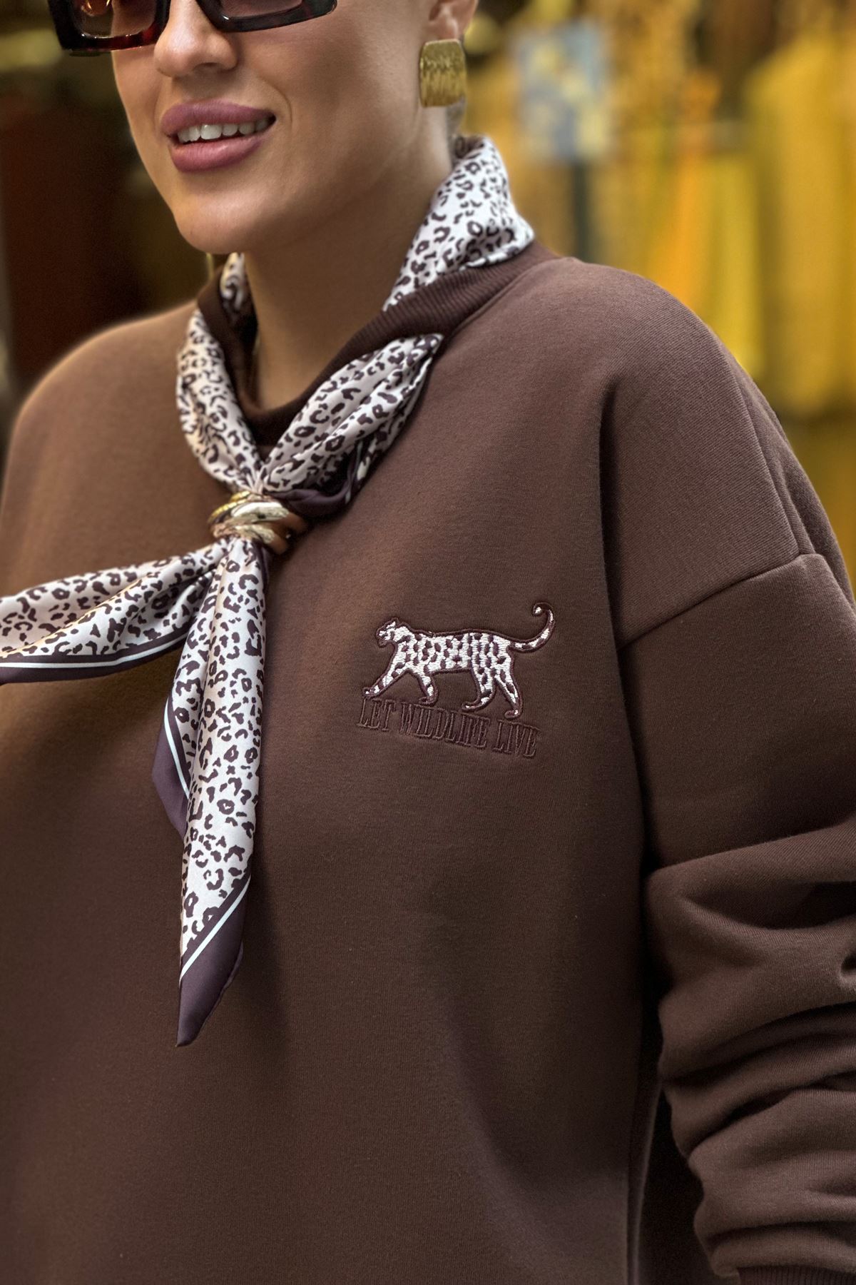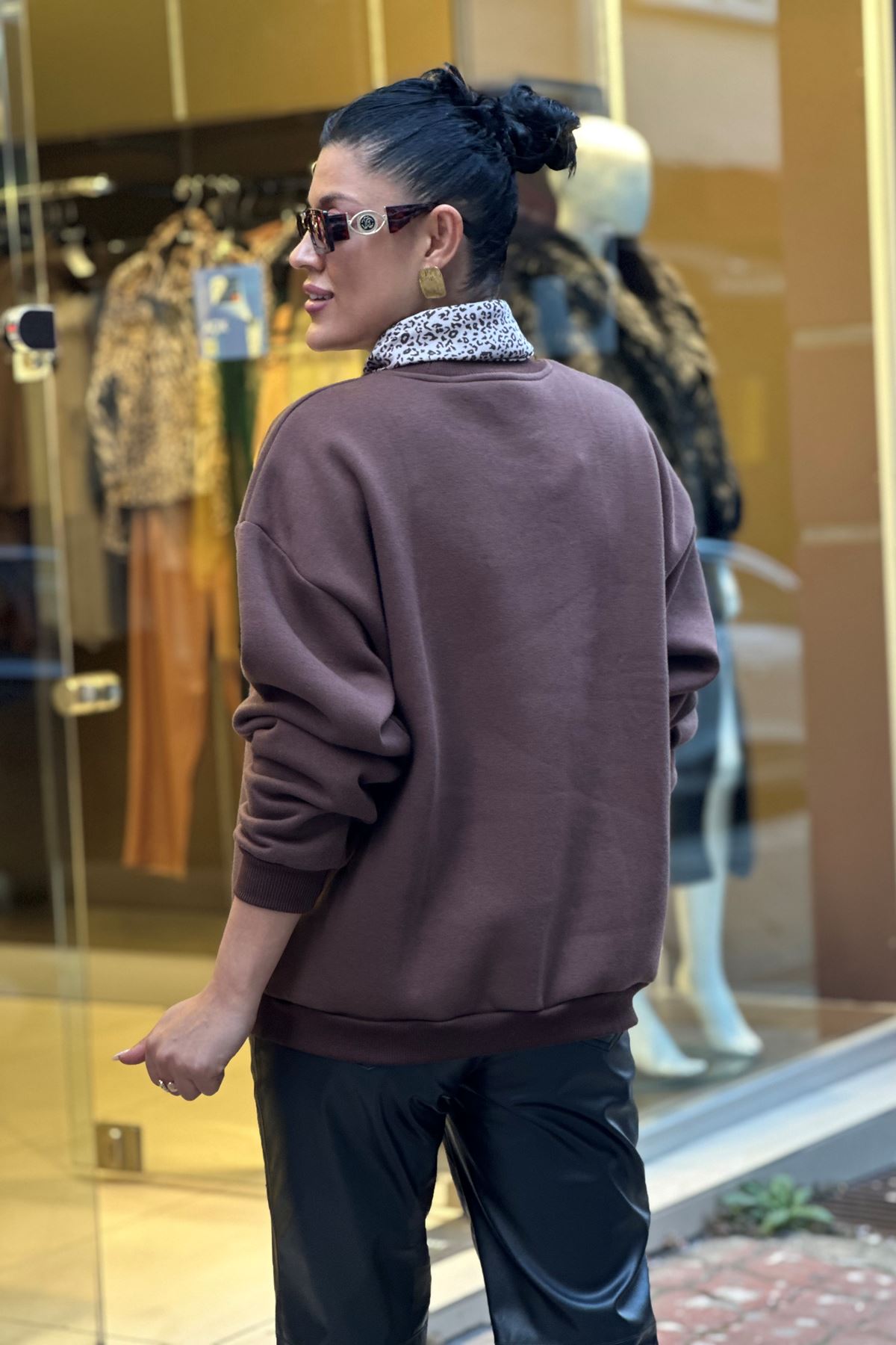 Yaka Fular Detay Üç İplik Şardonlu Sweatshirt-Kahve