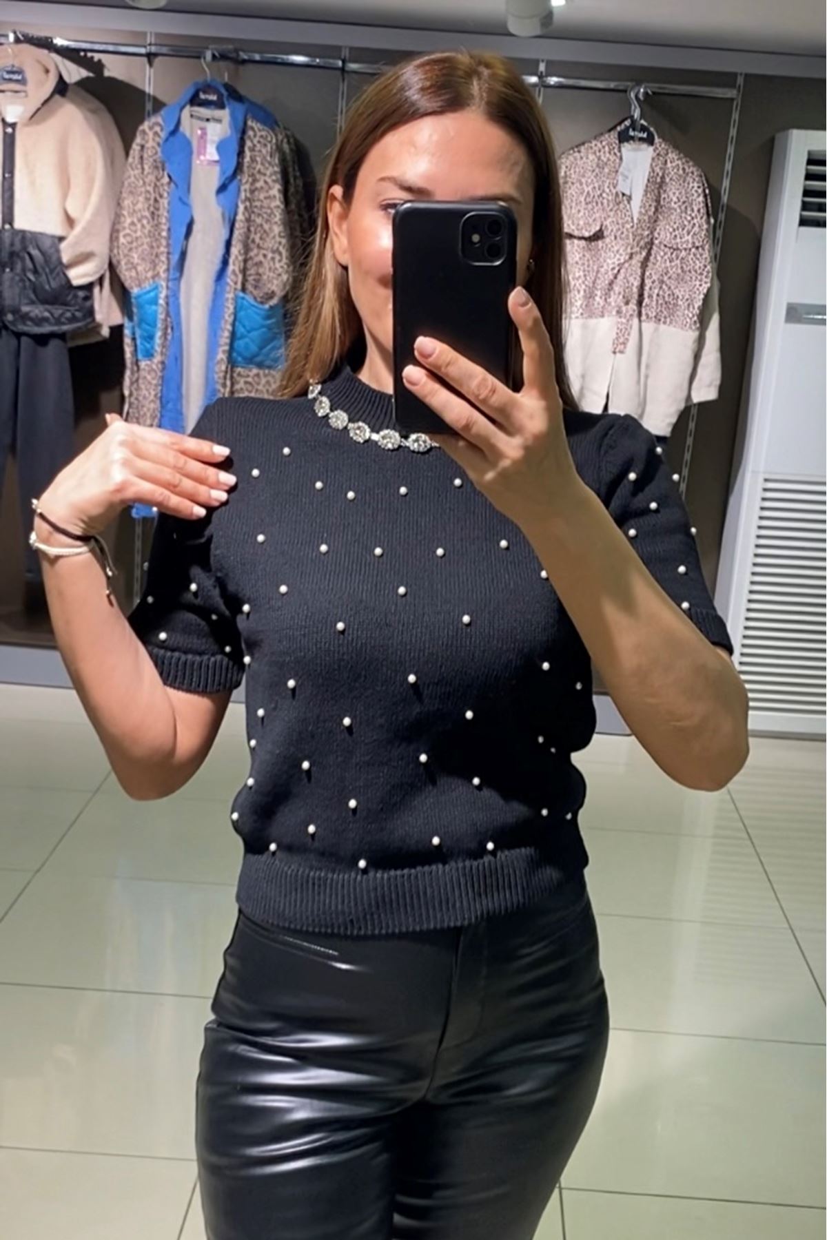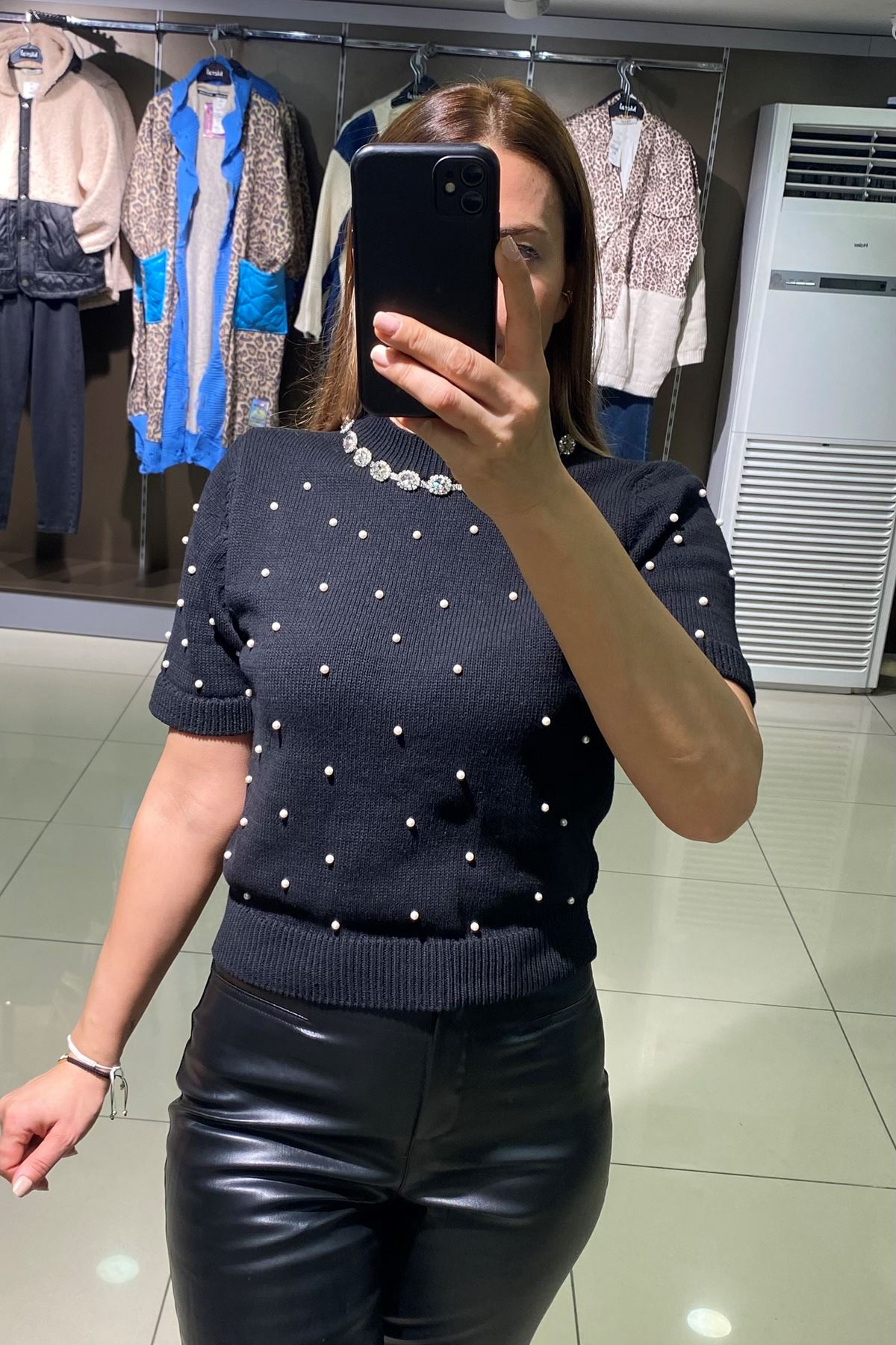 Yaka Kolye Taş Detay Tamamı İnci Kazak-Siyah