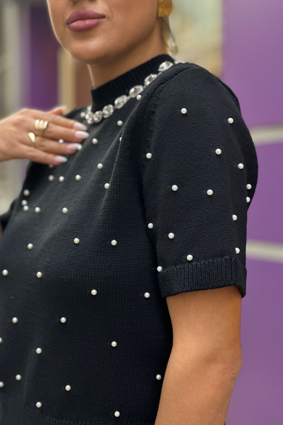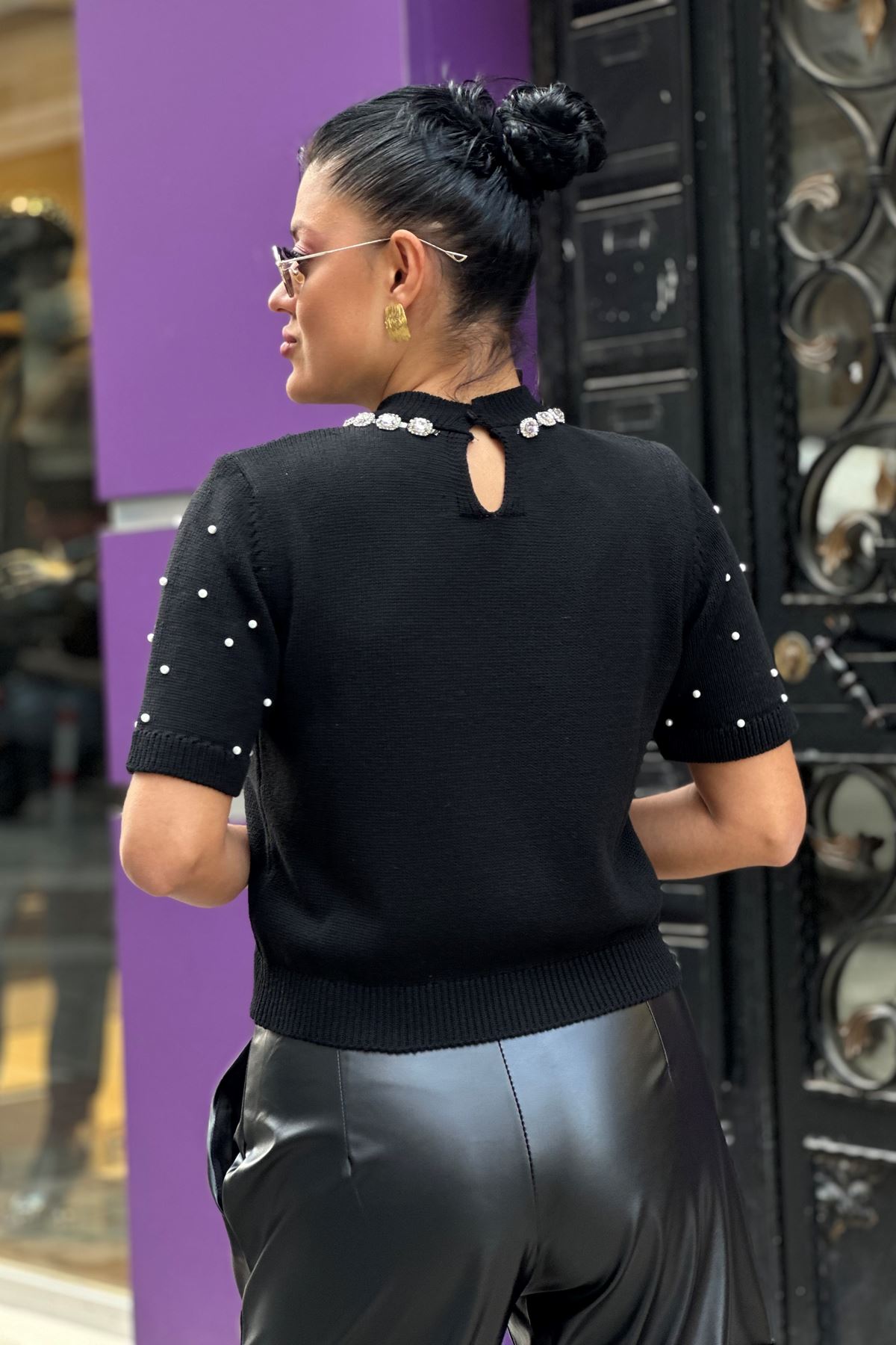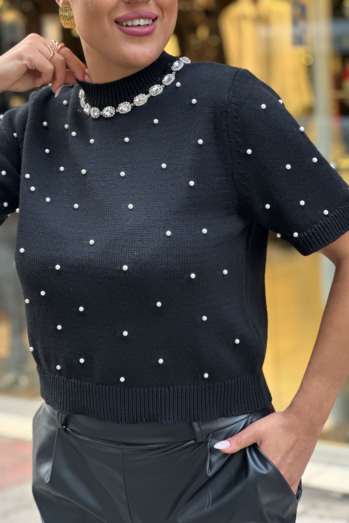Yaka Kolye Taş Detay Tamamı İnci Kazak-Siyah