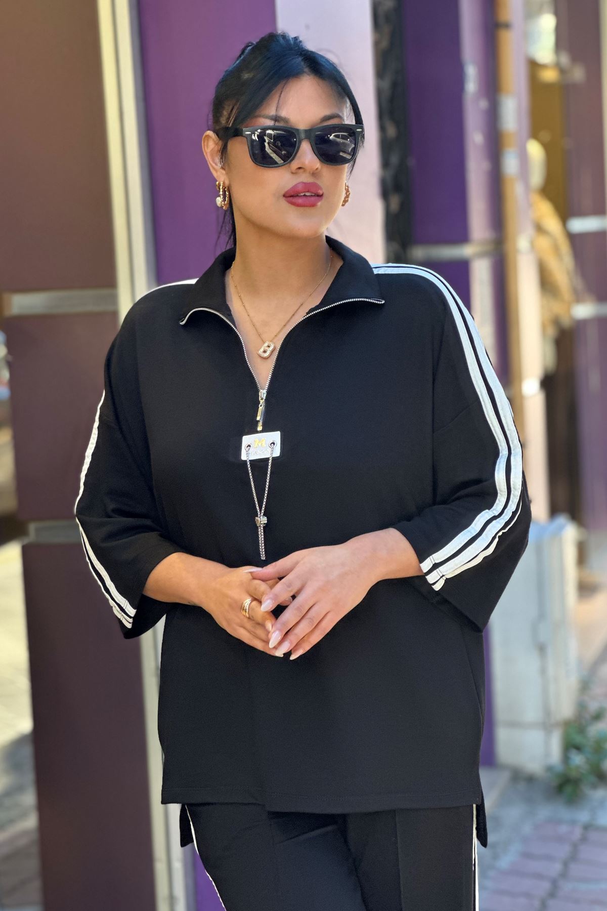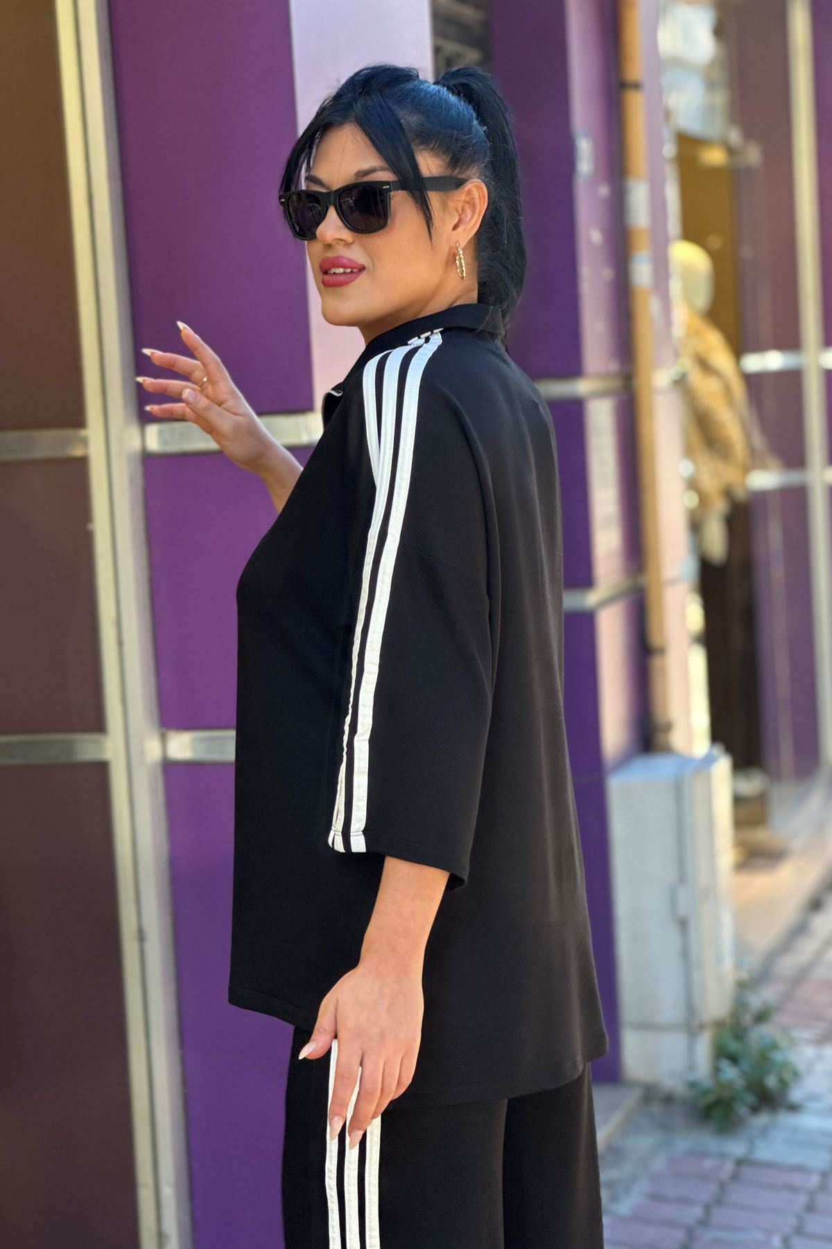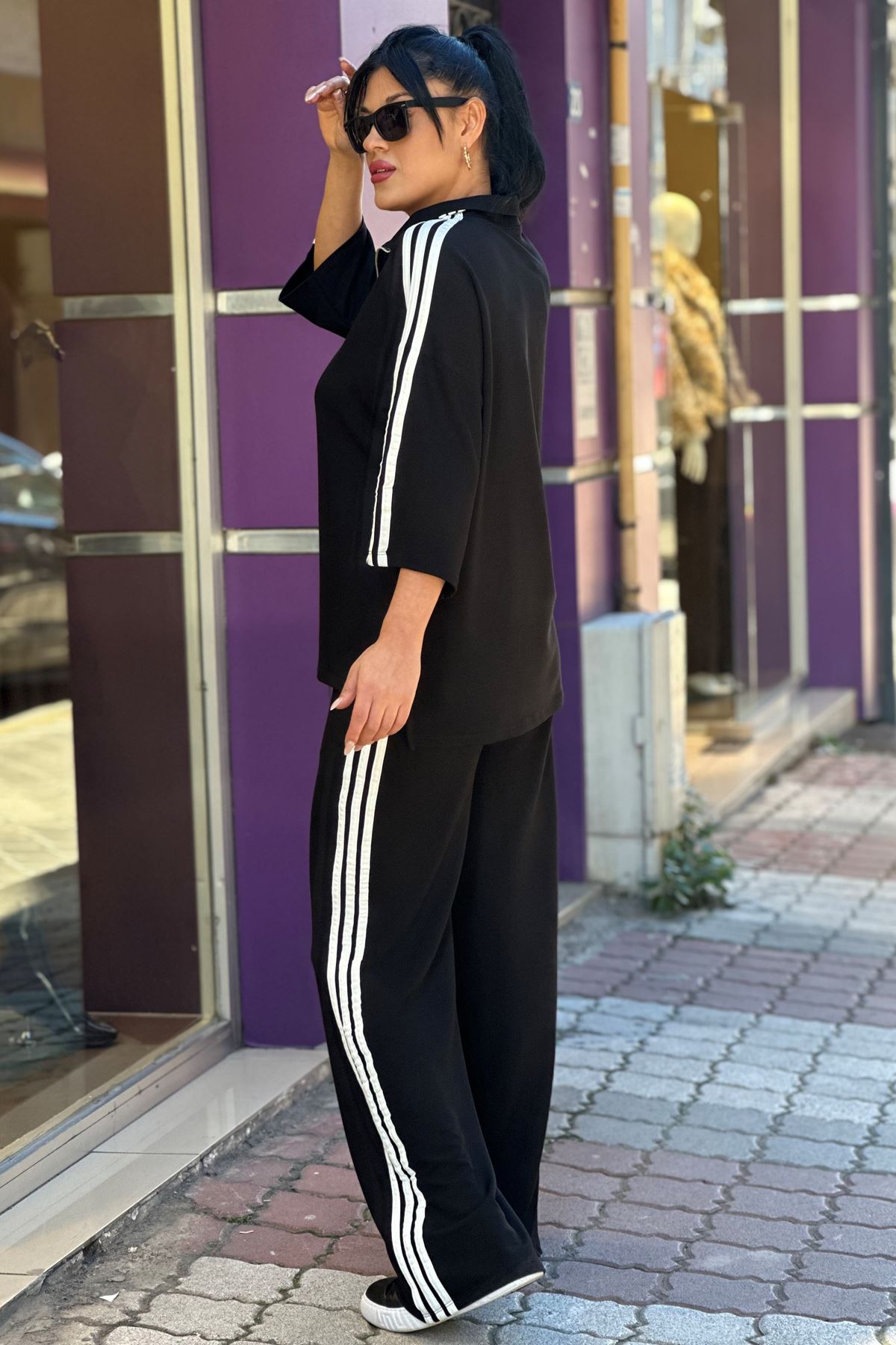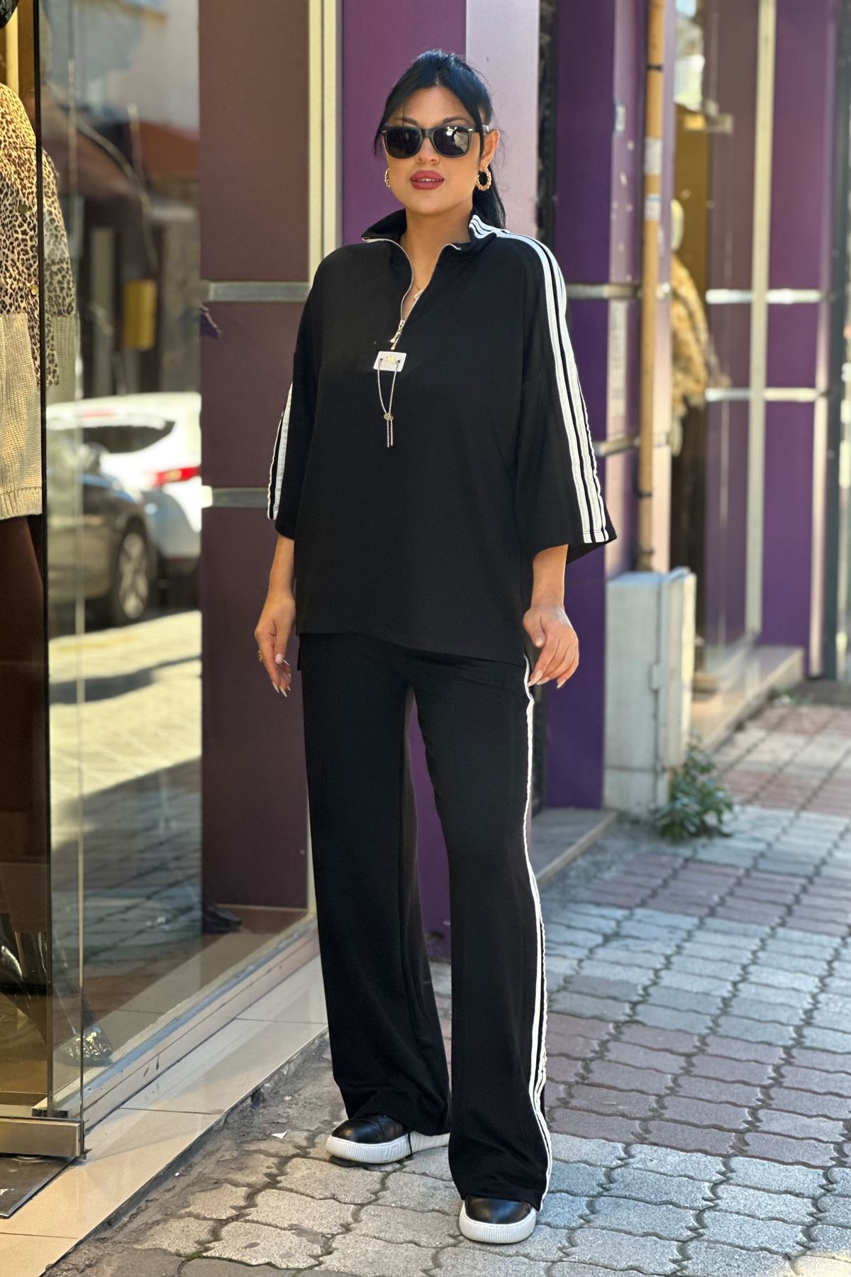Yaka Zincir Detay Çizgili İkili Takım-Siyah
